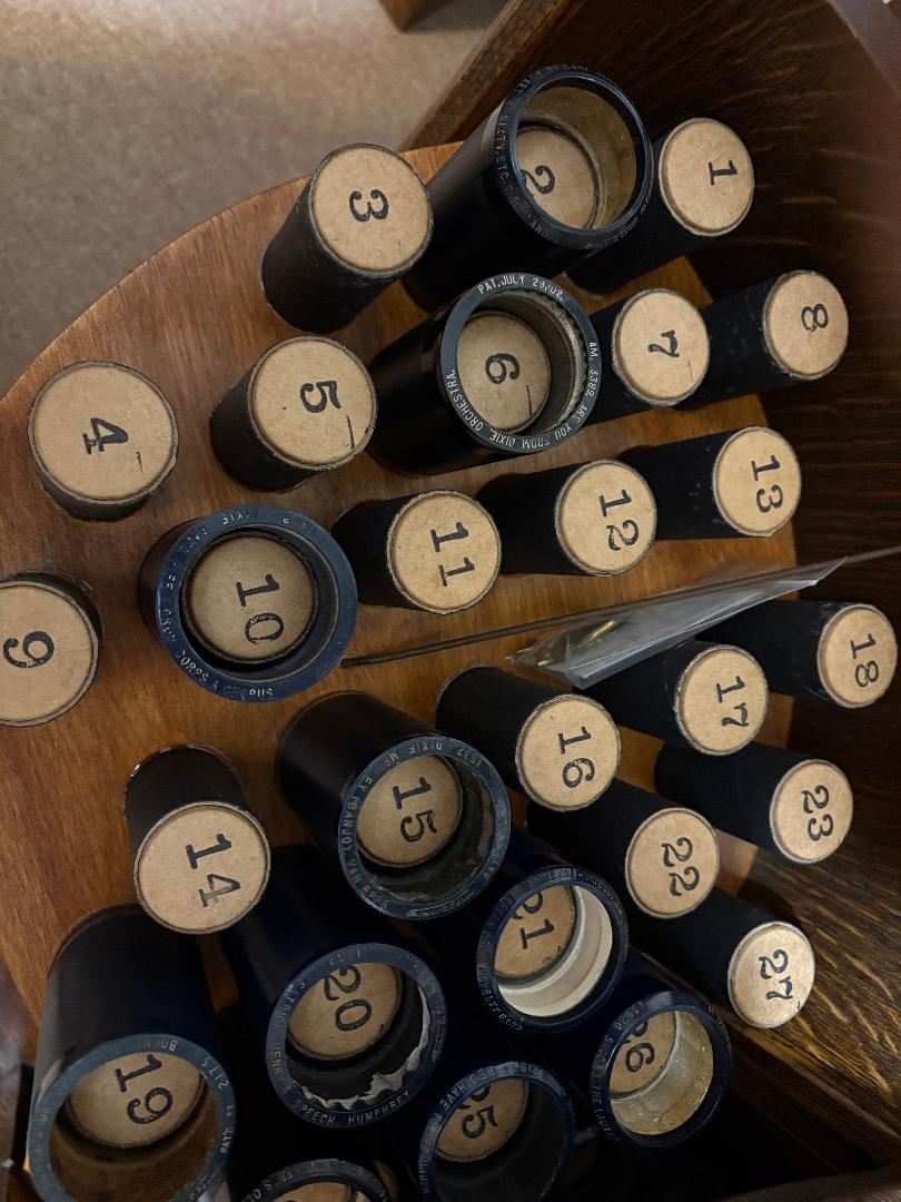 A couple of thoughts. First, not all cabinet peg tops were numbered. From surviving examples, Herzog cabinets seemed to have been stamped with just the number. Several dealers, and probably cabinet makers, made circular paper labels with numbers on them that were glued to the peg top.
