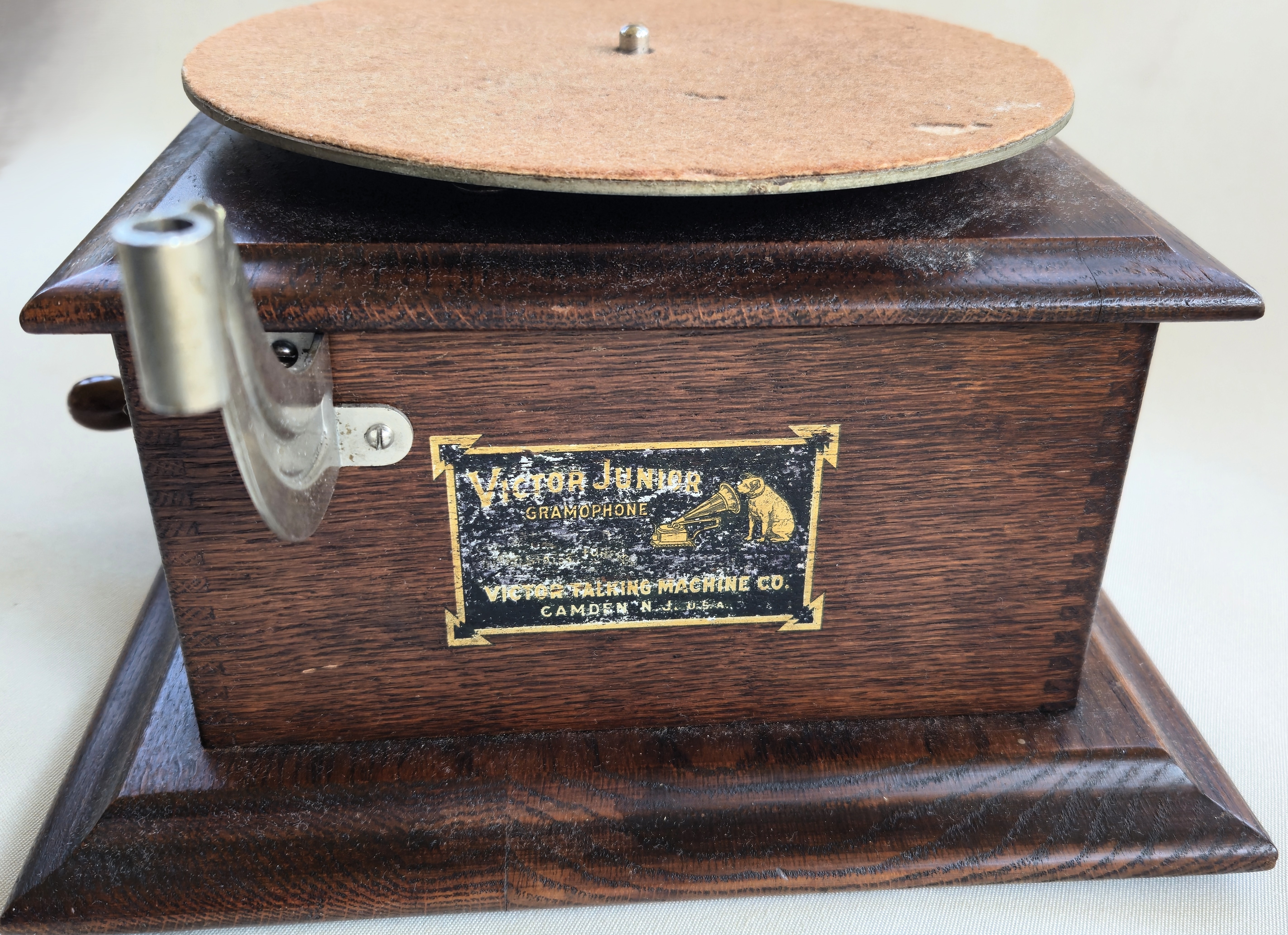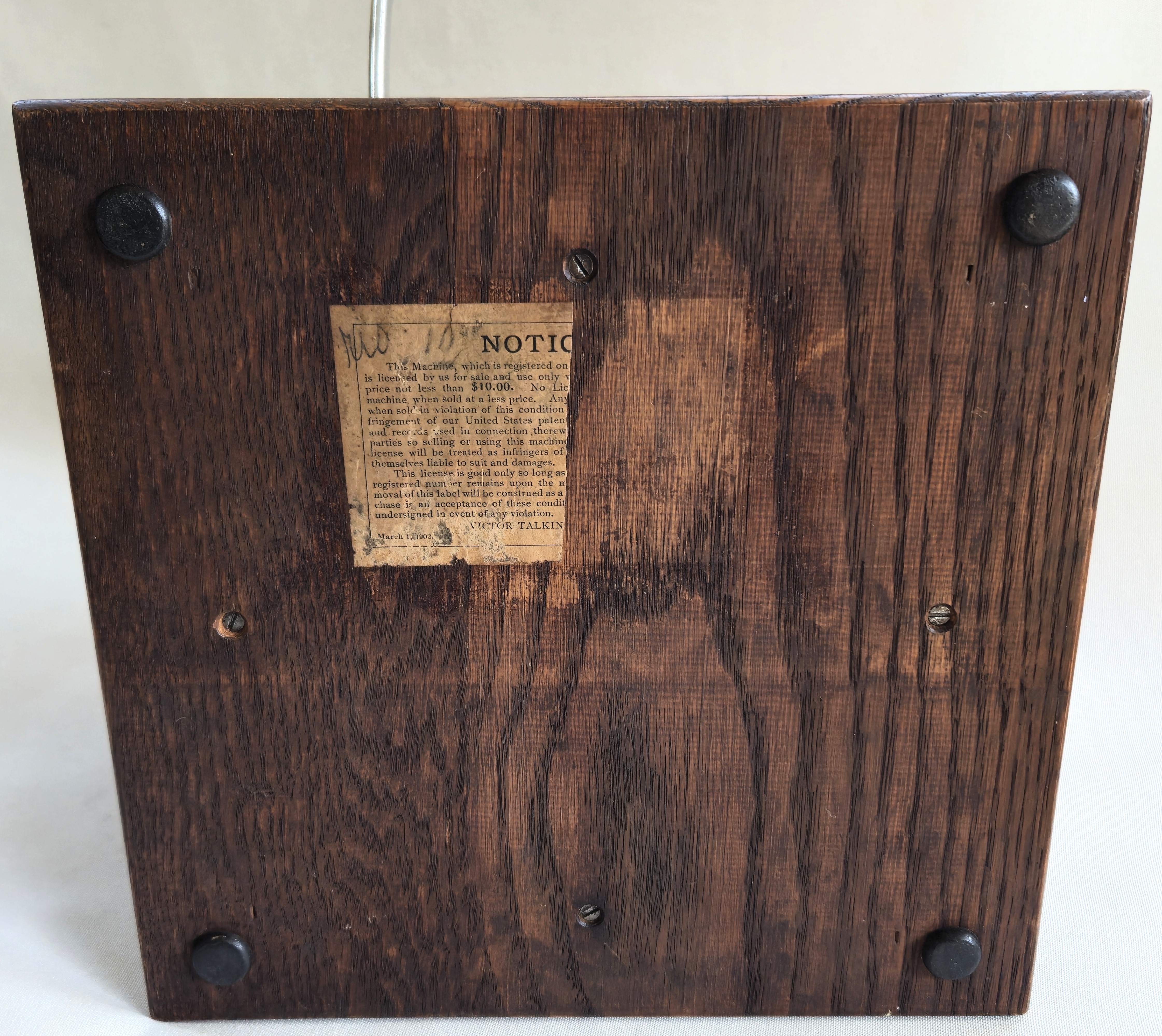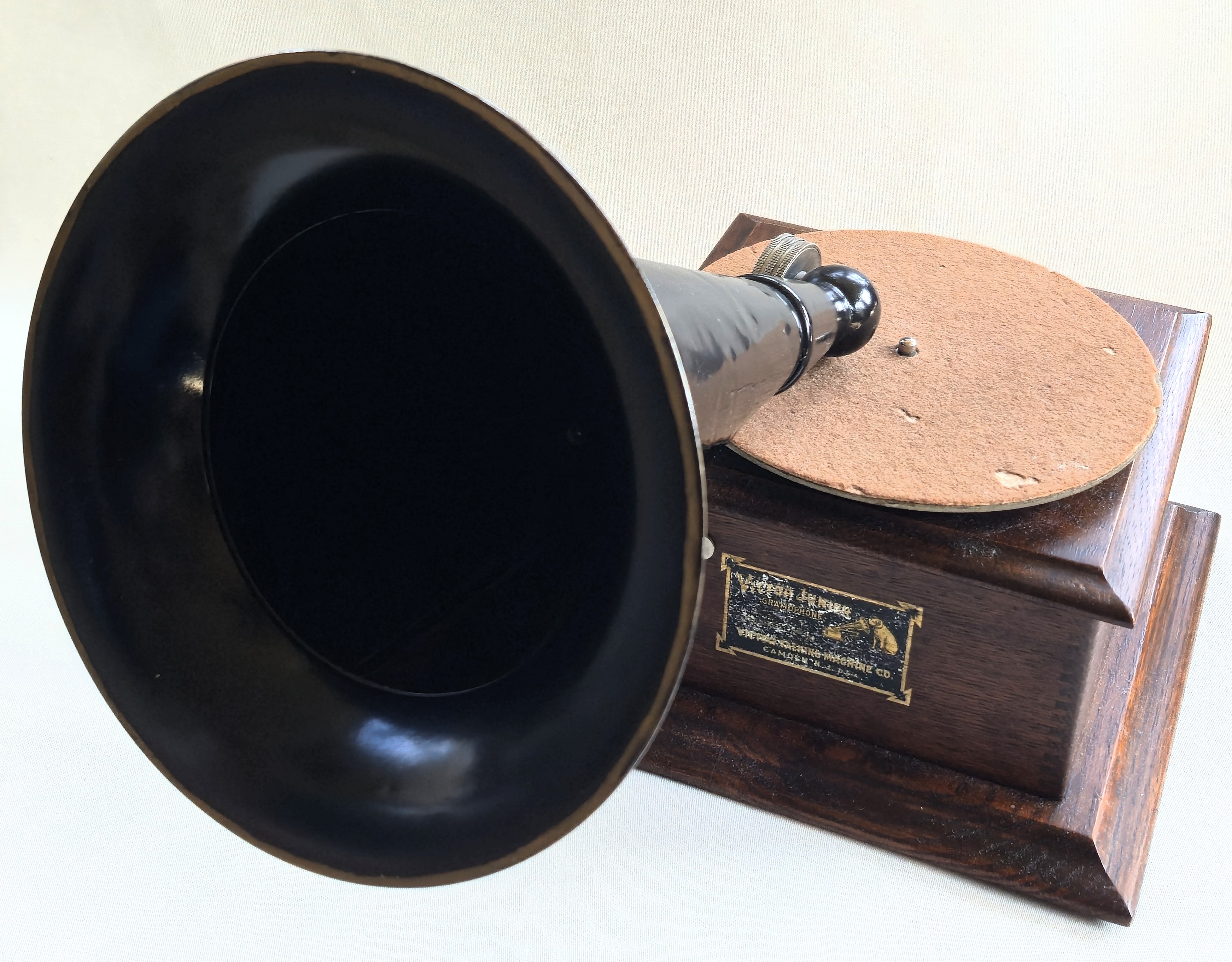 A nice Victor Jr. with a black horn that has been repainted. The machine and oak cabinet are all original. As you can see, the decal on the front of the machine is fully in tact, but has some wear. Turntable felt is original as is the crank. Although these machines are not known for having a robust motor, this will play an entire 10" record. The reproducer is an extremely well made reproduction and plays very well. The partial sticker on the bottom shows the March 1902 date.