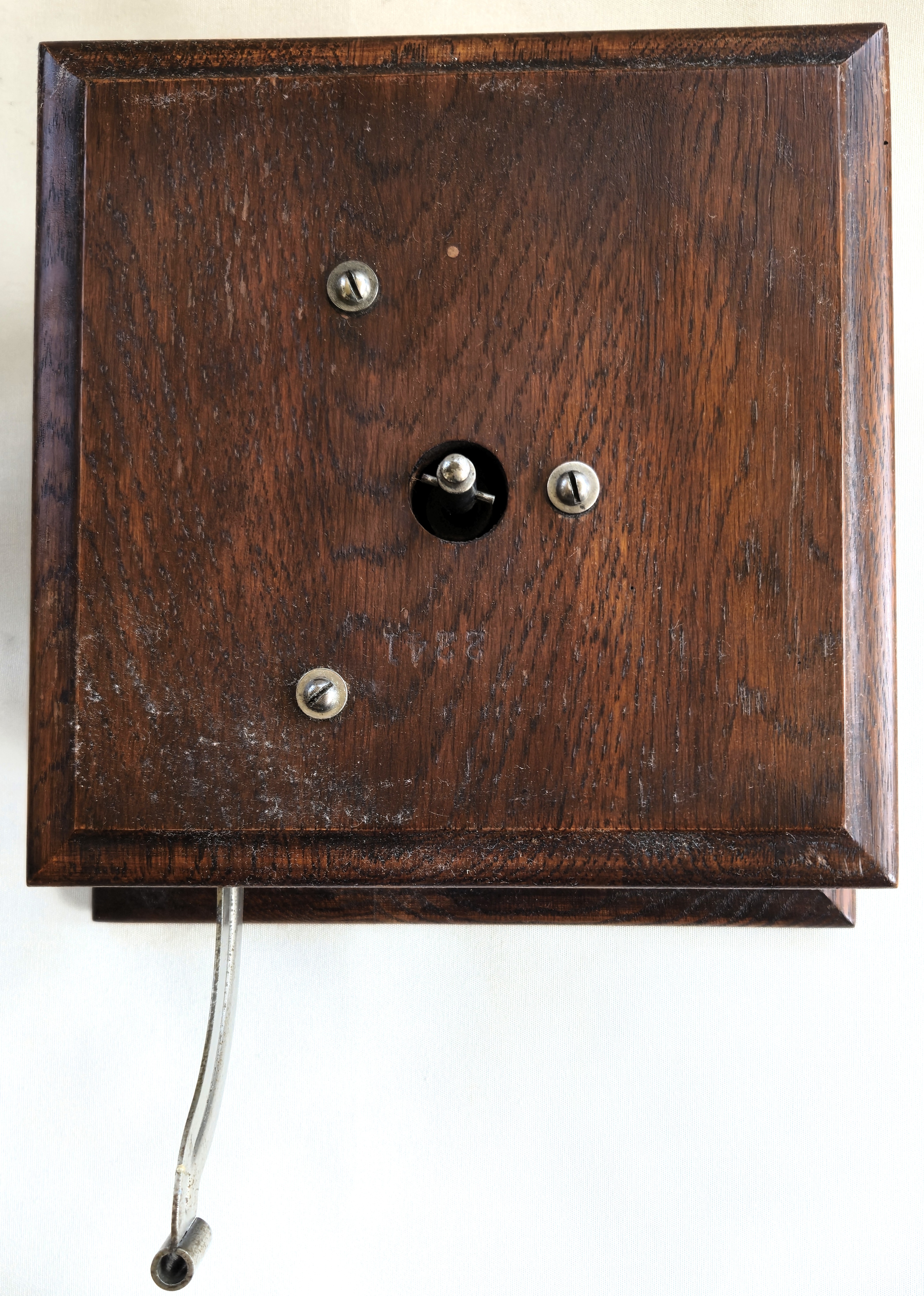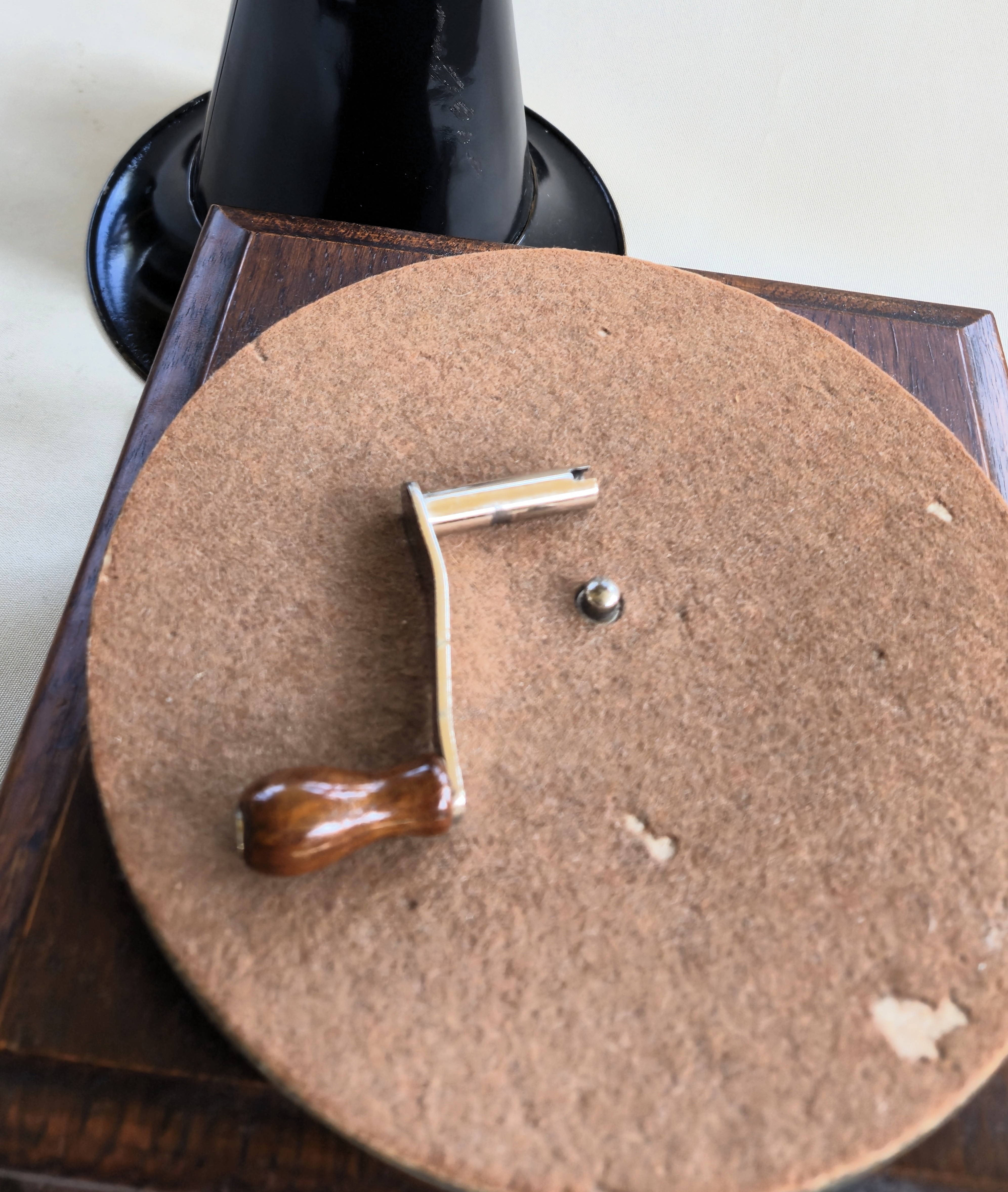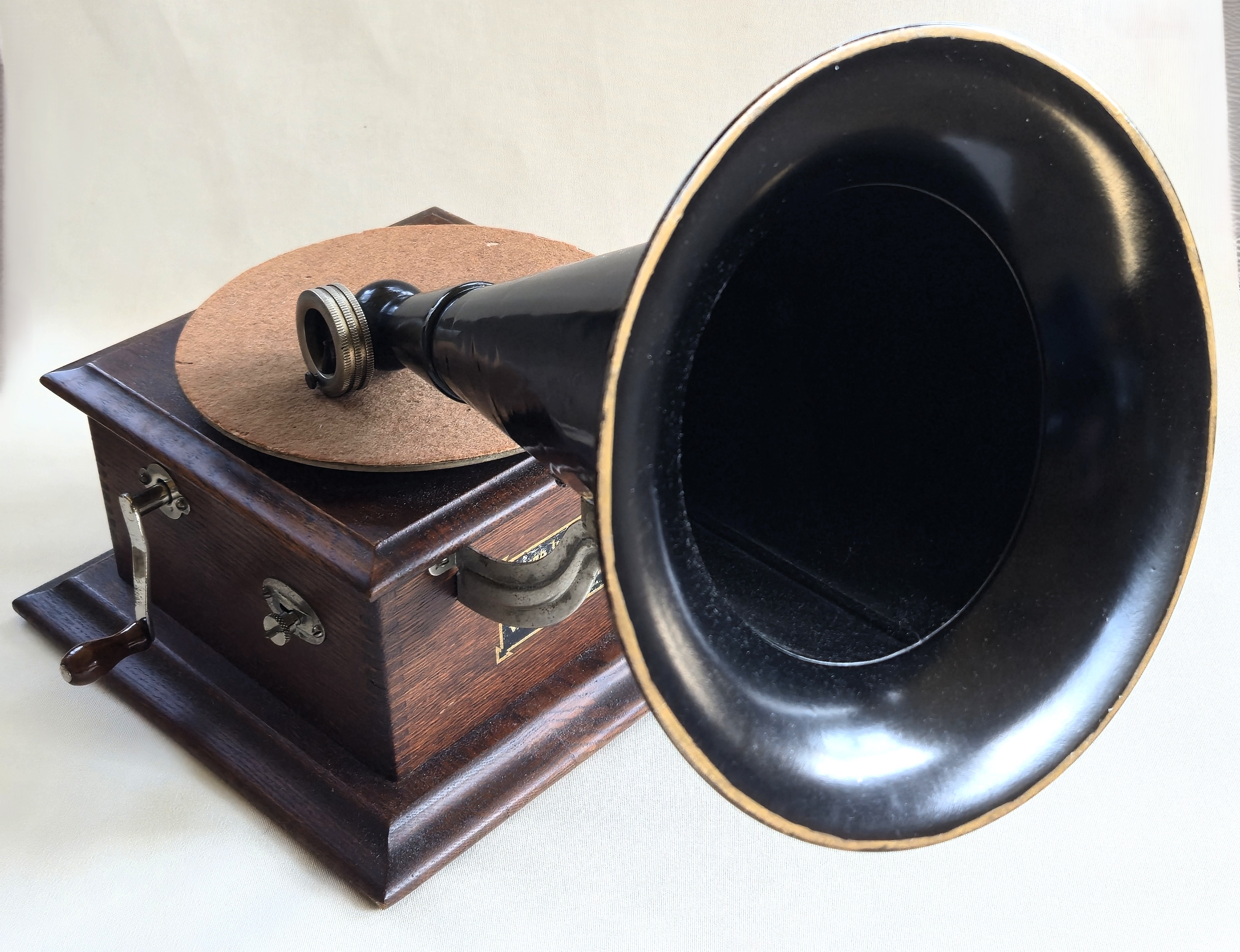A nice Victor Jr. with a black horn that has been repainted. The machine and oak cabinet are all original. As you can see, the decal on the front of the machine is fully in tact, but has some wear. Turntable felt is original as is the crank. Although these machines are not known for having a robust motor, this will play an entire 10" record. The reproducer is an extremely well made reproduction and plays very well. The partial sticker on the bottom shows the March 1902 date.