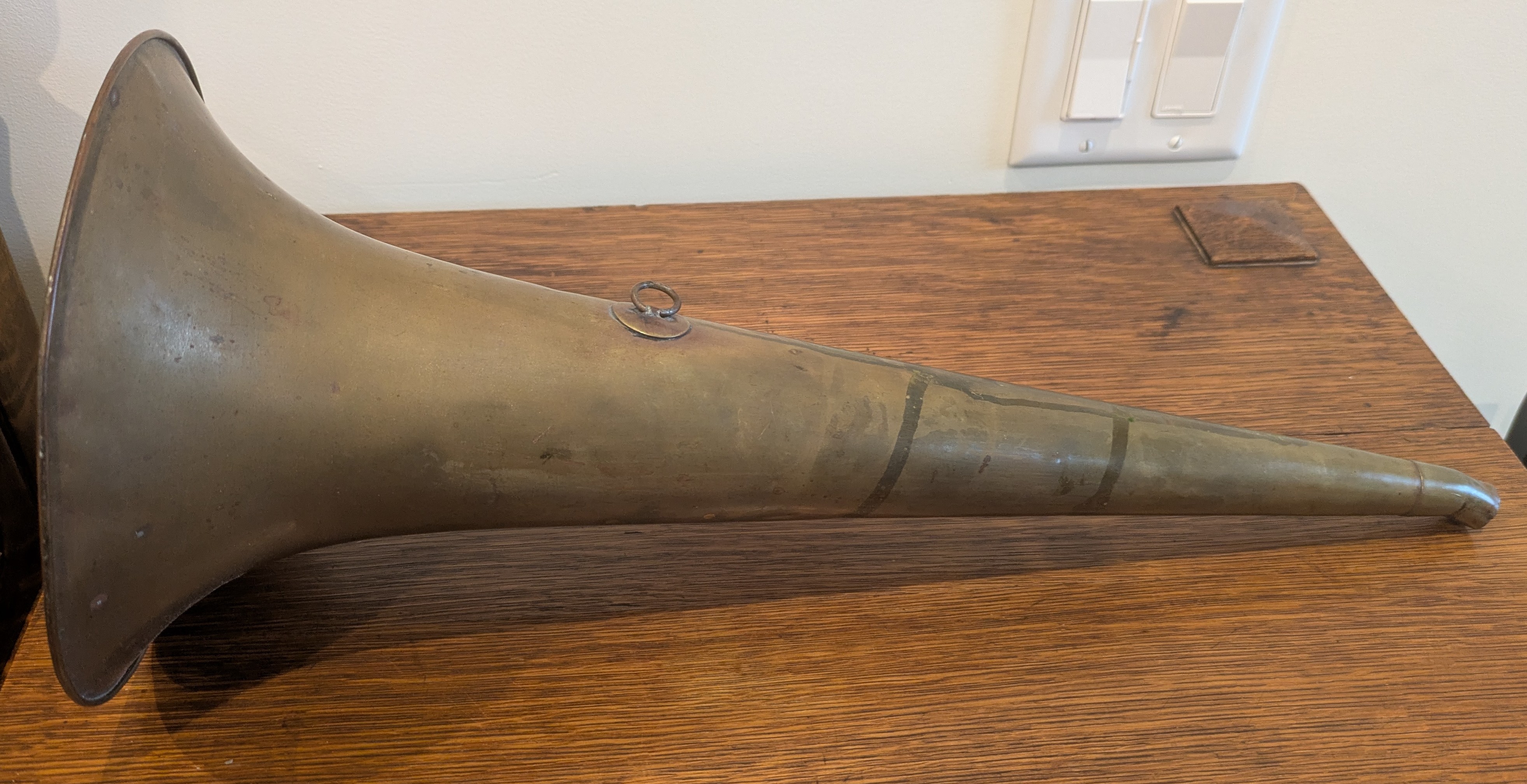 Here is a seldom found horn in exceptional condition. Original patina, straight with no issues. Seamless horns were made like band instruments, with a nearly invisible seam. They are elegant, high-quality and were very expensive to make. Introduced in the 1890s, then didn't last long and were quickly supplanted with the cheaper all brass horns with a seam between the bell and the body of the horn.