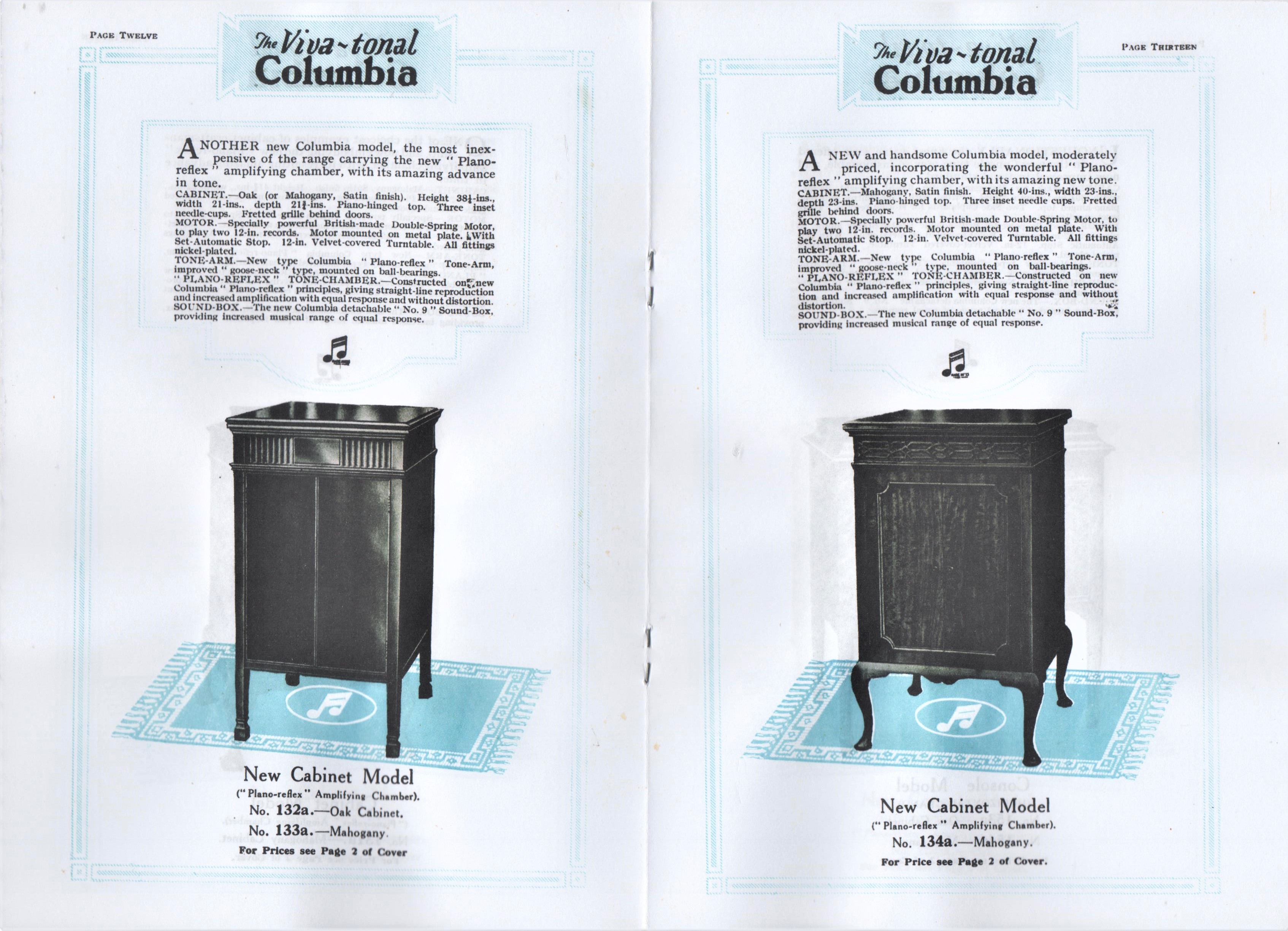 Does anybody have any information about Viva tonal Columbia No.132 model? I'd like to know what kind of horn and the front grill it has and whether it has record storage. I know it has Piano Reflex tone arm and horn. Thank you.