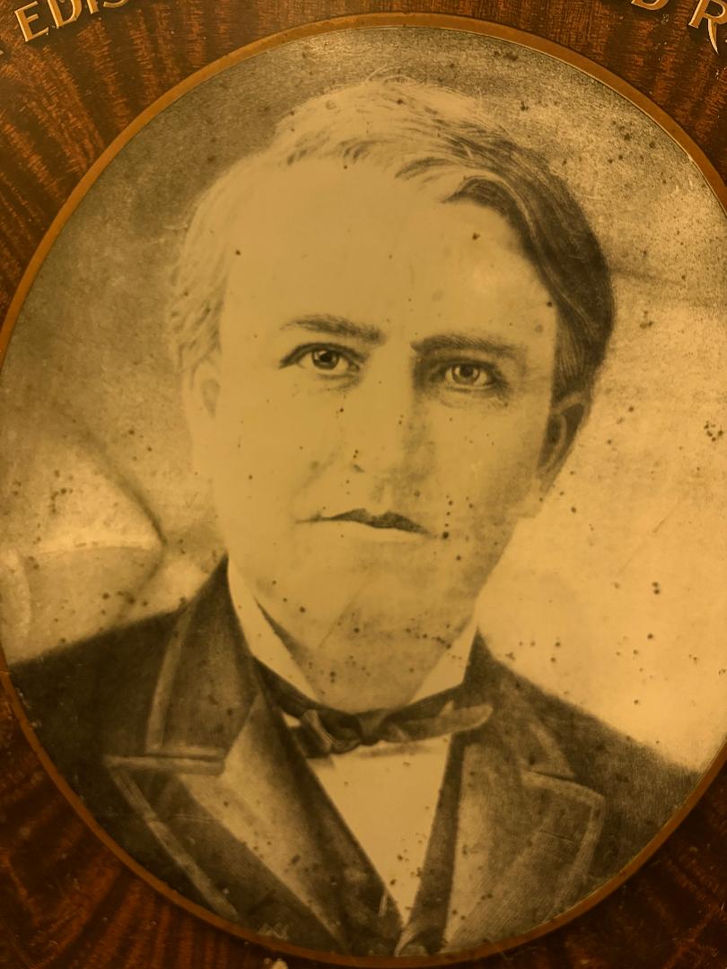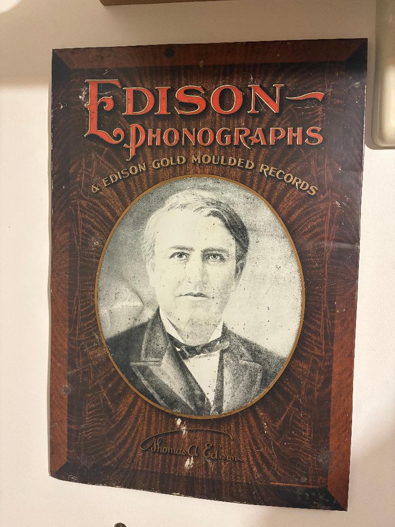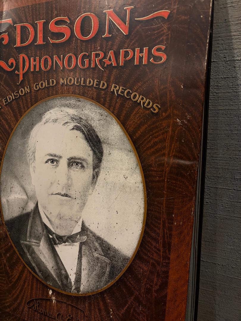 Here is one of the rarer Edison advertising signs-- Great graphics- measures 13" x 19" Colors are really good. Metal sign with cardboard type backing.