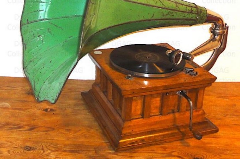 But, as you noted, it looks like the gramophone's horn and tonearm (possibly the back bracket) were removed for some reason.
