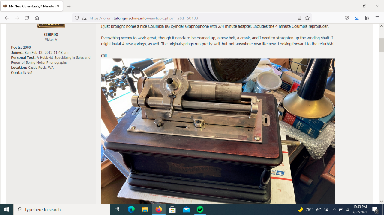 Re: My New Columbia 2/4 Minute BG Cylinder Graphophone