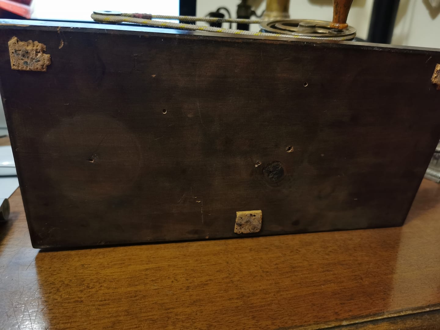 Highly interesting that your gramophone carries a diaphragm on the bottom. Does the sound box also carry a diaphragm embossed with patent data, or is this not embossed? Which marking is engraved on the back of the sound box?
