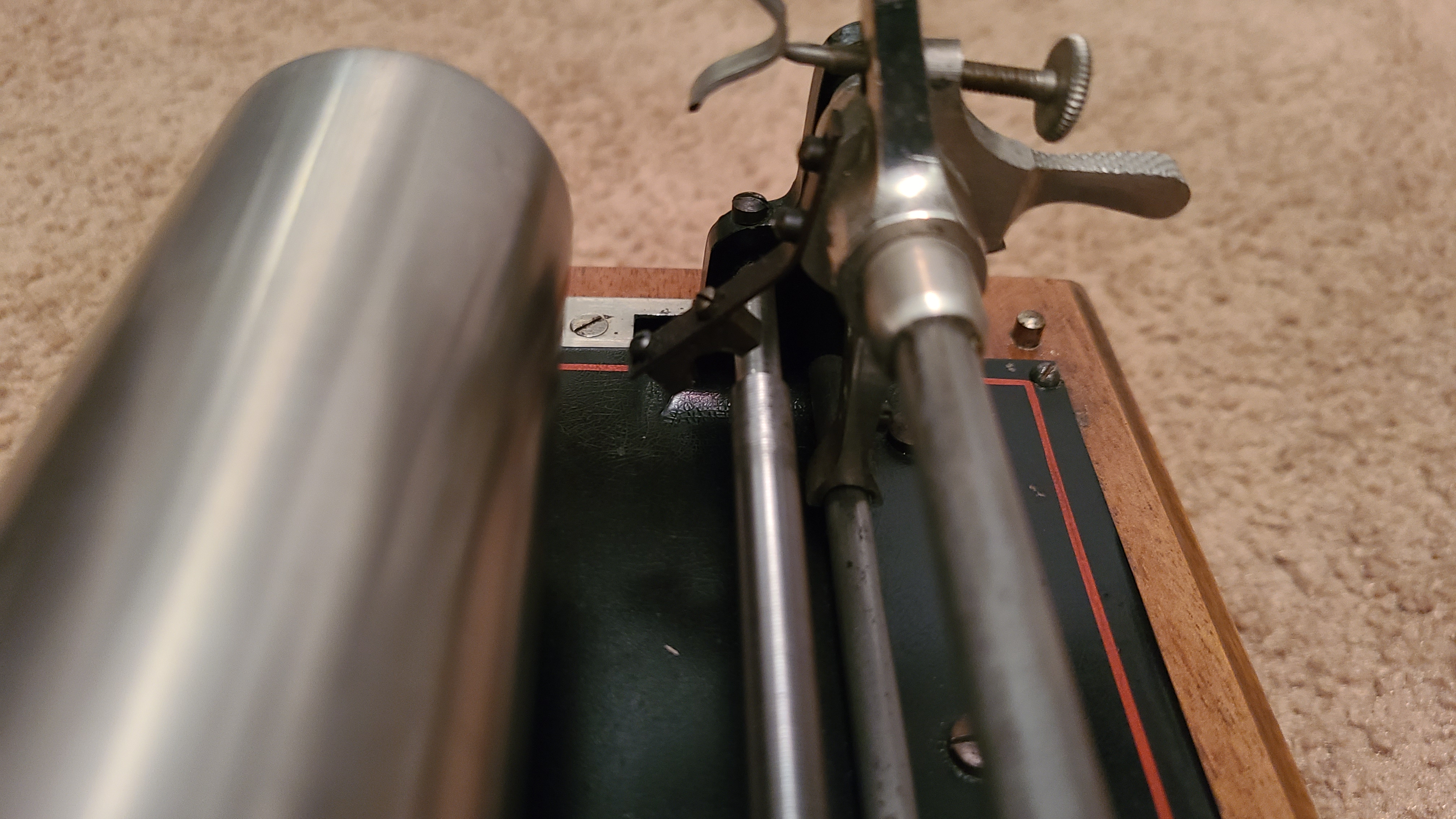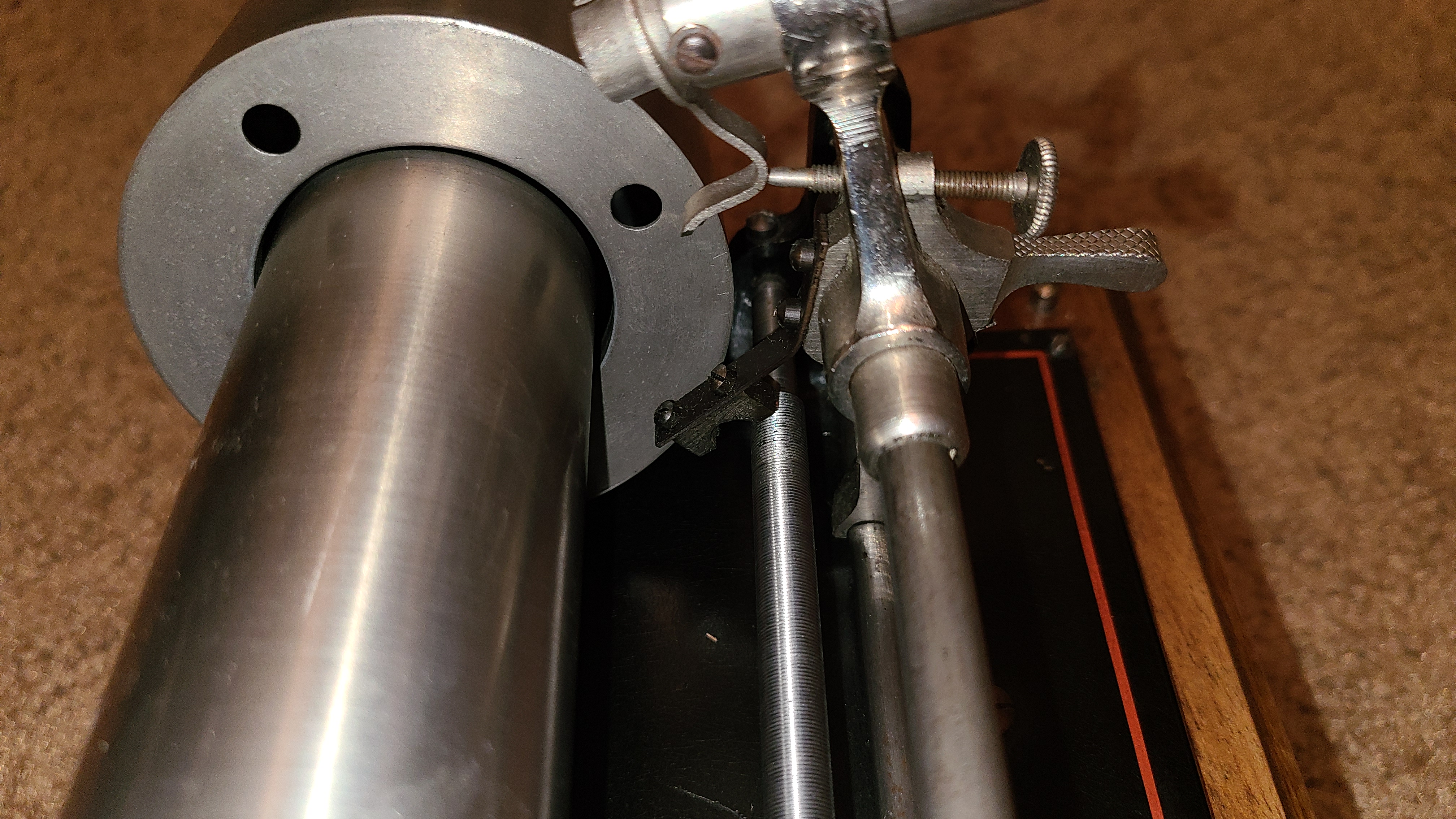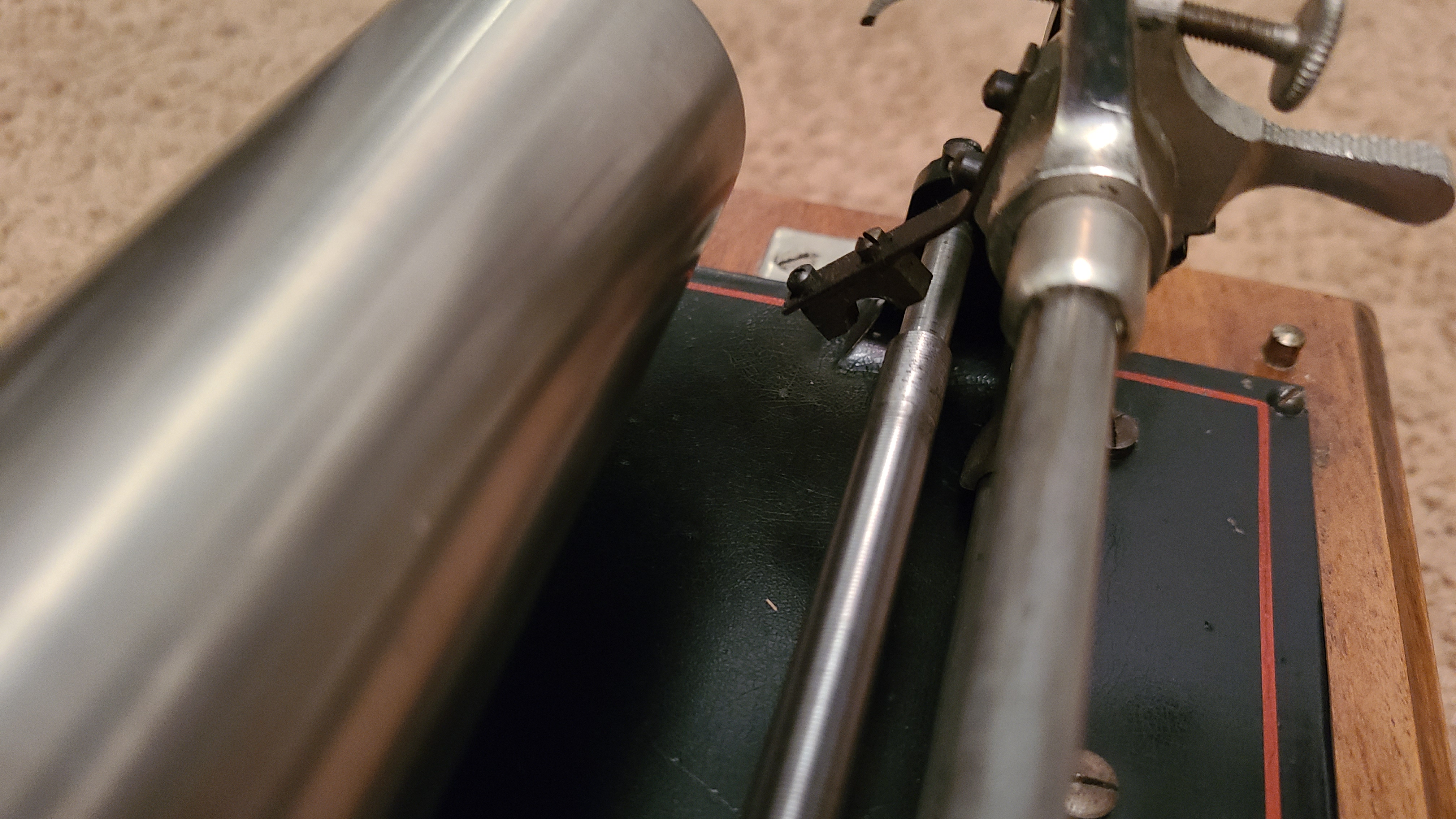 I have retrieved my machine and fitted a salon mandrel and cylinder(cylinders shrink so do not always fit correctly on mandrel) and adjusted the reproducer sleeve and screw to make sure the stylus hits the cylinder at right angles..I cannot play as my reproducer is stripped for rebuild.Atta he'd some photos of set up.