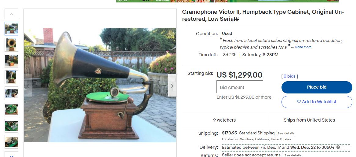 Opening bid, by the way, is $1,299, and no one has bitten yet. Ominously, while disclaiming any expertise with gramophones, the seller indicates he may disassemble the item for shipping.