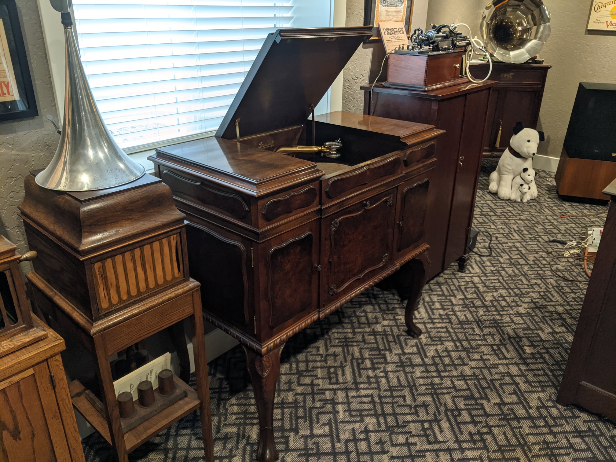 That is about the most interesting Walnut that I have seen. Beautiful figuring. Any pictures with the lid up?Pathé Logical wrote: Sat Jan 01, 2022 2:49 pm My favorite find of 2021 was this Victor VE-XVI (sn 3660 A; "Special Finish"), which I found in the wilds of Wisconsin back in August. The previous owners (non-collectors) had only used it as a decorator item for over 25 years, and had never plugged in it. The machine is in spectacular, all original condition --- right down to the original, though tattered and unusable, power cord. As a bonus, an aftermarket, record repeater was installed in this machine. The pics below (click each twice for proper orientation and to enlarge) were taken at the time of purchase.