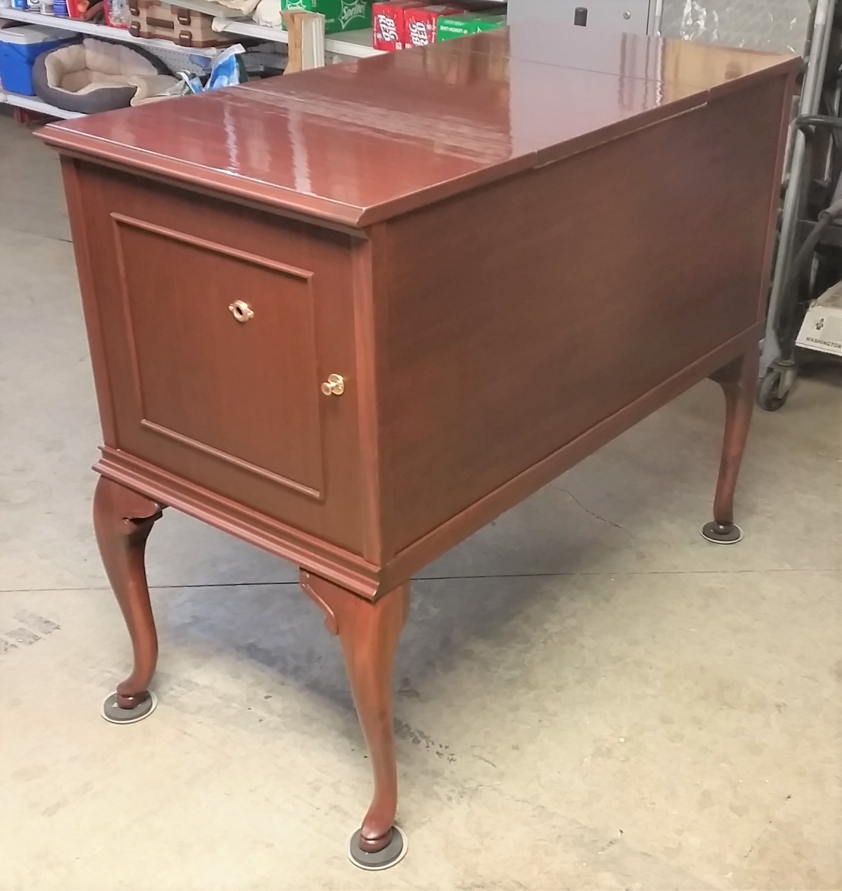 I have re-assembled the console cleaning the hardware as I go. The gold is almost completely gone except for the lid hinge and the lid prop mechanisms. I have 5 coats of lacquer on everything but the top which has 12 coats due to blocking.