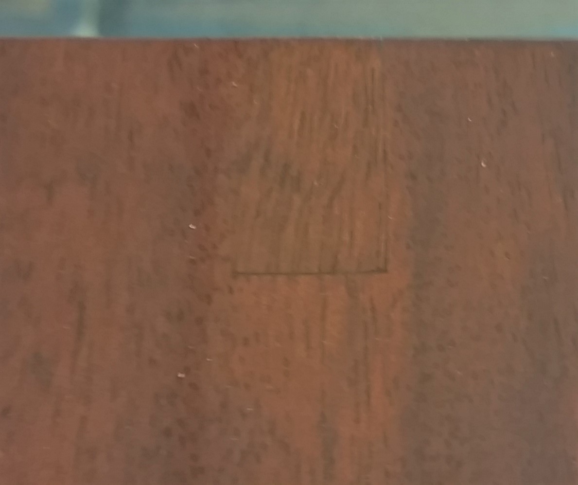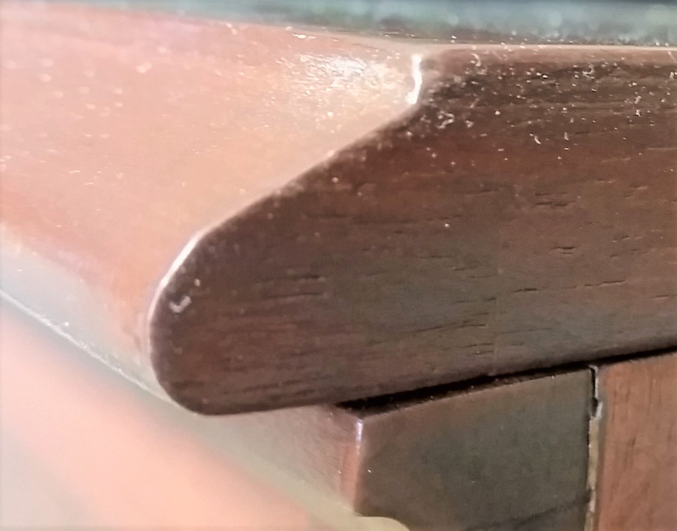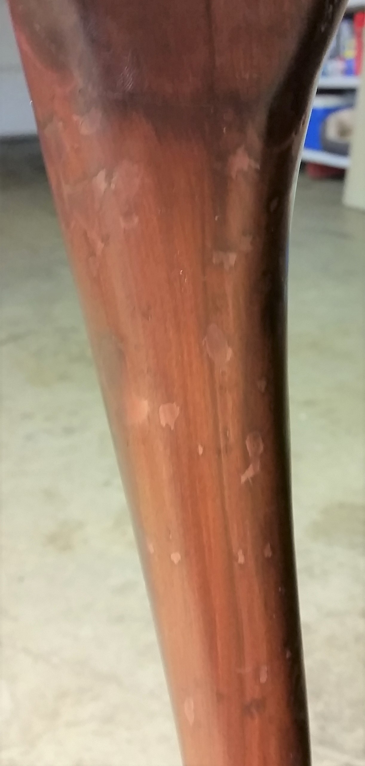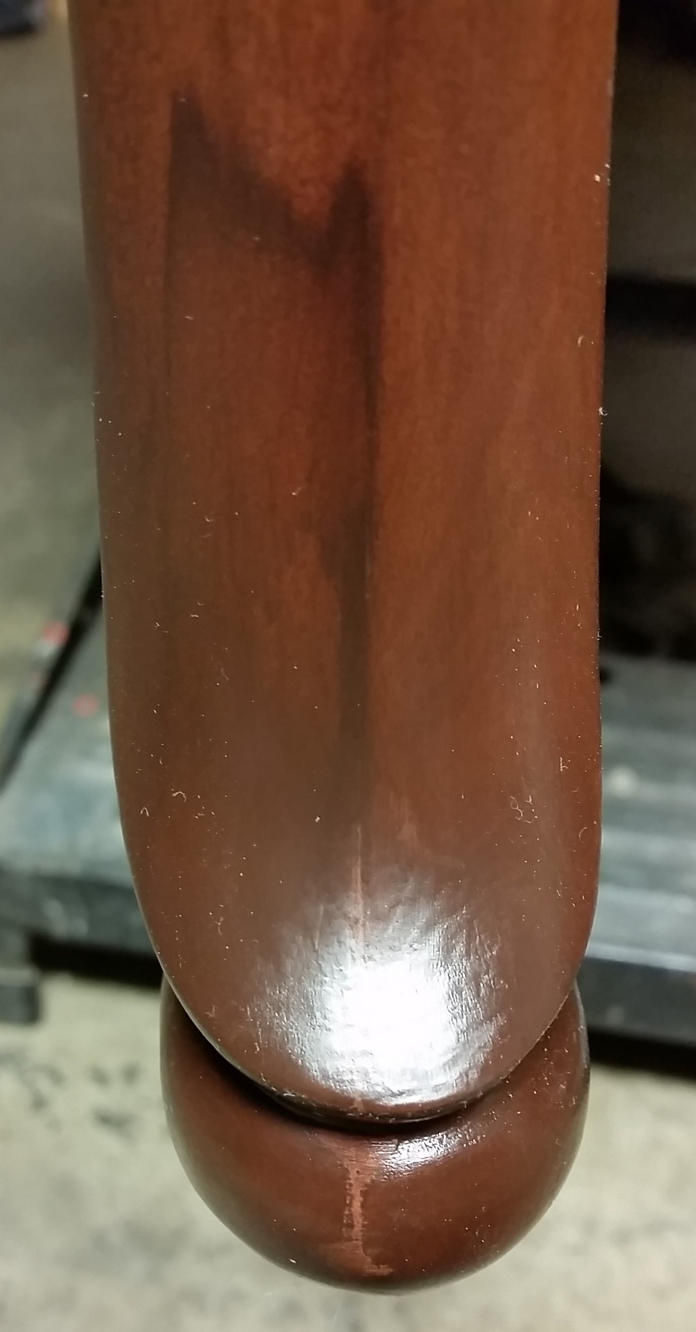 The top is glossy right now because I hand cut the lacquer to level it. I will probably #0000 wool the top to a satin finish like the rest of the console. Here are some details on the most challenging parts of the restore. The legs with chew marks and split feet. Wood filler was my only option except to make new legs and I did not think it warranted that. I worked with different shade fillers and could not find what I liked. Either it was to light or to dark with the stain. Then I started mixing the different shades together and came up with a 50/50 mix of golden oak and natural wood that was as good as I thought I would get after a dozen tries. Also there was wood bruising around the hole that took to much stain and ended up very dark almost to a black. Thankfully this is on the inside of the legs and can only be seen if you stick your head under the console. The split legs turned out nice.