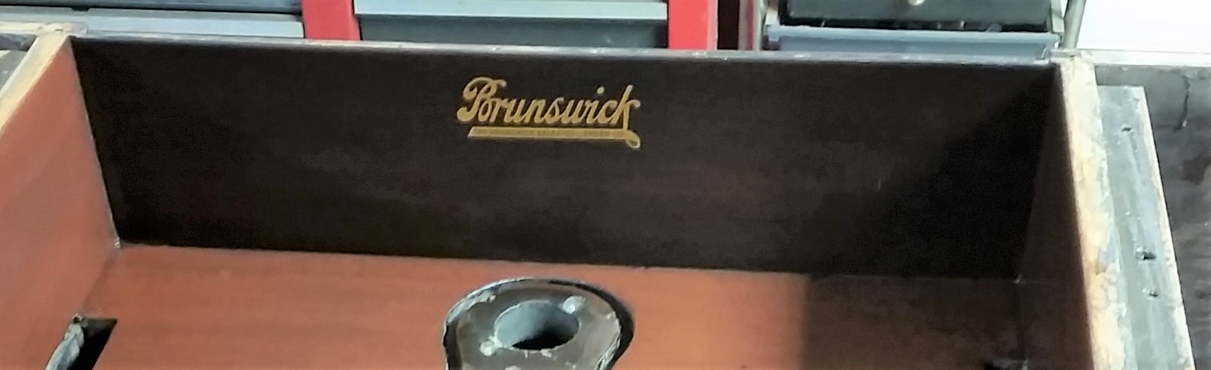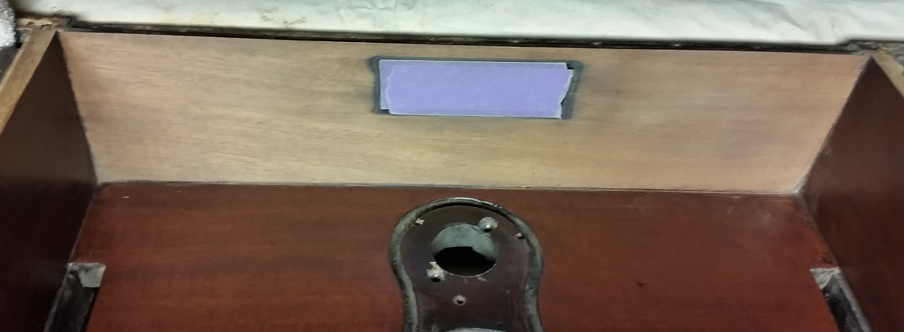 The only thing I am not happy about is the inside back. I did not want to disturb the Brunswick label as it was in perfect condition. The inside bed and walls had striper runs in spots and needed refinishing. The back had 1 run on the left side corner. First I stripped the base and sides, stained and put 3 coats of lacquer on them. It did not look right. The back was way to dark, and I can still see the run. I don't know if the inside was stained darker originally or if it darkened over the pass 100 years. So I said to myself I don't like this, press on and either I will totally screw it up or get it to my liking. So I taped off the label and hand sanded it down. Then carefully sanded as close as I dare up the the edge of the label. I stained it with the red mahogany. Well I had to do something to transition from the dark to the red mahogany. Think about it, think about it! Ok I will try using my bager airbrush using dark walnut stain to blend a transition. Taped off the label again and fired up the airbrush. Sprayed until I thought I had a good blend. Put the lacquer to it. The judge is still out as to wither I like it. It did not blend as I thought. Mainly you can see where the old finish ends underneath the new finish. But I still have my original label.