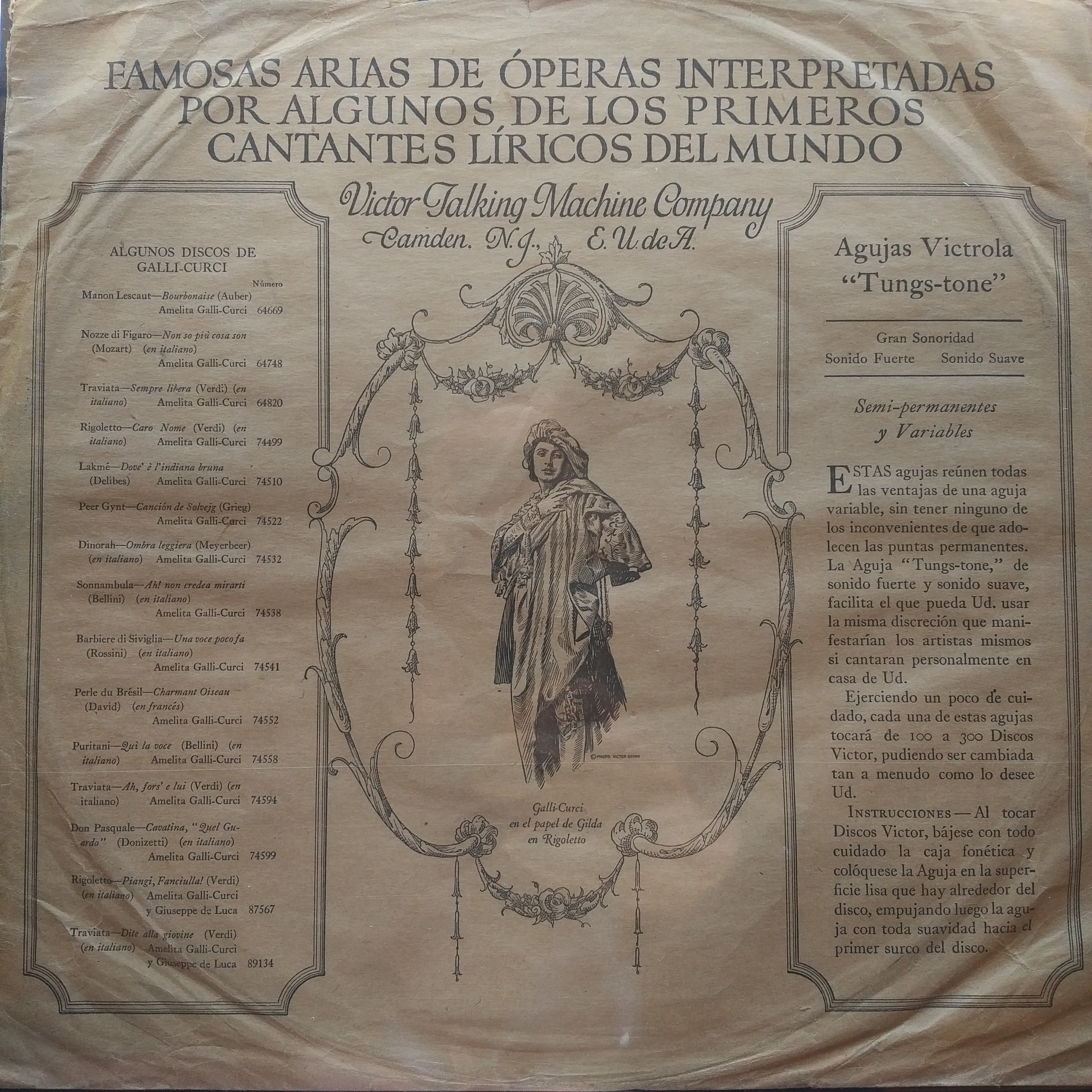 Spanish (Argentinian ?) Victor hole-less promotional jacket, that I'm particularly fond of as it features my all-times favourite soprano Amelita Galli-Curci.