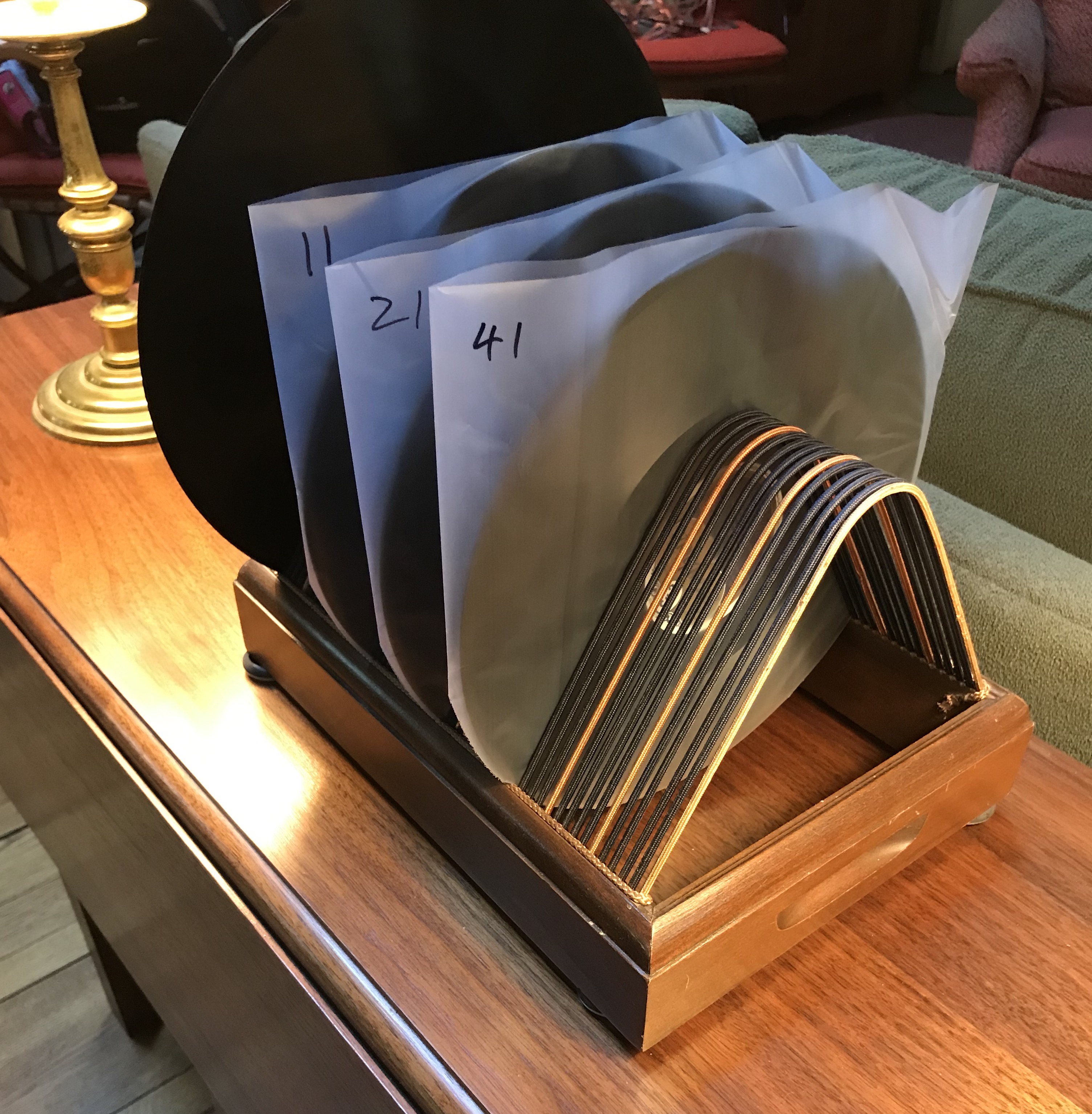 I then assemble my "playlist" by placing the records in a rack to be played, to which they are returned after playing and await their return to their respective cabinets and slots.