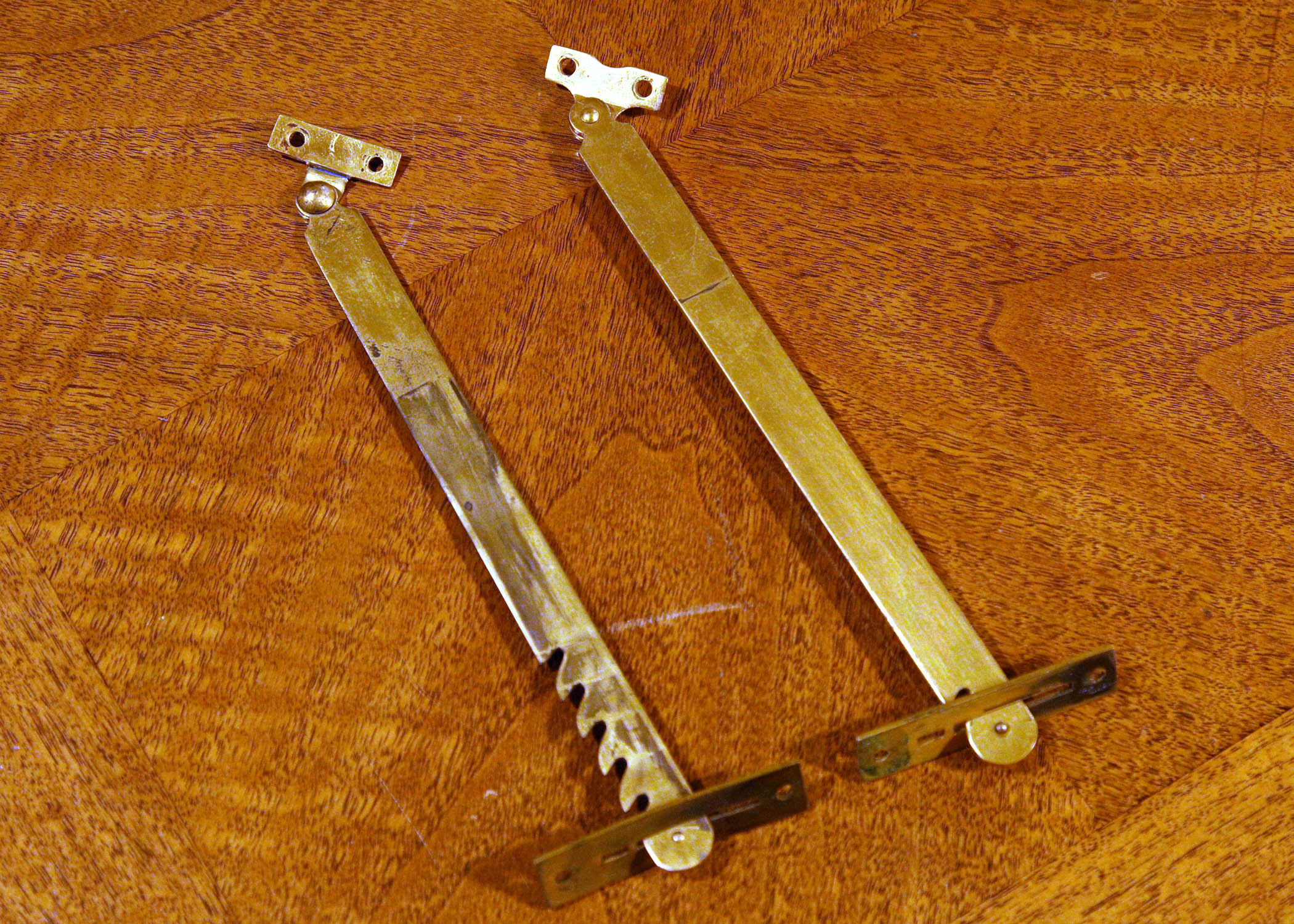 On the left we have the broken original “saw tooth” style from my machine and the slightly later version that, I suspect, went unchanged for many years. Up close, it’s easy to see why the design changed. They’re both non-magnetic. The break in the old one shows it to be brass. I suspect the newer style is also brass. The main dimentions and screw locations are the same. The thicknesses are different. The old style is 1/16”, the new style is 3/32”. That extra 1/32” of thickness goes a long way to make a sturdier support. I suspect reducing the extra “saw teeth” also accounts for increased strength. The old one certainly has been bent in a few spots.