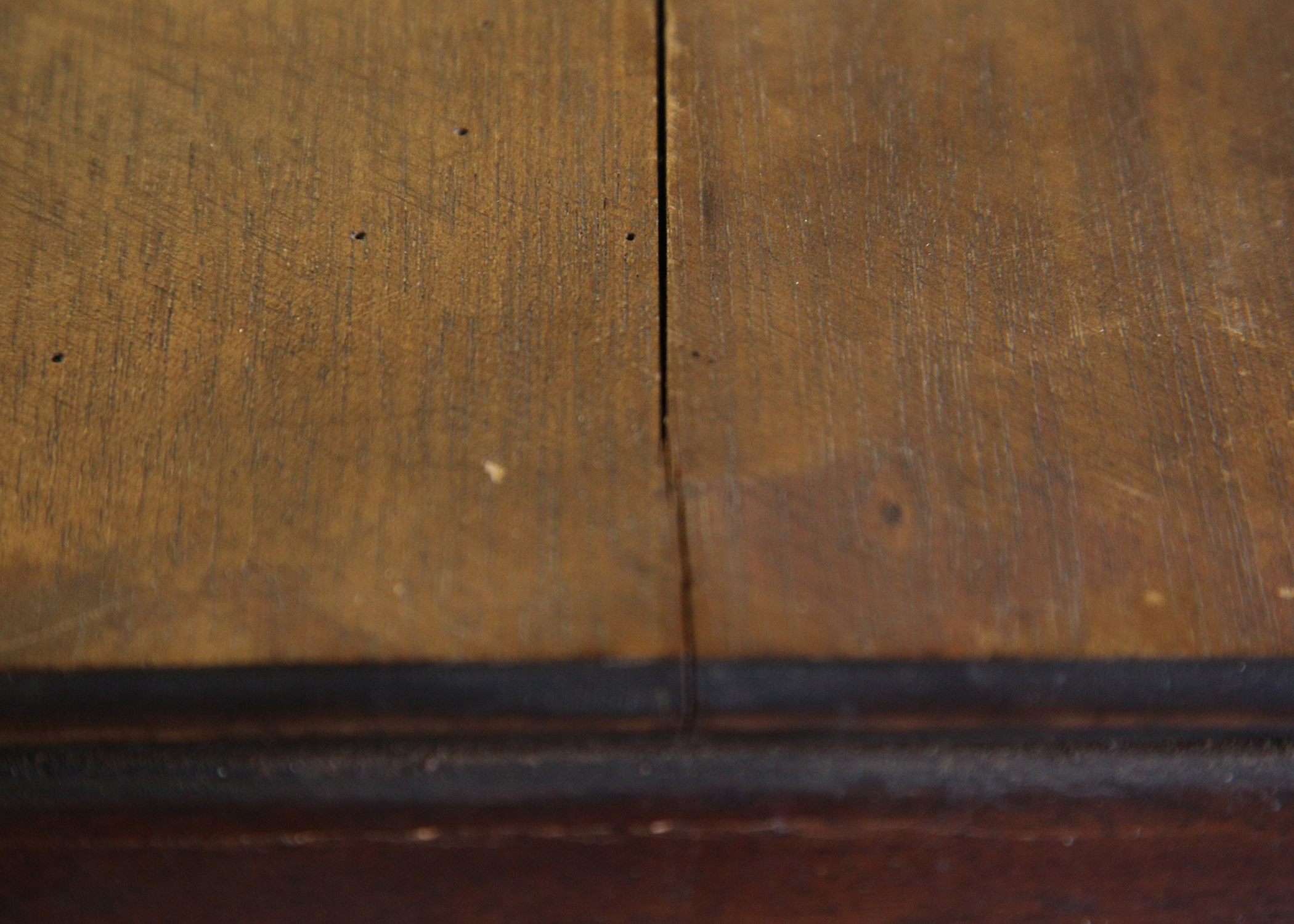 Thanks for the reply. It really doesn't show in the photos - probably because somebody stained it to hide the damage, but the top of the lid is made up of "cull" boards. There are very heavy diagonal sanding marks that I suspect was used for flattening before applying a top veneer layer. They look very similar to the “mahogany sandwich" that Edison used for the C-19 machine I rescued in about 2006. In that case, the bottom shelf was too far gone to save and I replaced it with Mahogany veneered plywood. Stripped of it's veneer, the old shelf was made up of oak "culls" - many defects, worm-holes and the like.