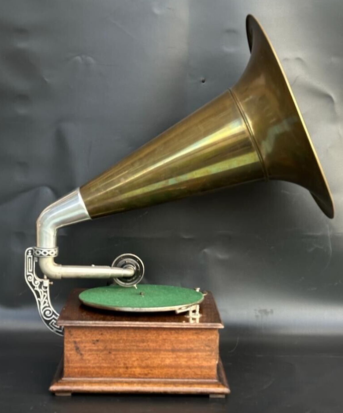 I actually owned one of these horns some years back. Sold it as a repro, and the scoundrel who bought it promptly cooked up a fake machine and sold it for genuine. The horn is characterised by that thick aluminium elbow, riveted to the brass horn. Badly thought out, the end of the horn partly blocks the passage through the elbow. Usually made to go on a G&T bayonet fit arm/bracket, but I saw a 'drop in' version recently on ebay (where else?).jamiegramo wrote: Tue Feb 07, 2023 4:49 pmNo the horns always look the same or at least similar and were made for these machines.poodling around wrote: Tue Feb 07, 2023 3:55 pmSo do you think the horn may be from some other musical instrument ?jamiegramo wrote: Tue Feb 07, 2023 2:55 pm This is a reproduction from the late 70s/80s. They were being sold on the Portabello Road Market by a lady called Maggie (Maggie Snell?). They are distinctive because they always have the beading to just the front panel and often use old cycle transfers. Better than the later Indian crapophones they would be safer to play records on. I always thought the horns looked good.