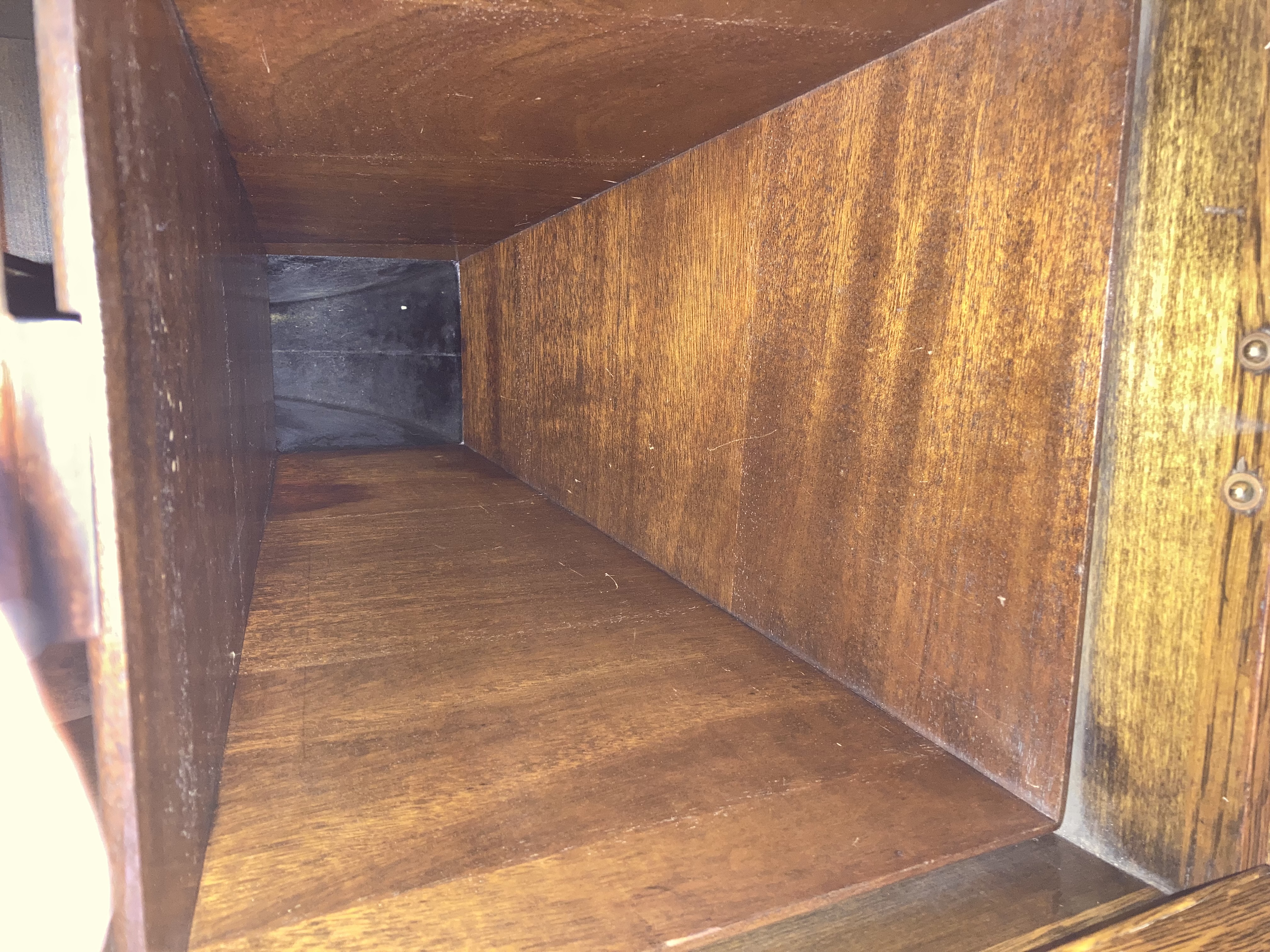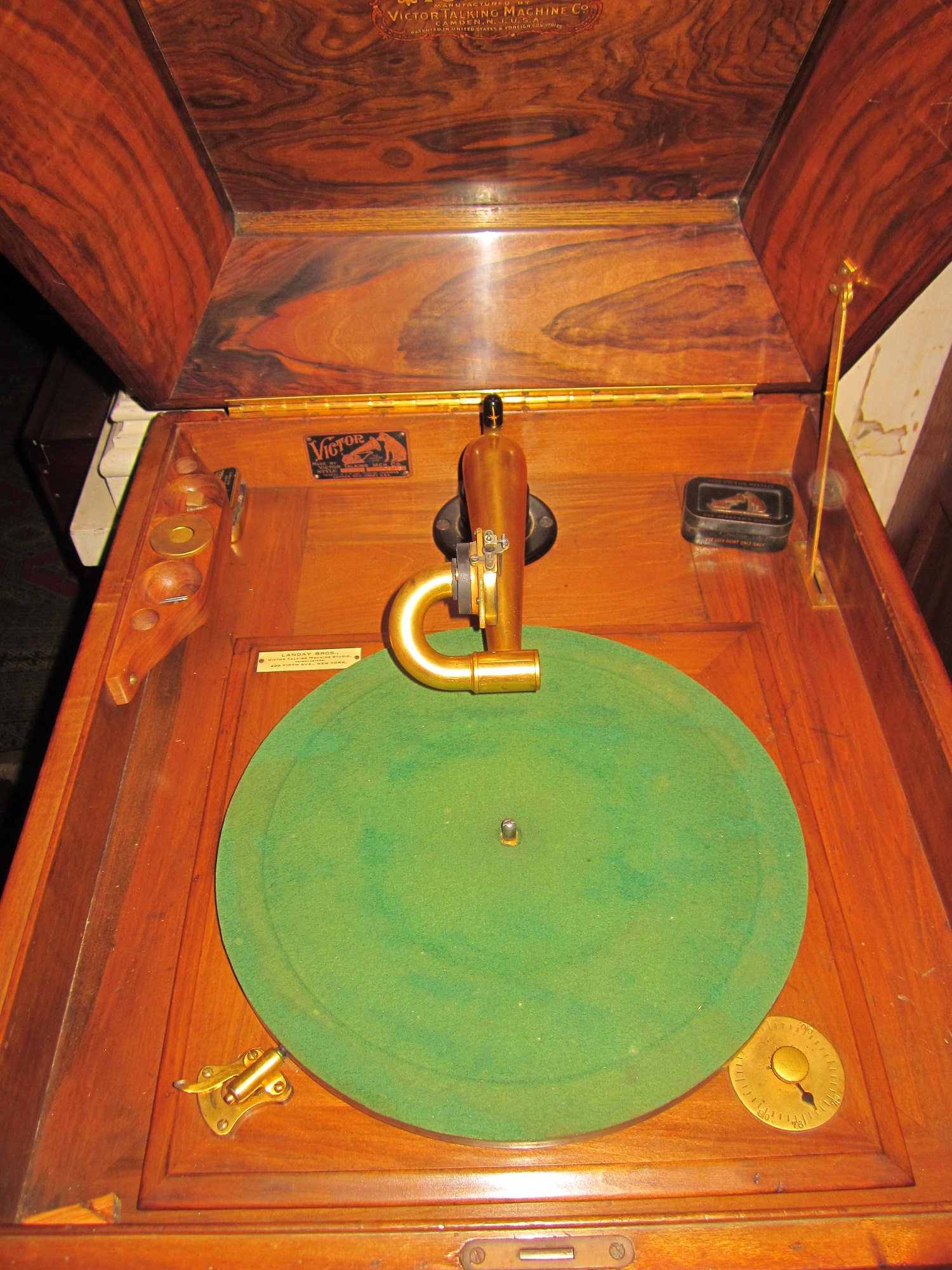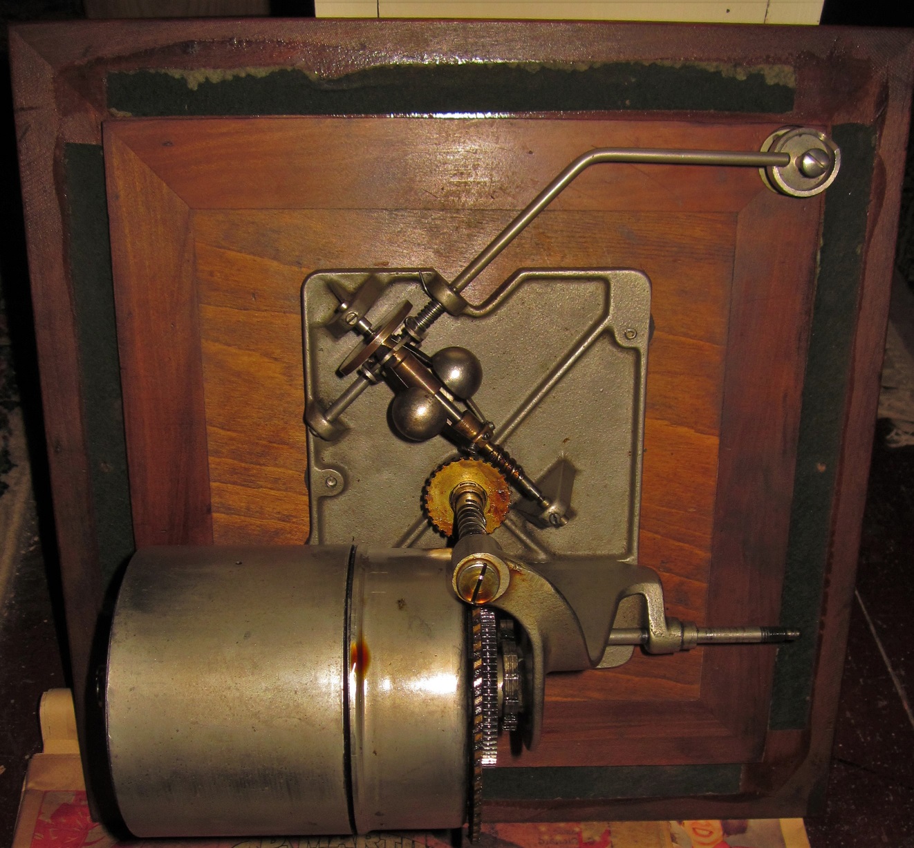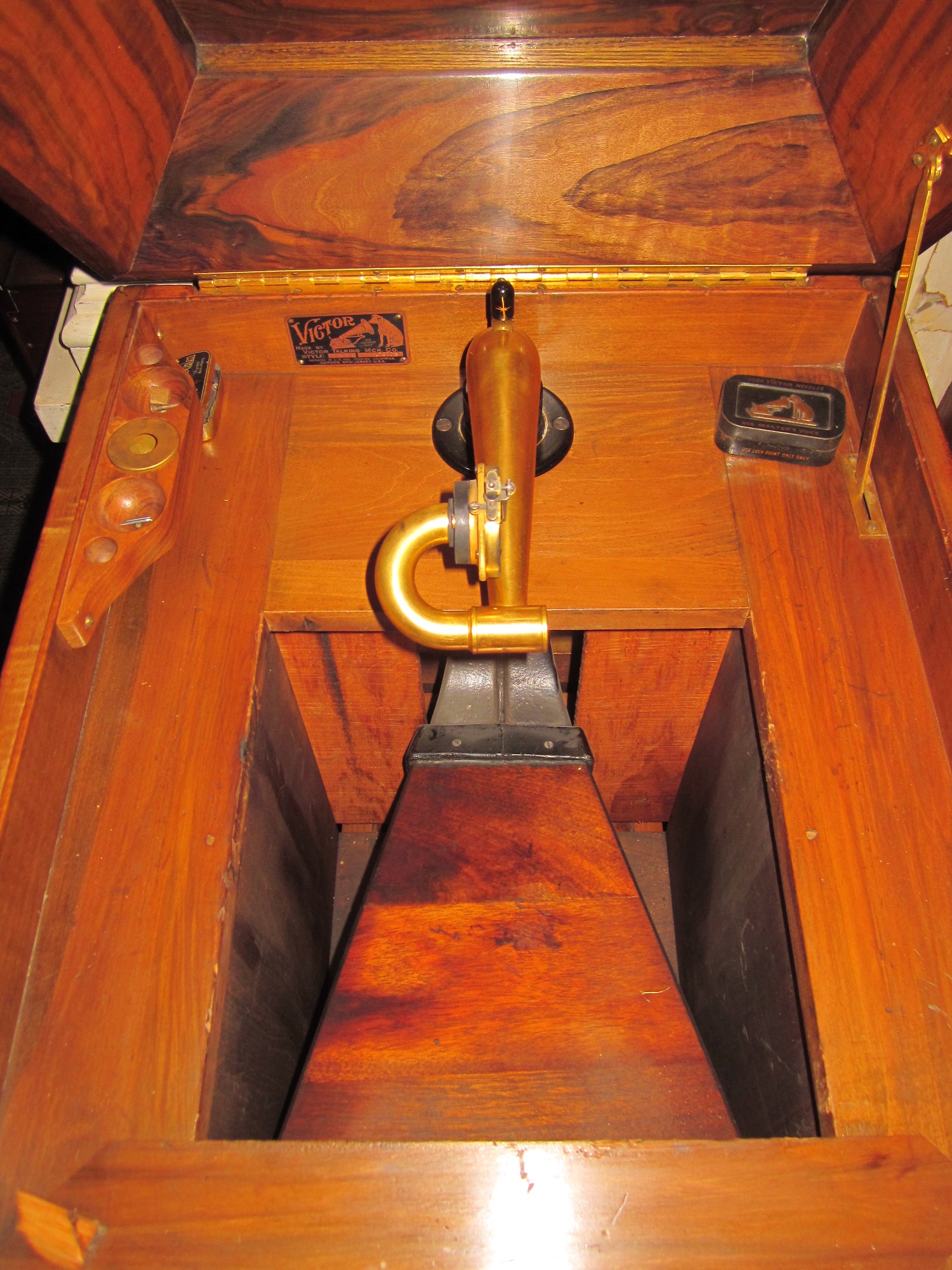streetmechanic14 wrote: Sat Feb 18, 2023 12:16 pm My circassian XVI (sn 17890) looks like a close contemporary of yours and the restoration project might be less challenging than it appears at first. I'll happily stand corrected if a real L-door expert differs but it looks to me like cheaper wood (birch? gumwood?) was used for most of the interior wooden parts of these early Victrolas, Victor simply staining (or more accurately "tinting") the material to match the cabinet exterior. The horn looks to be mahogany, probably bleached to defeat its natural bright red color and then tinted. It's not hard to imagine the motor boards being made in quantity and left unfinished until it was decided what machine (mahogany, oak or walnut) they would be matched to. I think these motor boards were fixed to the cabinet with two round-head blued steel wood screws.