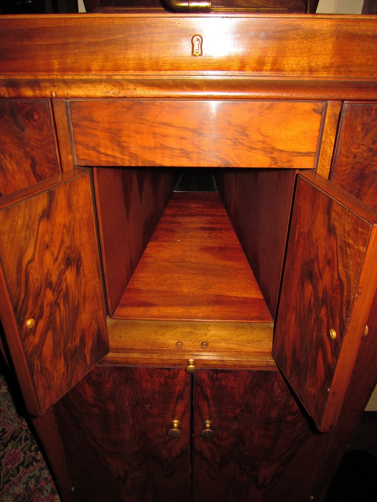 Like the horn on my Oak L-Door "C" and the one shown earlier, the horn is light colored Mahogany and the motoboard appears to be unfigured Walnut. If you have access to a planer, radial arm saw or miter box and a router table, the motorboard should not be too difficult to reproduce. I had to make one for my Pooley VTLA, (first picture). It is a little different, but the job is very similar.