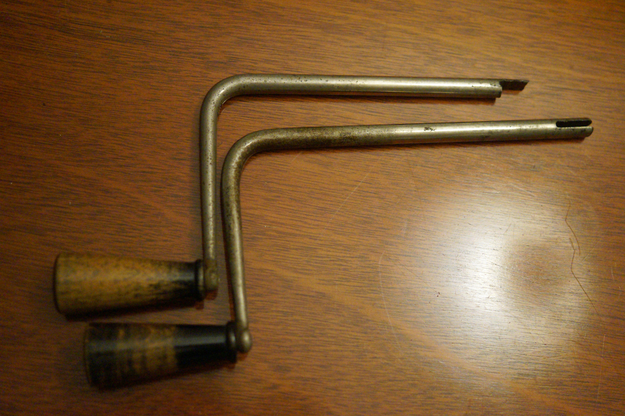 What you say about the cranks made me smile. I do indeed have cranks for both motors, however the crank for the 'miniature' floor standing 'Perophone' is missing a 'prong' - as you can see with the top one in my photograph below. It works perfectly well though ! Hopefully the remaining 'prong' will not fall off !