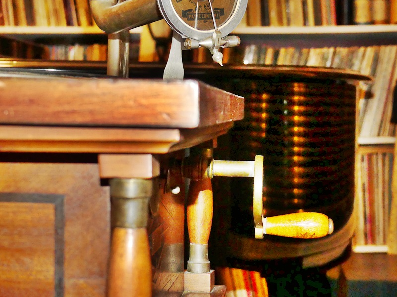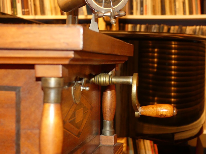 I second Steve: a wonderful machine! And I had never seen such model neither. The motor is identical to the ones used in the Concert A and the 18, it is the most powerful motor that Pathé manufactured, with a huge single spring. As to the 50 cm discs, I have about 15 of them, but as I could never find a proper place to store them, I keep them piled on the respective machines with a cloth on top to keep the dust away. And yes, they are expensive, I have paid an average of about $ 100 each over the years, there is no bargain to be had there, they are too big and weird and therefore stand in the crowd as curiosities even for dealers who cannot distinguish an LP from a 78 rpm, and people buy them as decorative items. The later 40 cm Pathés that play at 80 rpm and start from the outside are rarer than these 50 cm beasts, but do not command such high prices.