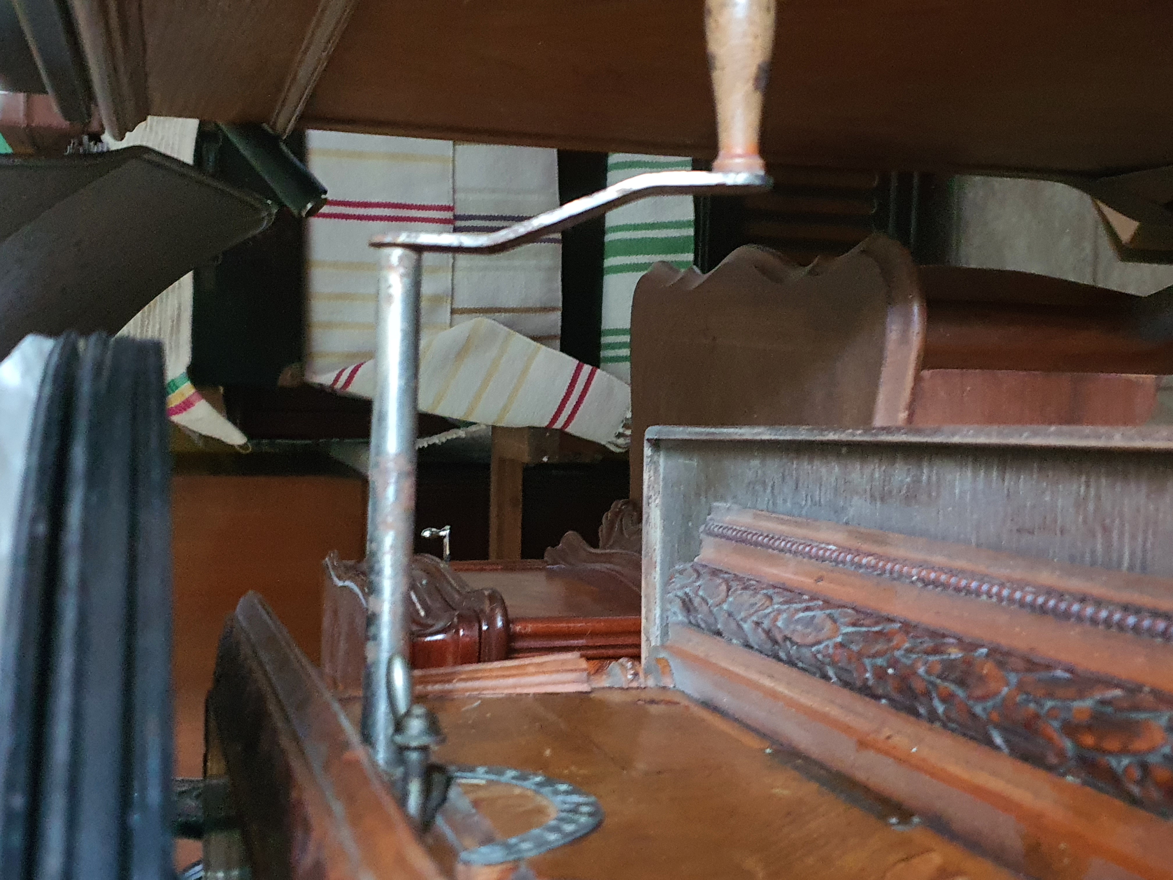 I'm attaching a couple of additional photos; one is a full view (not, unfortunately, from the side with the crank) and one of the motor. The latter shows the end of the crank where it engage the motor winding shaft.