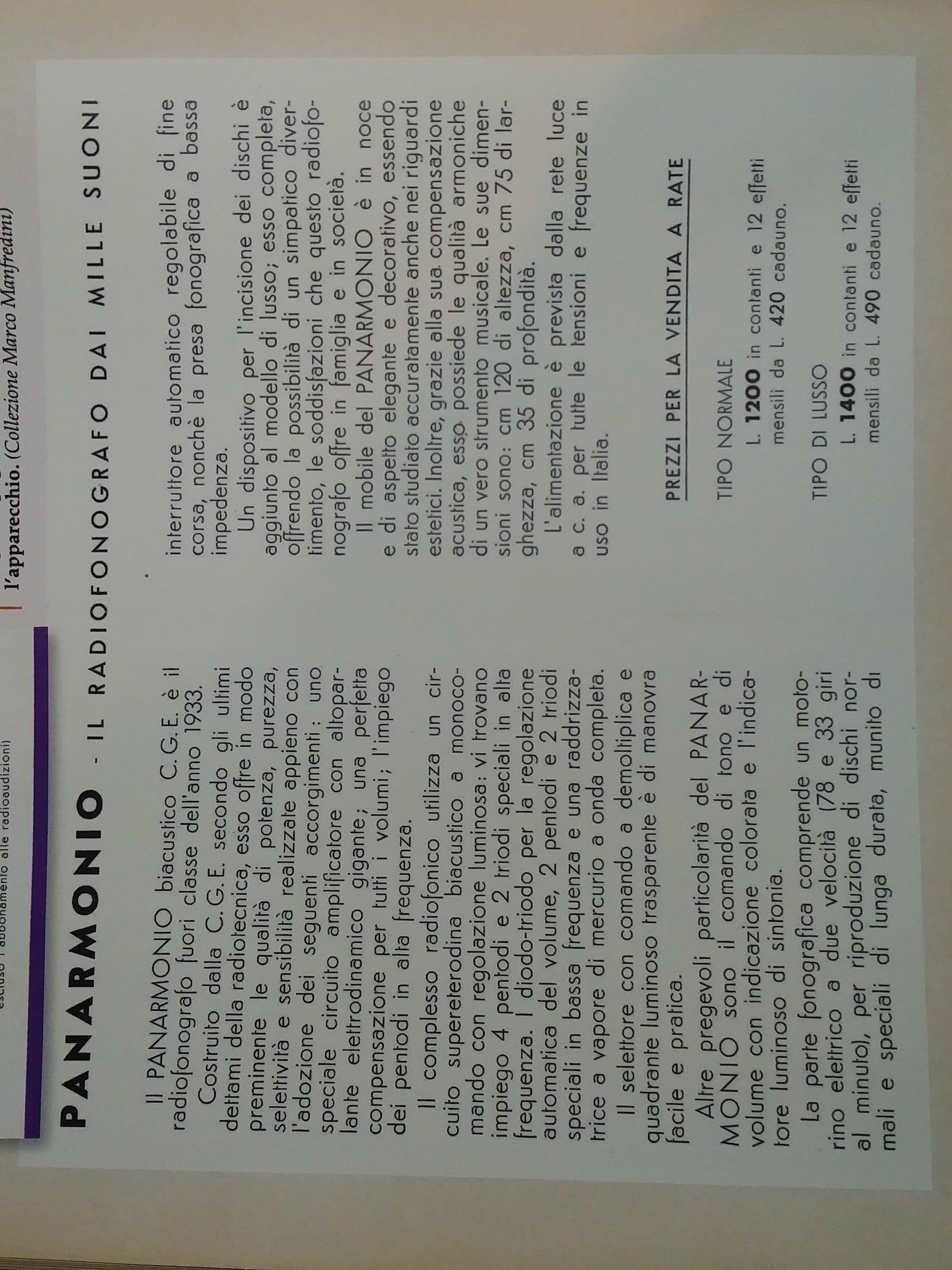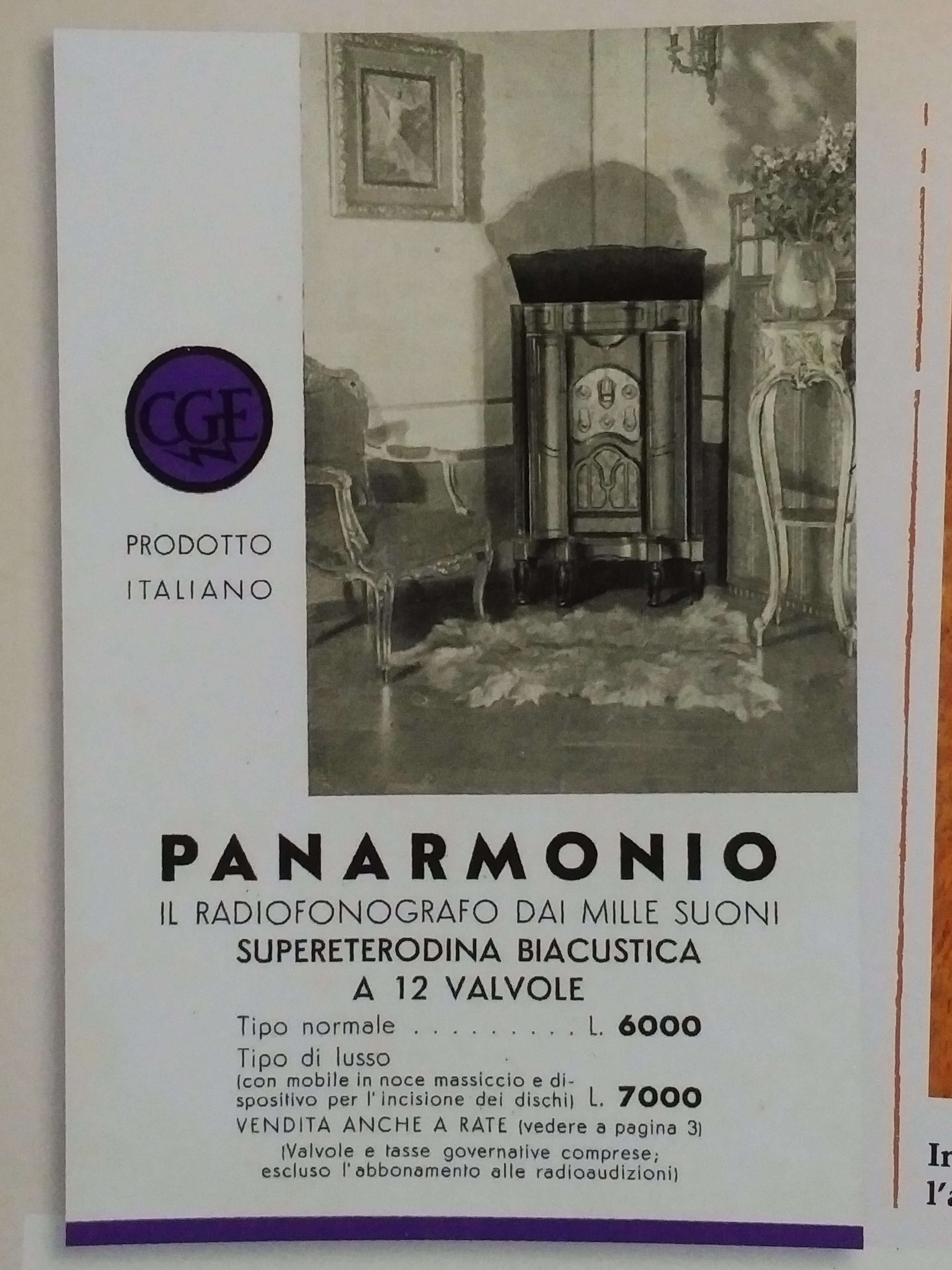For the records, it's on magazine number 168. The turntable was featured on the Panarmonio 12 by CGE Italy, which was introduced at the XIV Fair of Milan in 1933. I'm attaching few pictures of the radiogram and period ads. The Panarmonio was produced "under RCA licence", and in my opinion it doesn't take much to understand that it's mostly a locally produced copy of some more or less equivalent american radio. The turntable in particular is, quite obviously, the same RCA "cobra" arm type discussed above in this thread. In period ads (in Italian, but understandable at least in the tech specs), the slower speed of 33 RPM is as usual reported as an integer number, without any mention of the eventual additional ⅓ of revolution per minute.