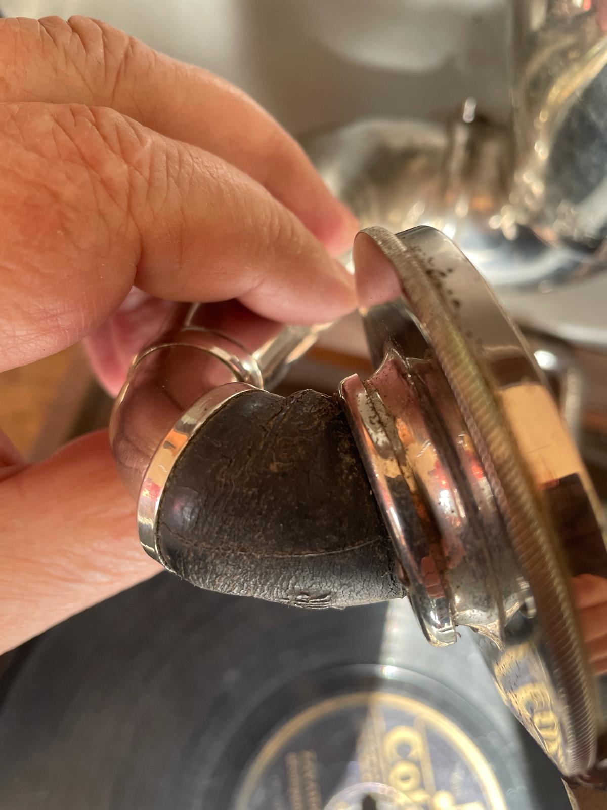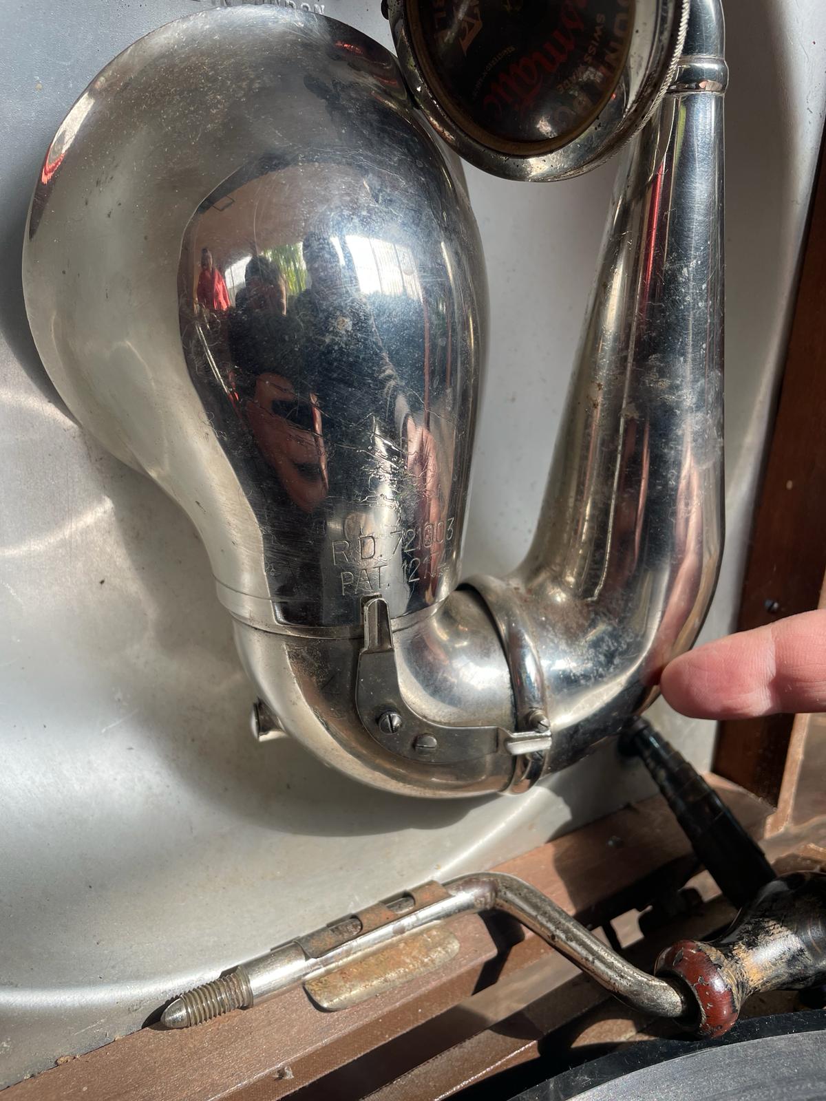 I have seen the seen the gramophone when I visited the gramophone dealer at his house. The visit was intended for me to buy other stuff and I liked that piece because of the wood horn . A few day later I asked the dealer to send me some pictures of that gramophone and the pictures I have attached are supposed to be from the same gramophone. Also the mp4 is meant to be from the same gramophone. I am not the person who made the pictures, my hometown is 350 km away from the antique dealer house