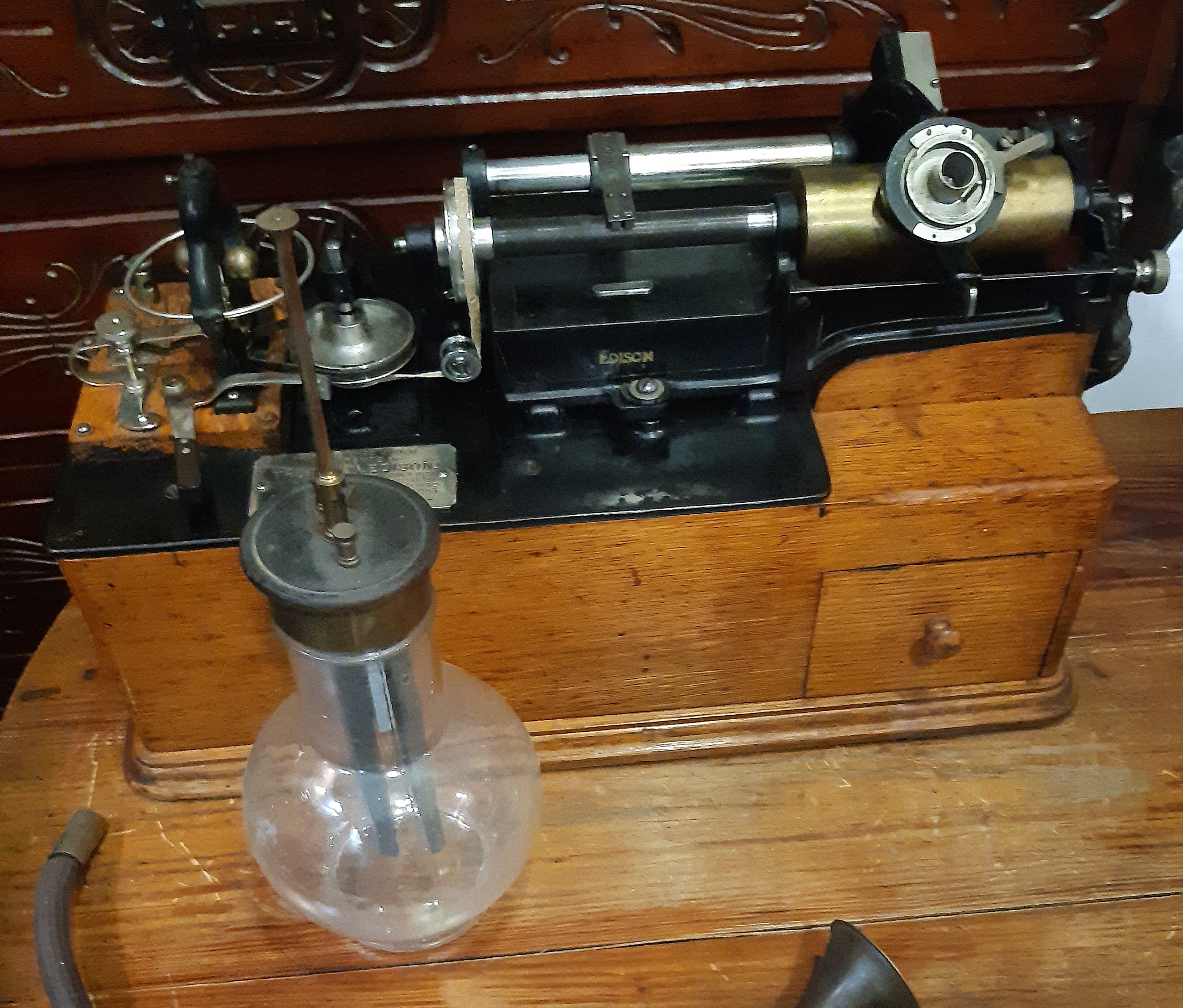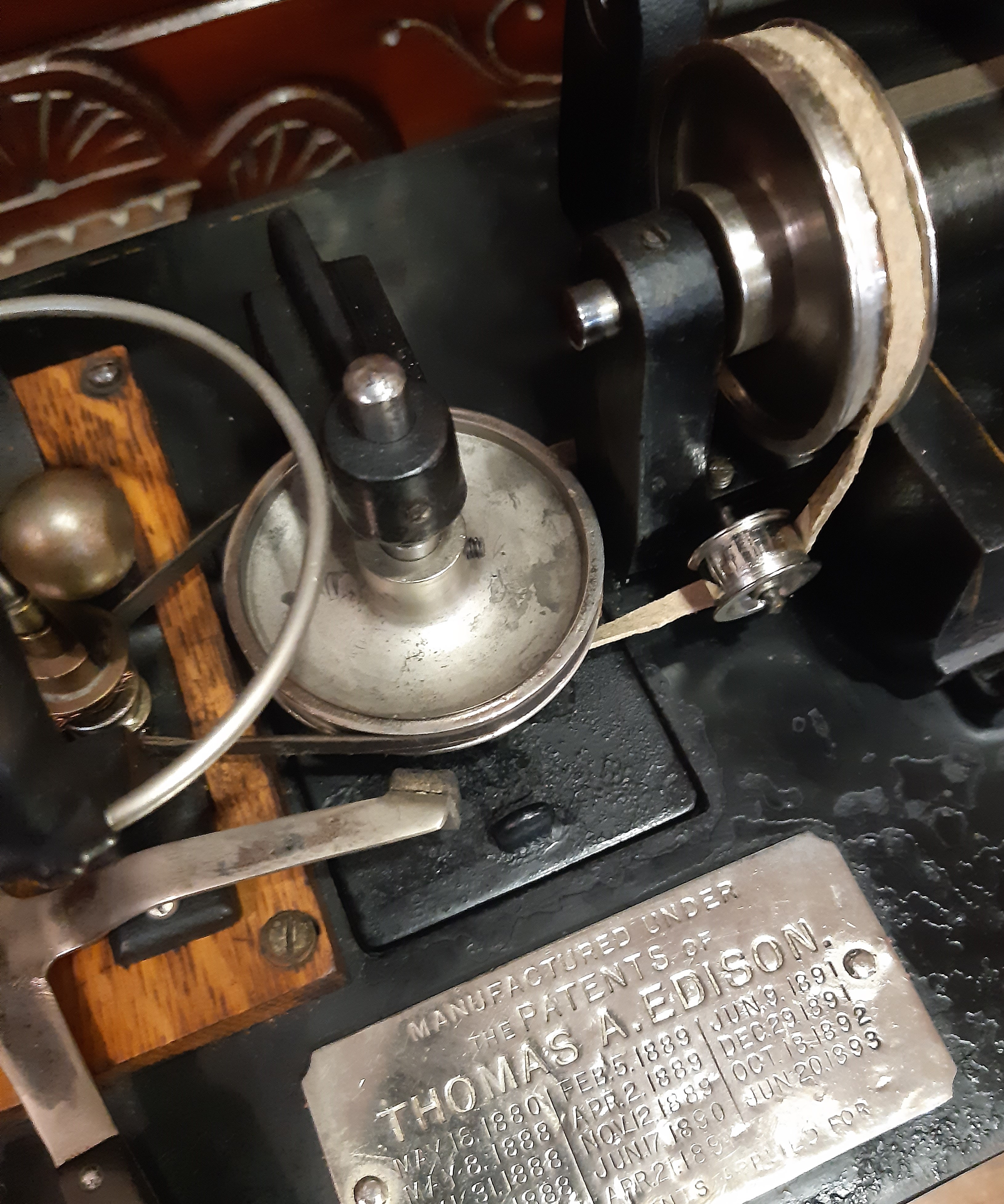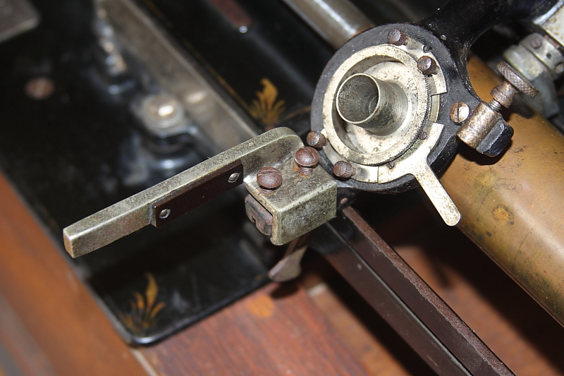 Jerry, the two empty holes at the top of the carriage were meant for a positioning wire (front) and its set screw (rear). This wire and the post seen on the Standard Speaker's tube plate were used to ensure the proper positioning of the cutting jewel with a speaking tube, and the reproducing stylus with a listening tube. Notches in the ferrules of the speaking and listening tubes prevented accidentally mixing the devices. These vestigial features are sometimes found on later machines due to the recycling of Edison Class M upper works.