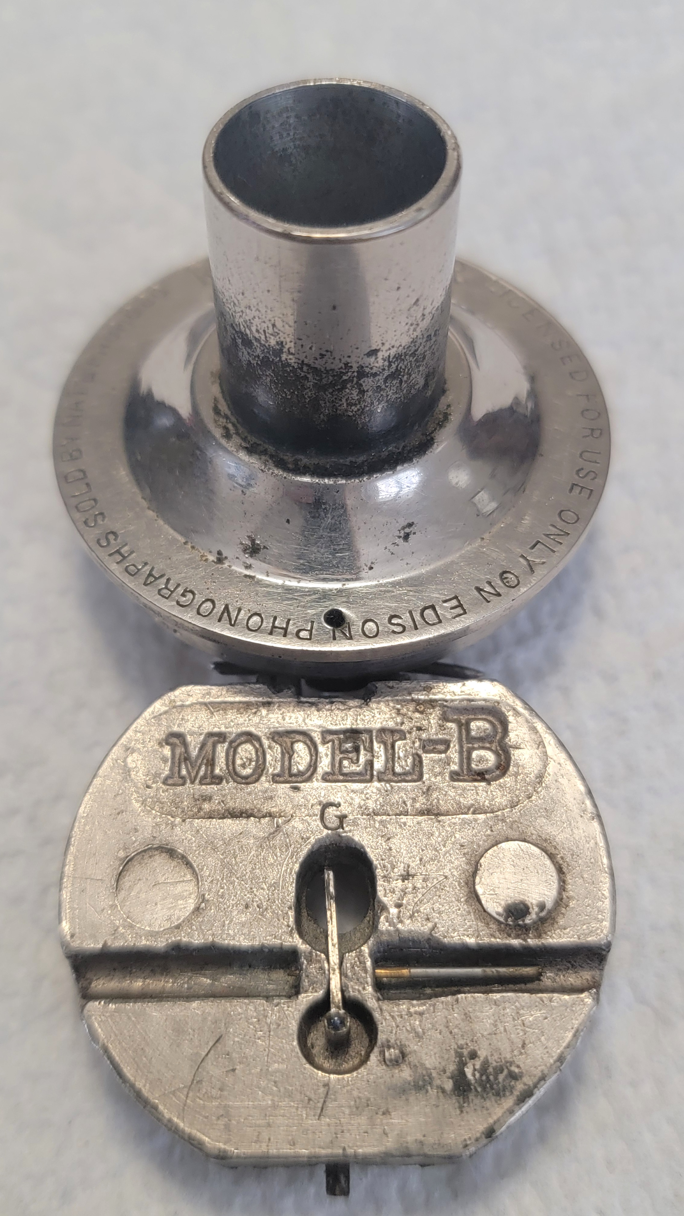 Well, the good news is, it has the correct reproducer. The bad news is, someone has kind of butchered it up. Appears that the diaphragm is missing or broken and the housing has had a big notch filed into it, for reasons unknown. The stylus looks as if it may be good, however. The weight, (that has Model B cast into it), should not be able to hinge open as far as it does. This is indirectly due to the filed-in notch and the loss of connection between the diaphragm and the needle bar, (stylus bar).
