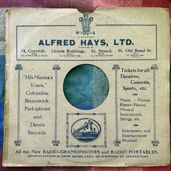 The two brass eyelets on the cover suggest that it was designed to fit in an album. Many retailers offered albums free of charge to purchasers of a given number of records.