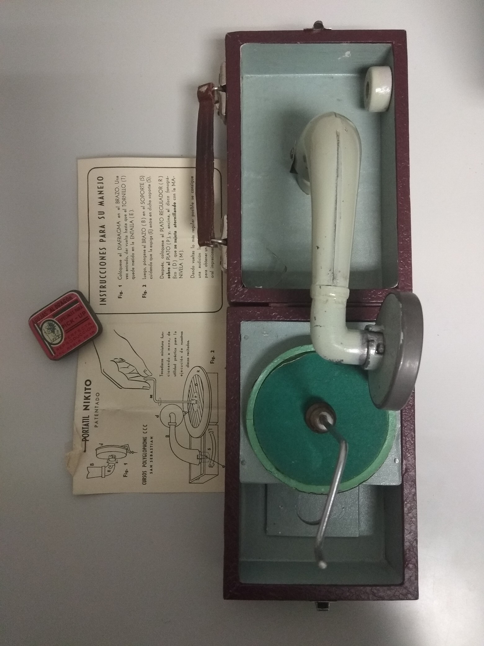 The records in the 78rpm era were made by our independent Columbia co. They gave for free (as said) this little hand propelled phonograph for listening to the records, as said in some websites, made by Nikito, designed by Josh Toreno, measuring 17x11x9 cm, when you acquired a language learning course. With things they also sold other more conventional portable gramophones.
