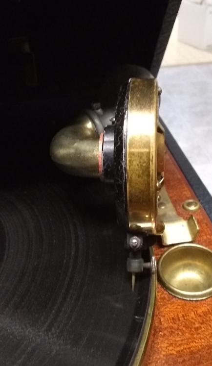 4a) If yours is like mine, it is not one of the truly great reproducers, but it is surprisingly a very good one, sound-wise anyway. It performs well, accommodating most electrically recorded shellac records. It has an aluminum diaphragm. On some reproducers, the diaphragms are riveted into place. If yours is riveted, there isn’t a lot you can easily do to service the reproducer other than putting a tiny drop of oil on the pivot points of the needle bar (the assembly that holds the needle and connects to the diaphragm). If your reproducer comes apart with screws, it might be possible to replace gaskets in it, but with a 1940s machine this might not be necessary (yet).
