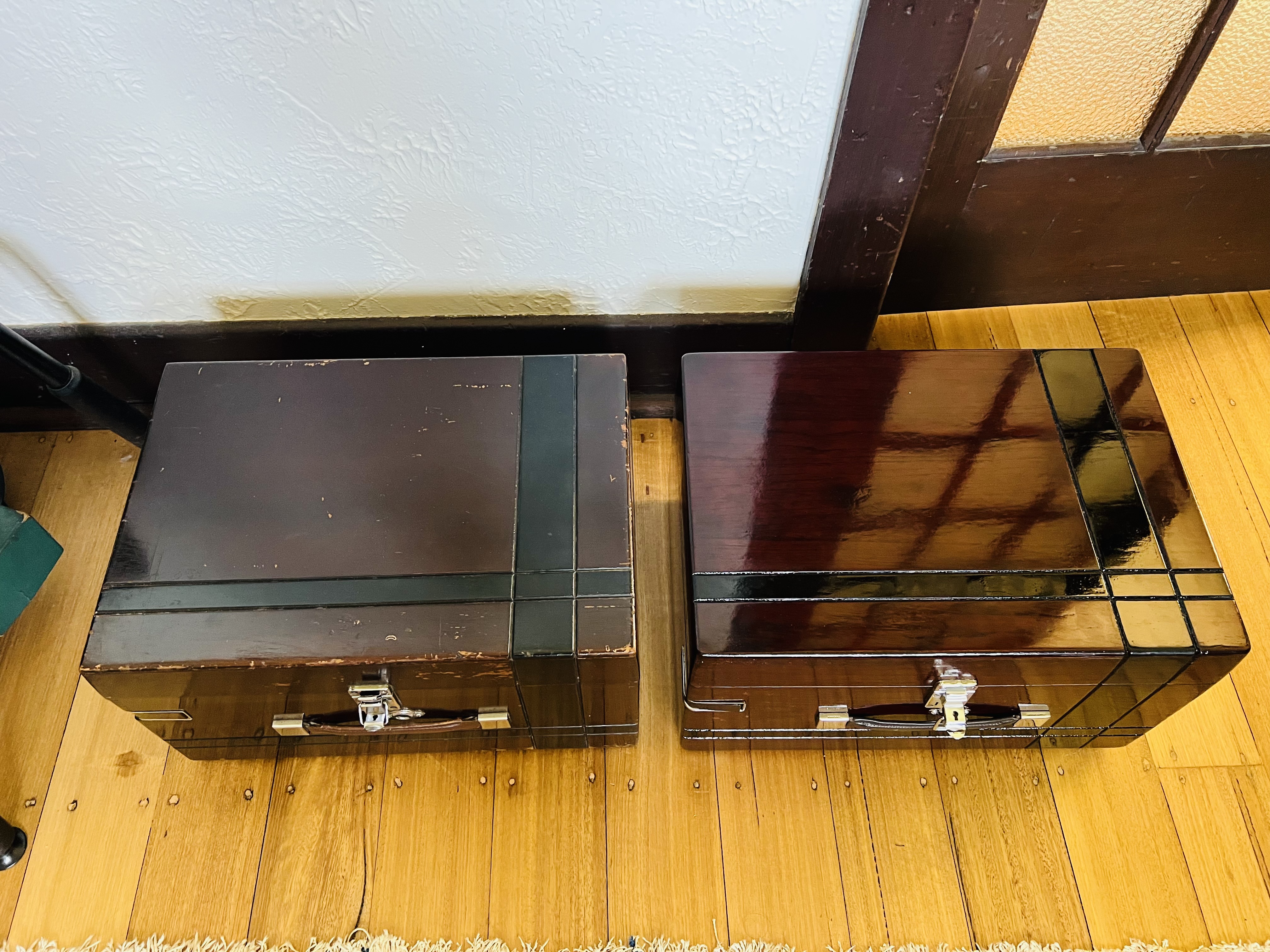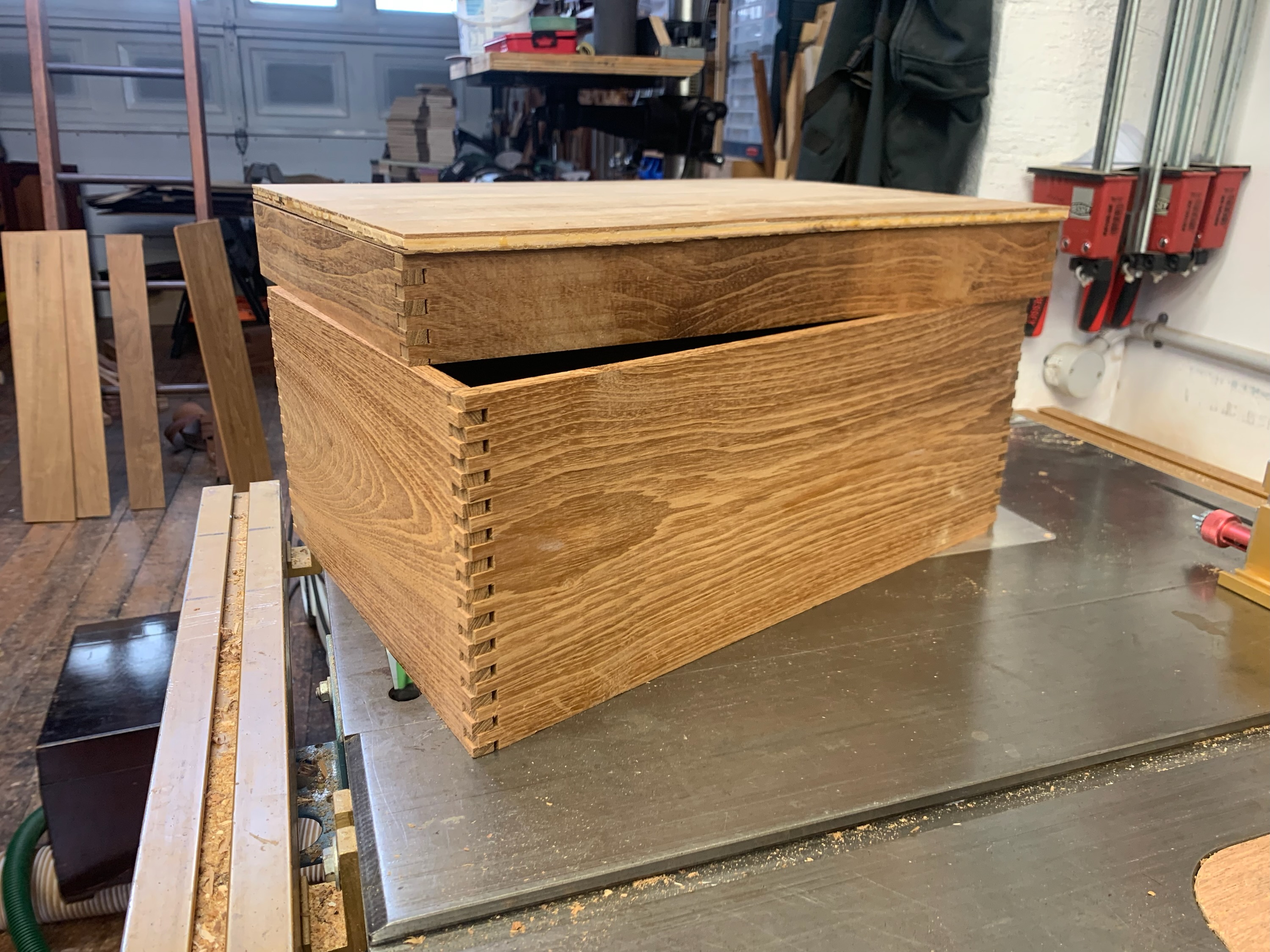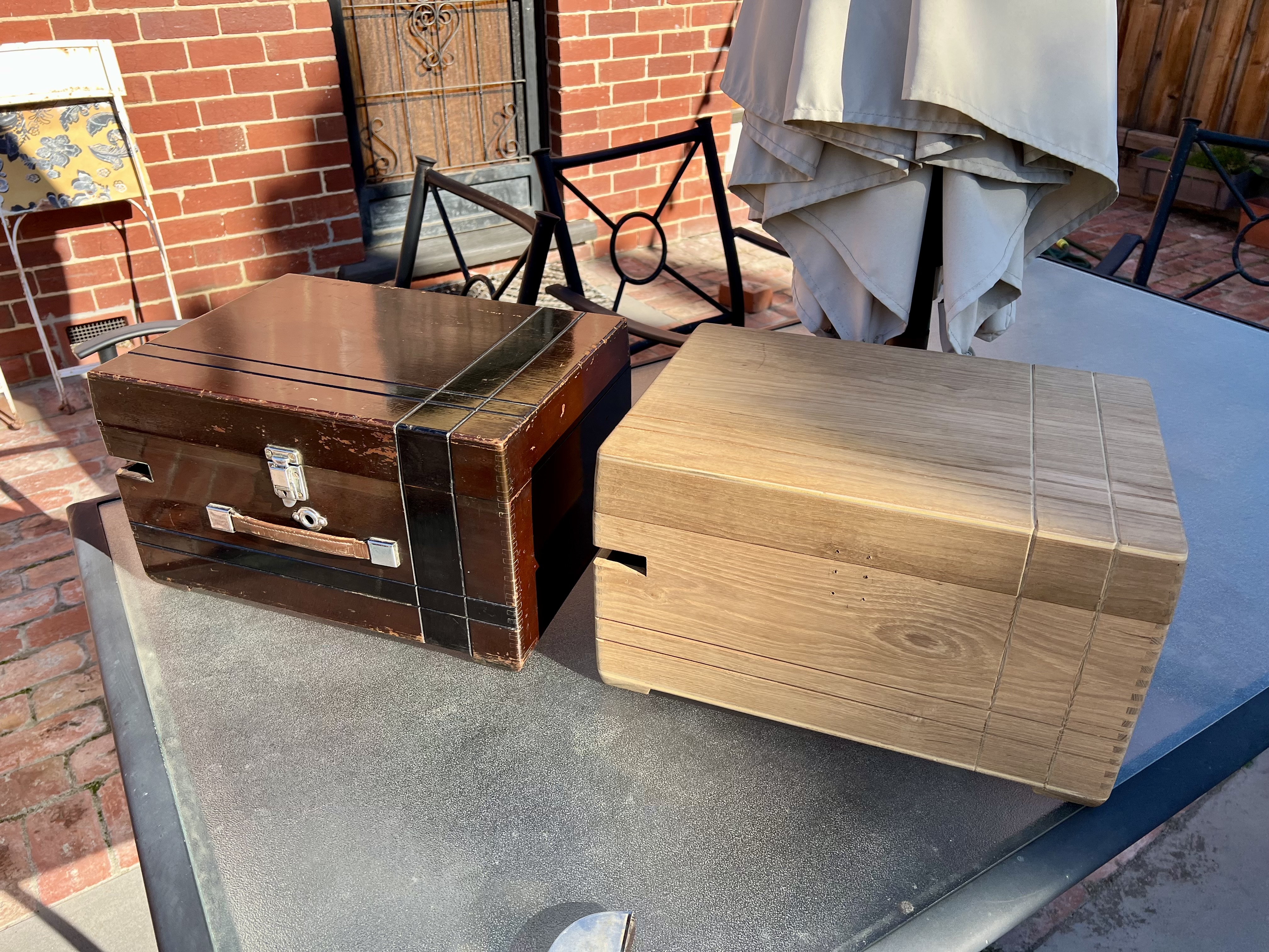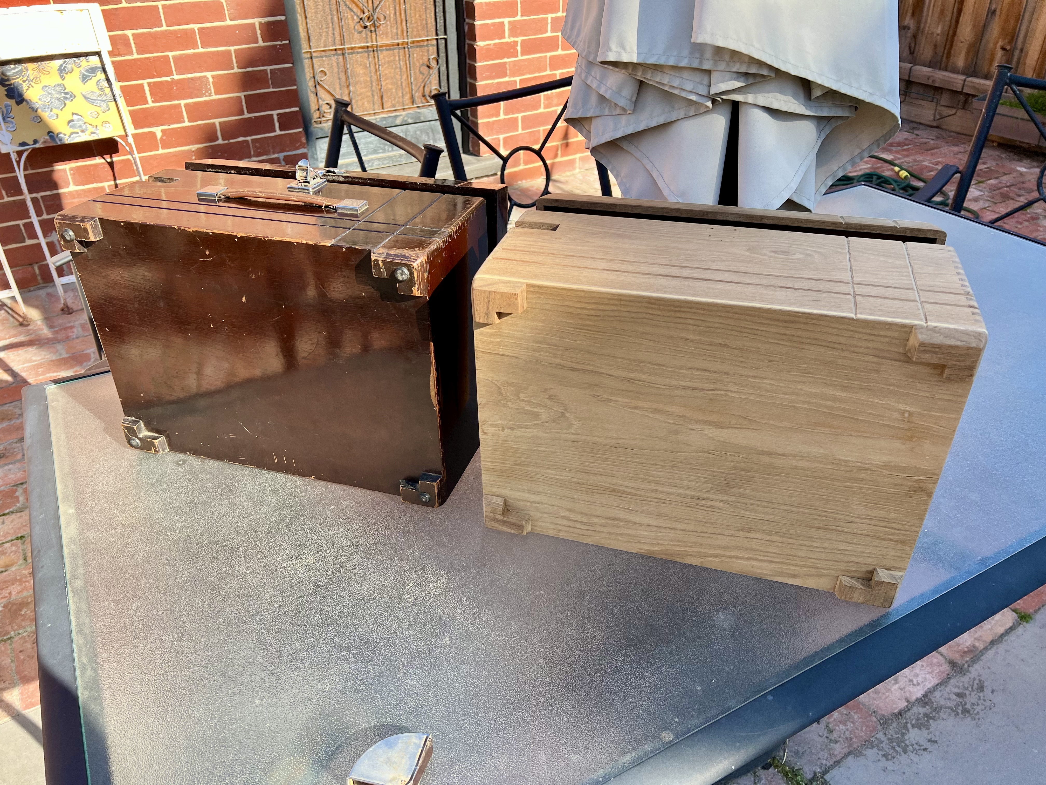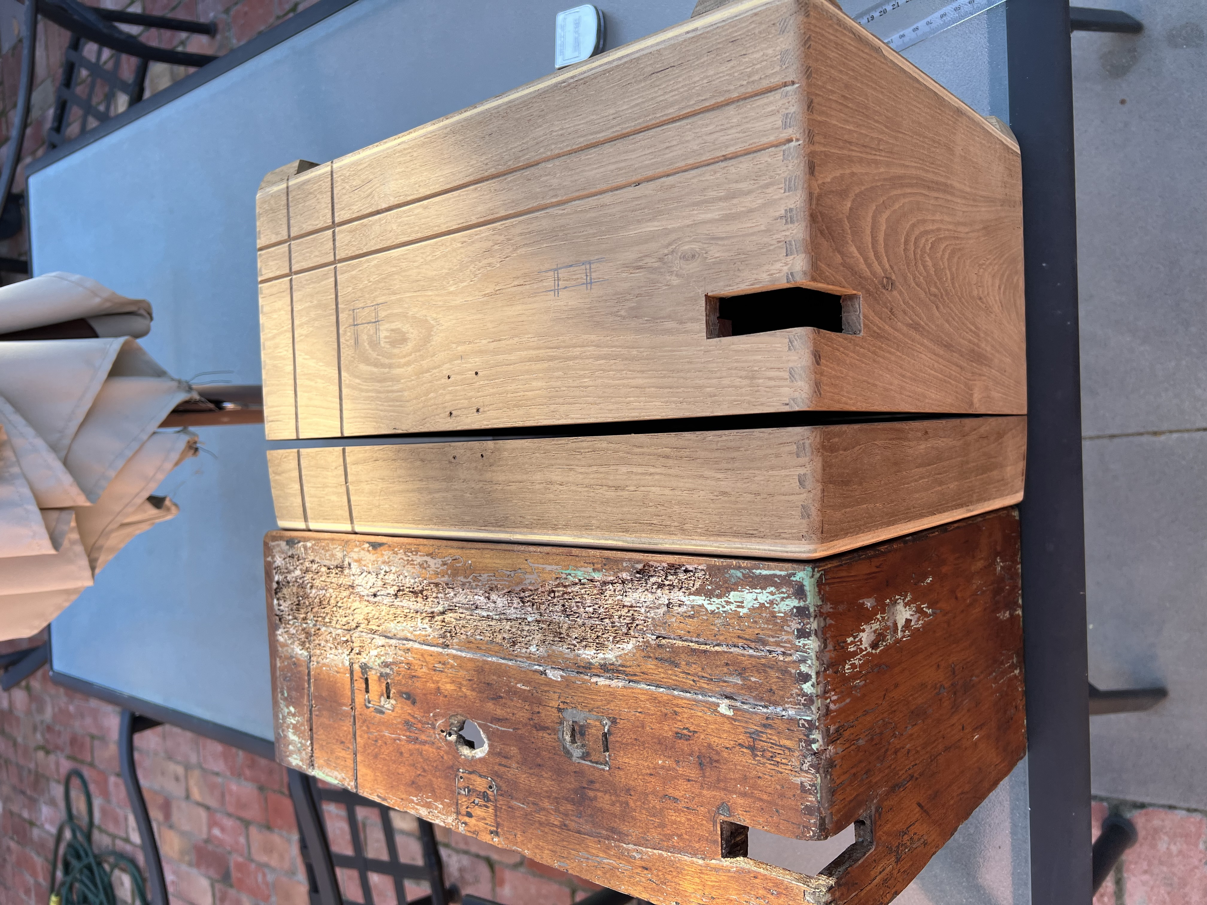 New case finally made out of a slab of 1930’s Burmese teak. Correct wood for the 118 case. Top and bottom are made from teak veneered plywood just like the original. I couldn’t find a way to exactly replicate the pattern of the original extremely narrow finger joint used on 118. This is the closest possible pattern with modern tools available here in Australia and the result is quite close to the pattern used originally on early front wind teak 101’s.