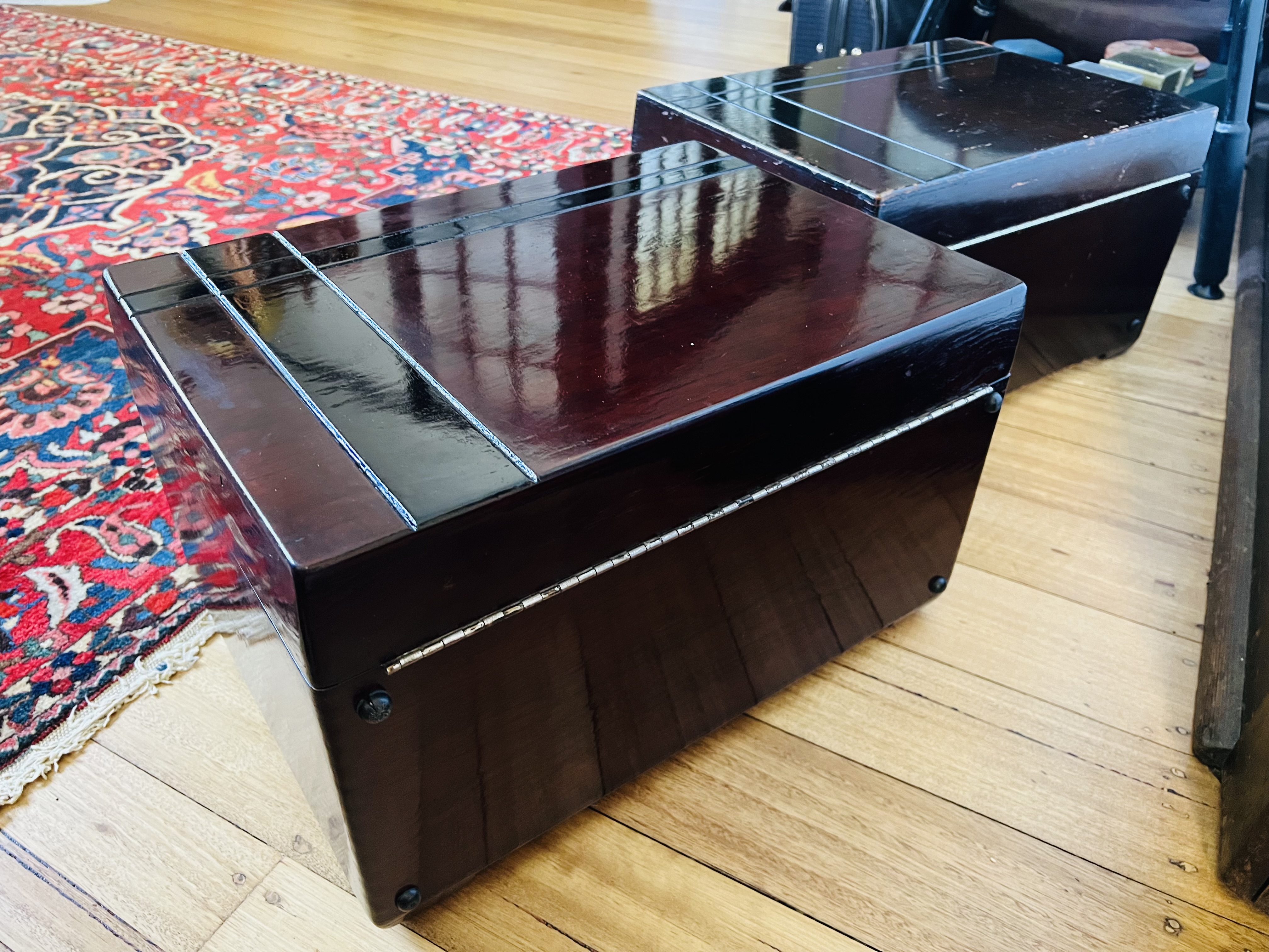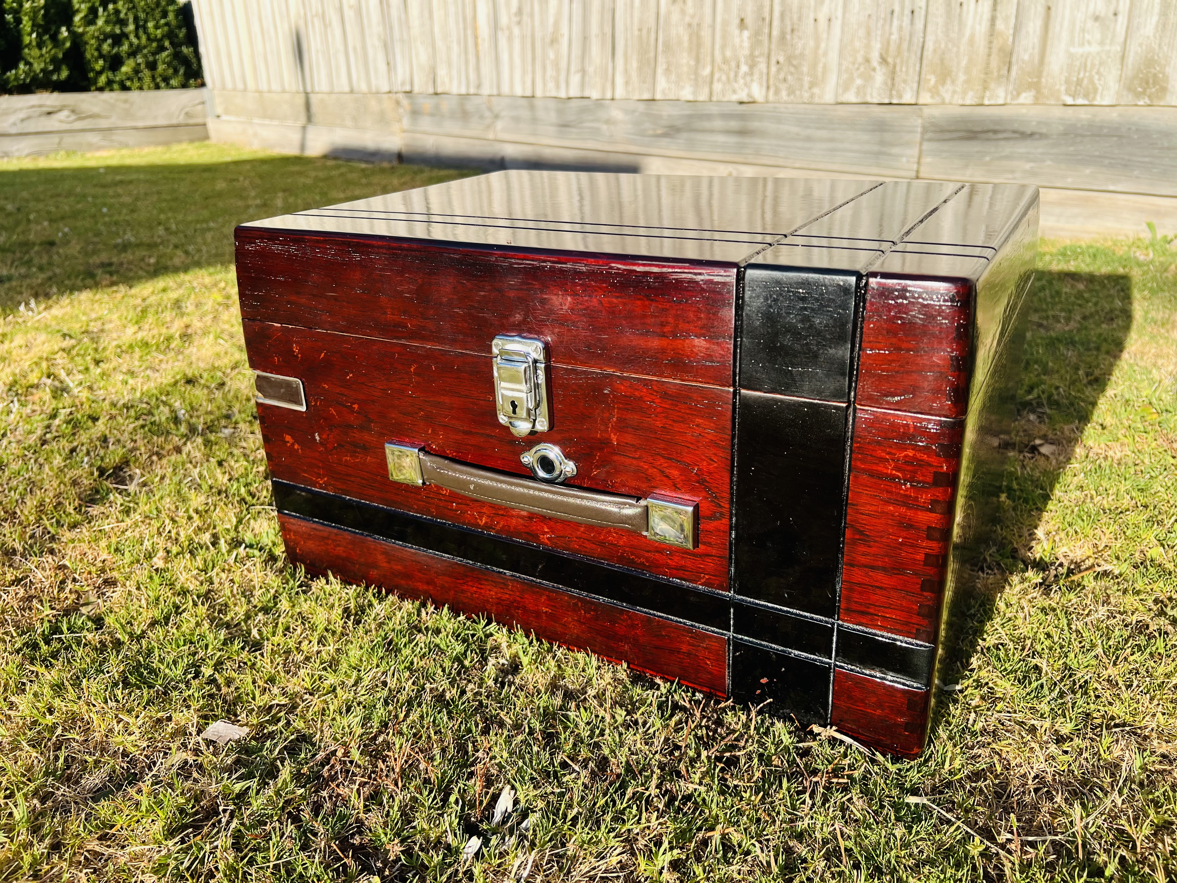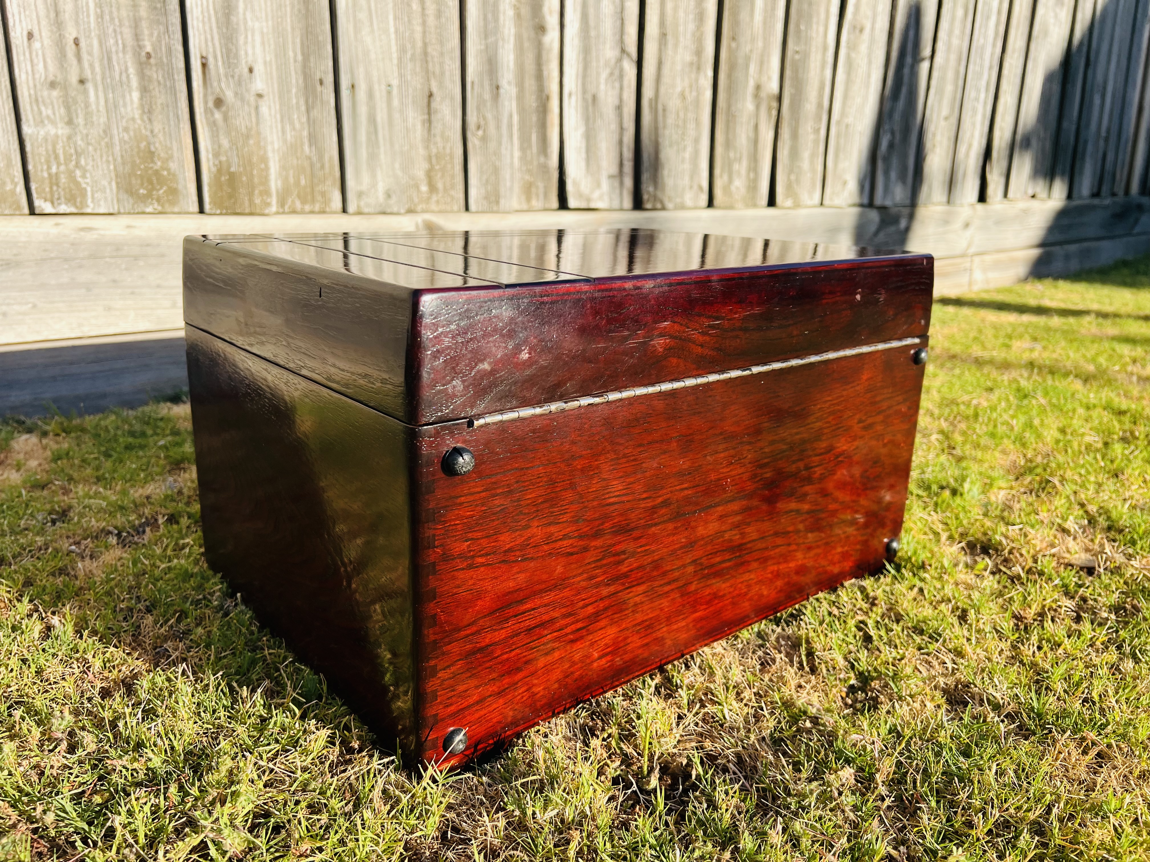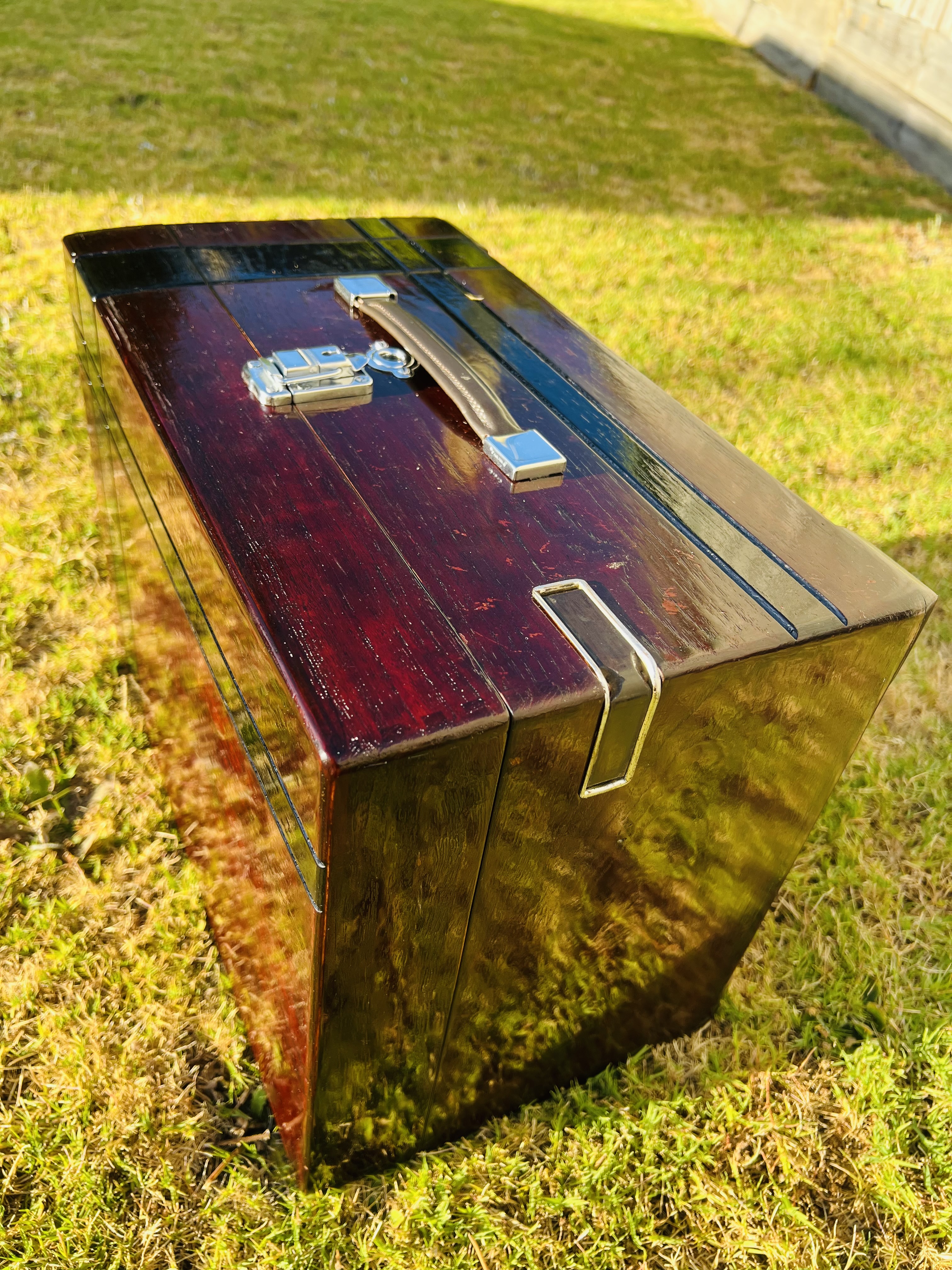 Mahogany tinted teak. Next step is filling the grain with pumice and french polishing to mirror finish. This is not the final colour yet. It is gonna get deeper and more even. Black bands is the final touch then.