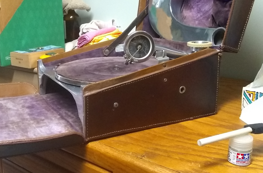 While I was struggling with winding the machine yesterday (being largely of somewhat light weight aluminium and cardboard/leather-laminate construction and having slippery metal feet, there are challenges with winding), it suddenly dawned on me why the rexine and cardboard were so badly damaged down in front by the reproducer. I very consciously have to stop myself from forcing my hand down there to stabilise the machine while winding--it is the place the left hand just wants to go to.