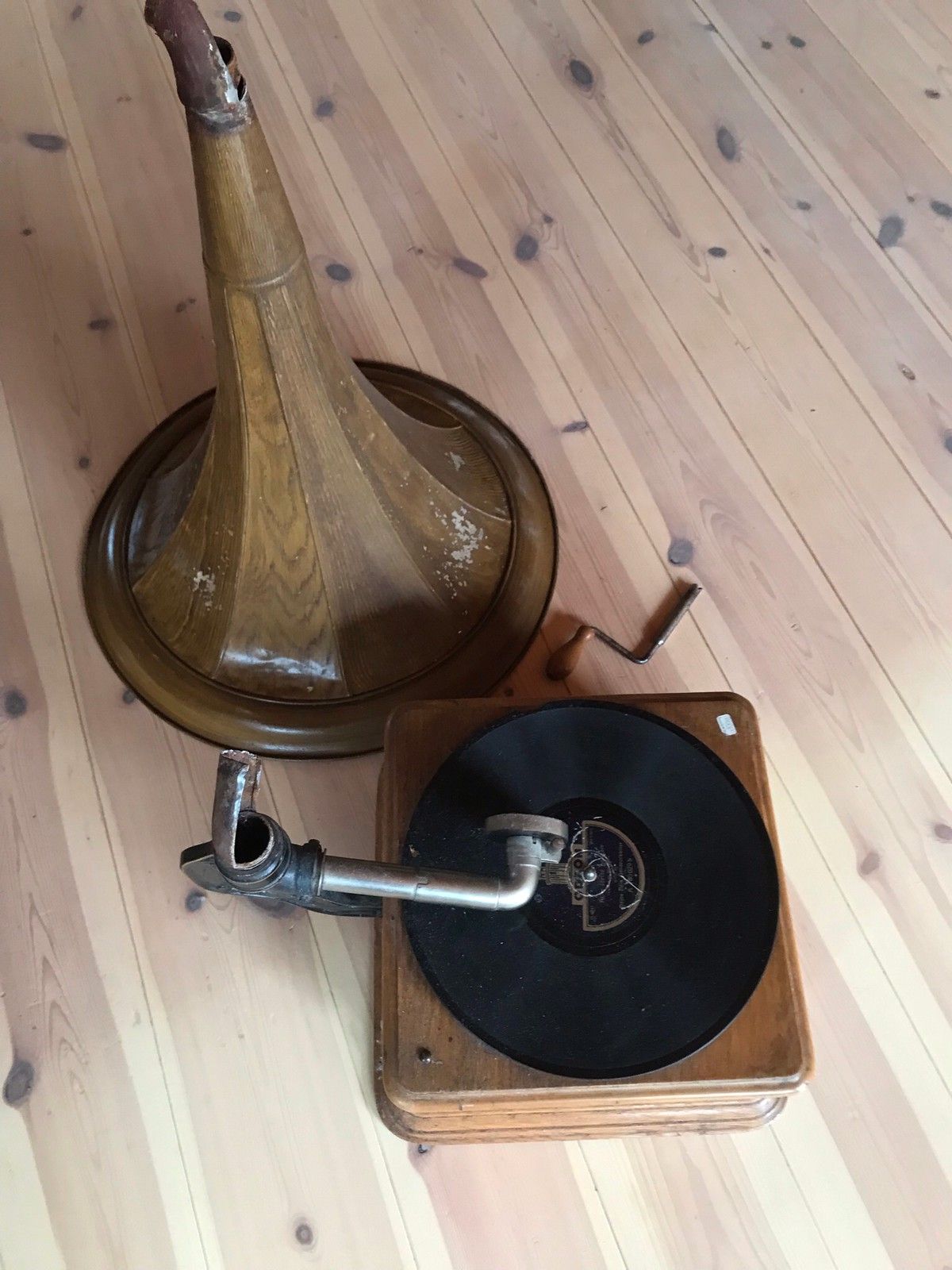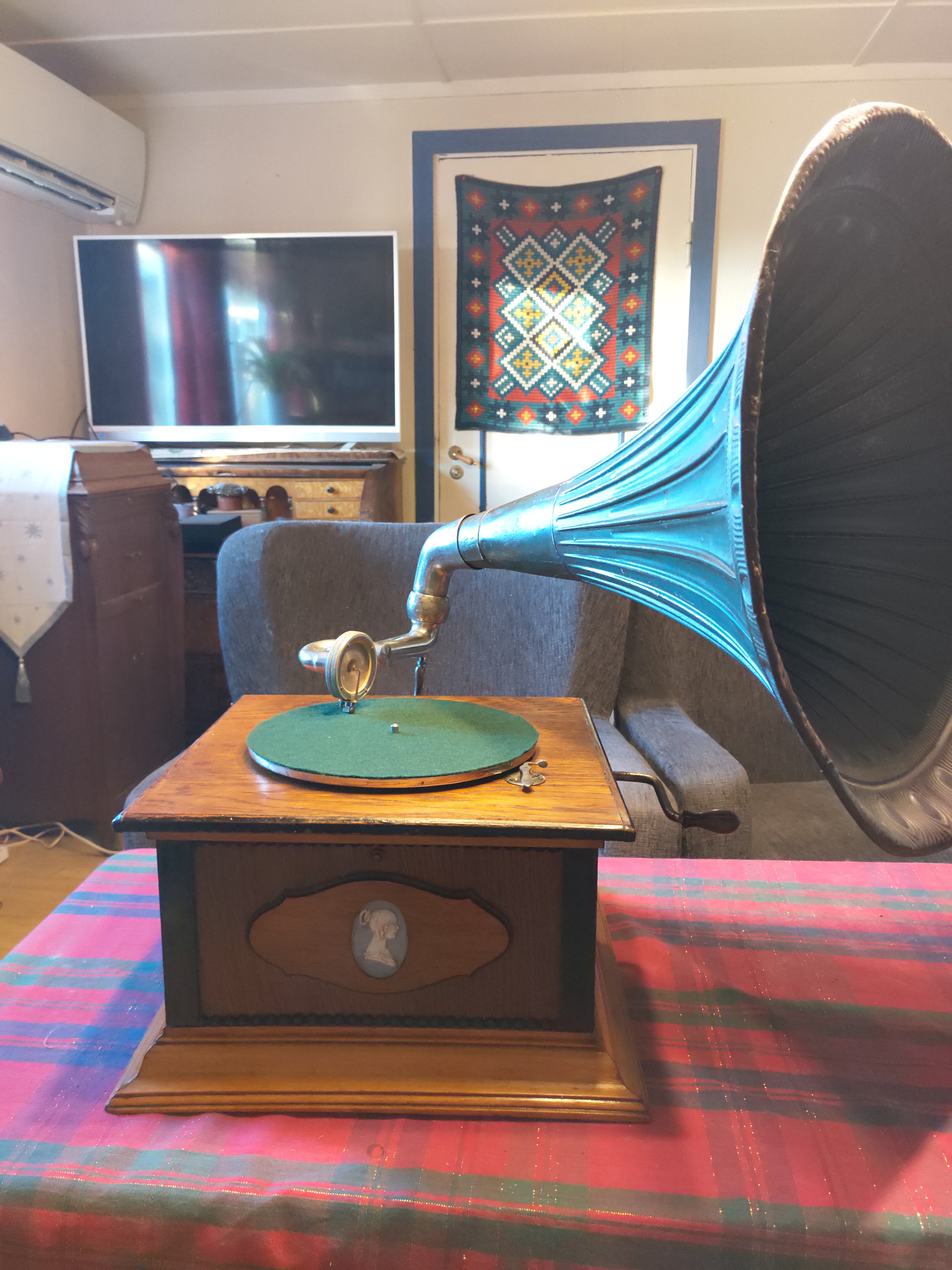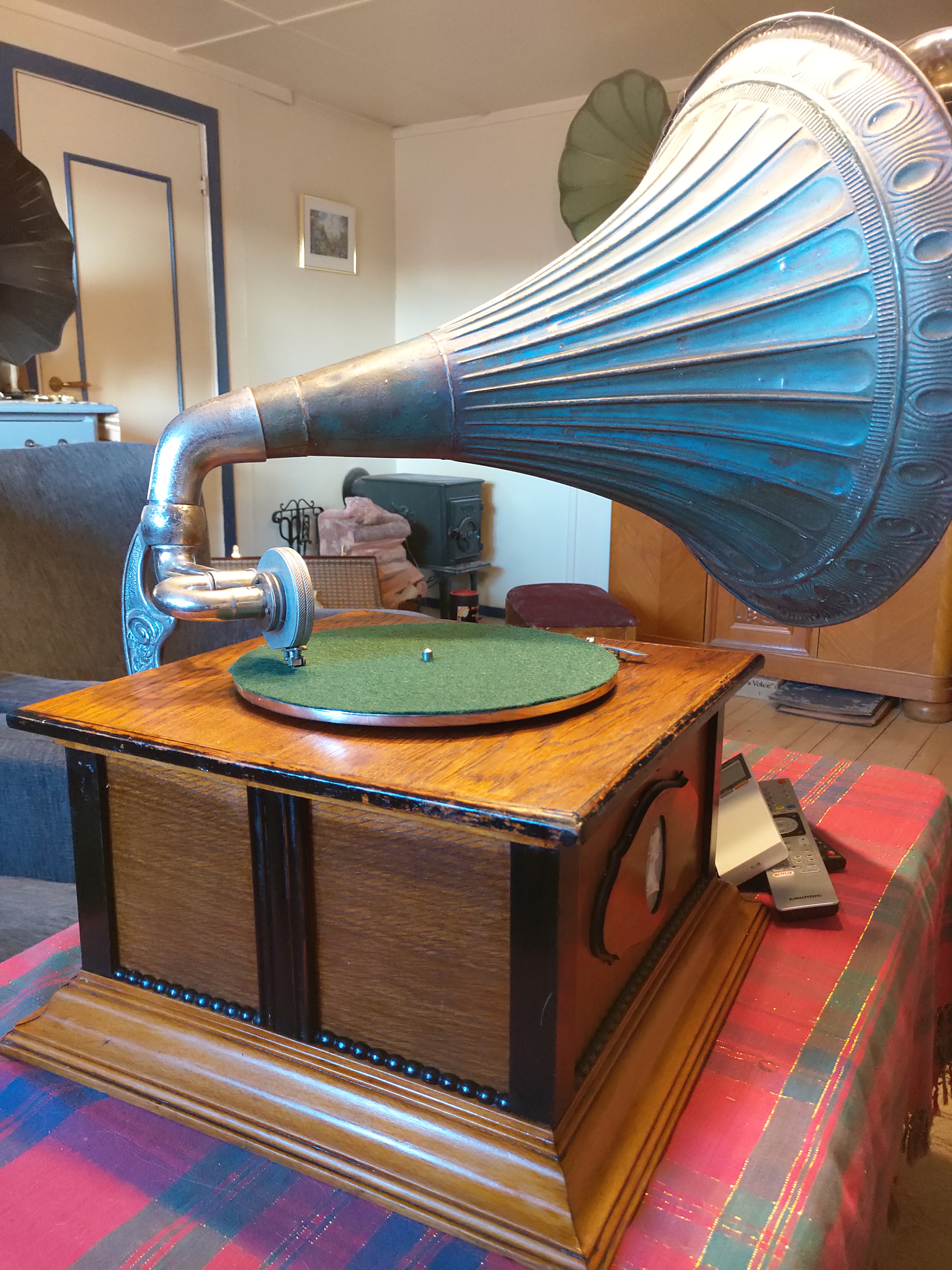 I am posting some new photos of the horn gramophone that I bought about one month ago. It had issues with the motor board, and I have been able to straighten out the motor board, by using a warm clothing iron, and a wet towel, on the inner side. It only took a few minutes to straighten out, and I then clamped the motor board for 3 hours as well as drying it with a hair dryer for some minutes after the procedure. I thought it could be interesting to see some before and after photos, so I also re upload some photos of how it looked when I bought it.