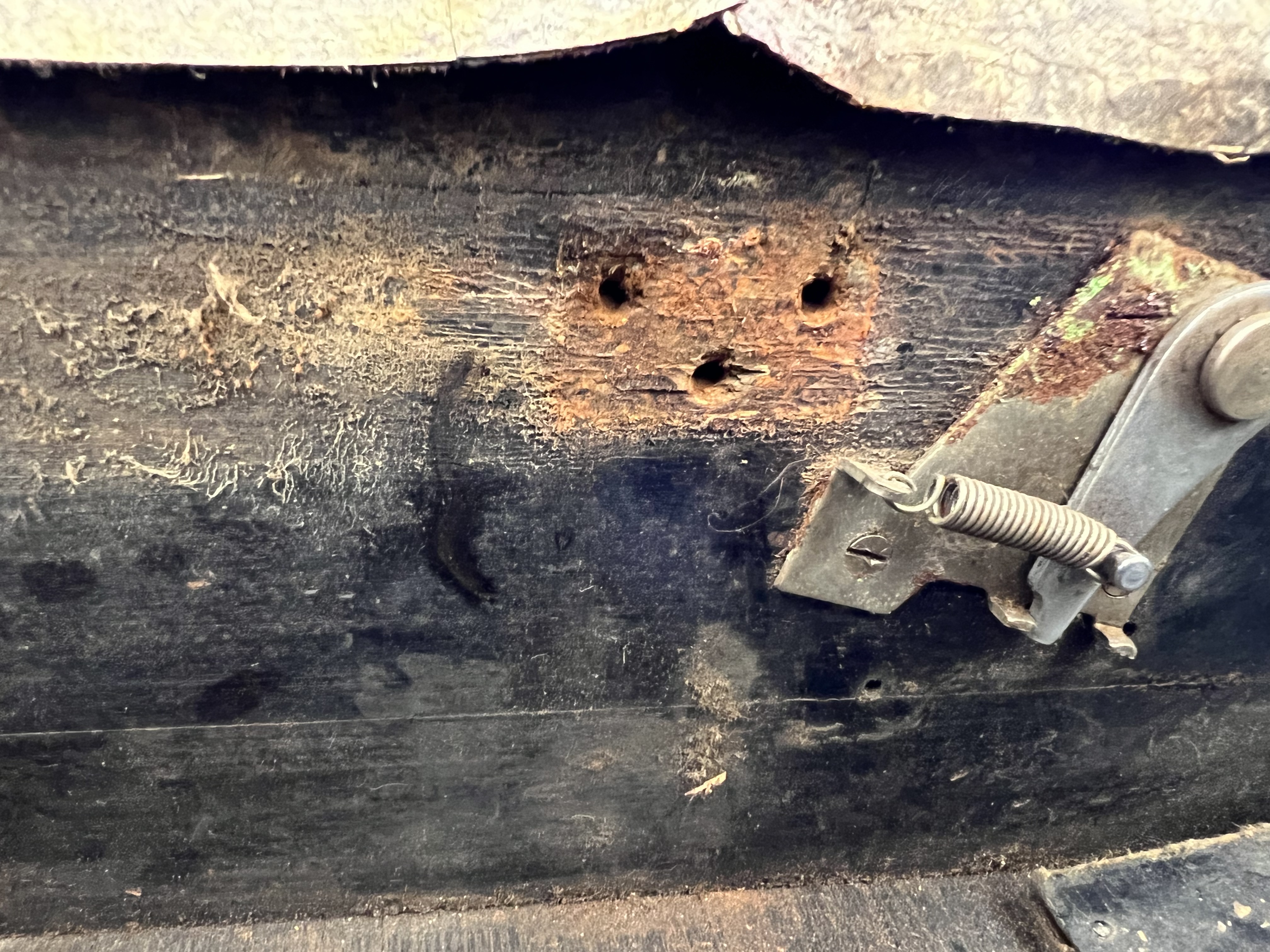 There’s a ton of damage to the case. None of it irreparable, but it will need re-covering or painting, or otherwise covered in some sort of thick veneer.