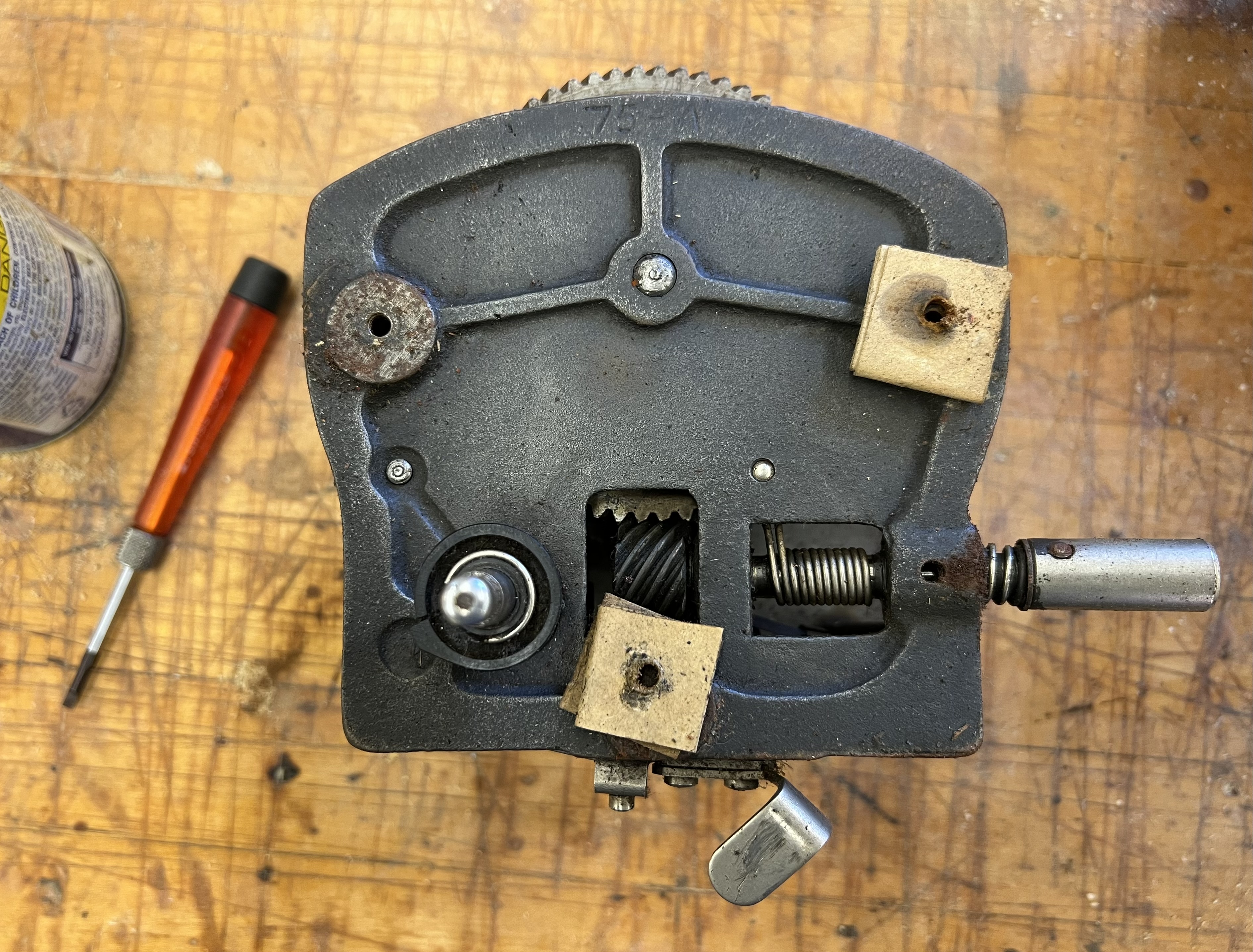 Also some slop in the pivots. Hopefully I don’t need to install new pivot bearings somehow. The gears have some wear, but not excessive, and the fibre gear looks to be in good shape, so maybe there is hope. It does spin when I give it a few turns on the winding shaft. The marking “75-A” is cast into the top plate. Has all the hallmarks of a garrard motor, including the interior mounted governor weights. Perhaps it will still run properly and quietly once cleaned and adjusted?