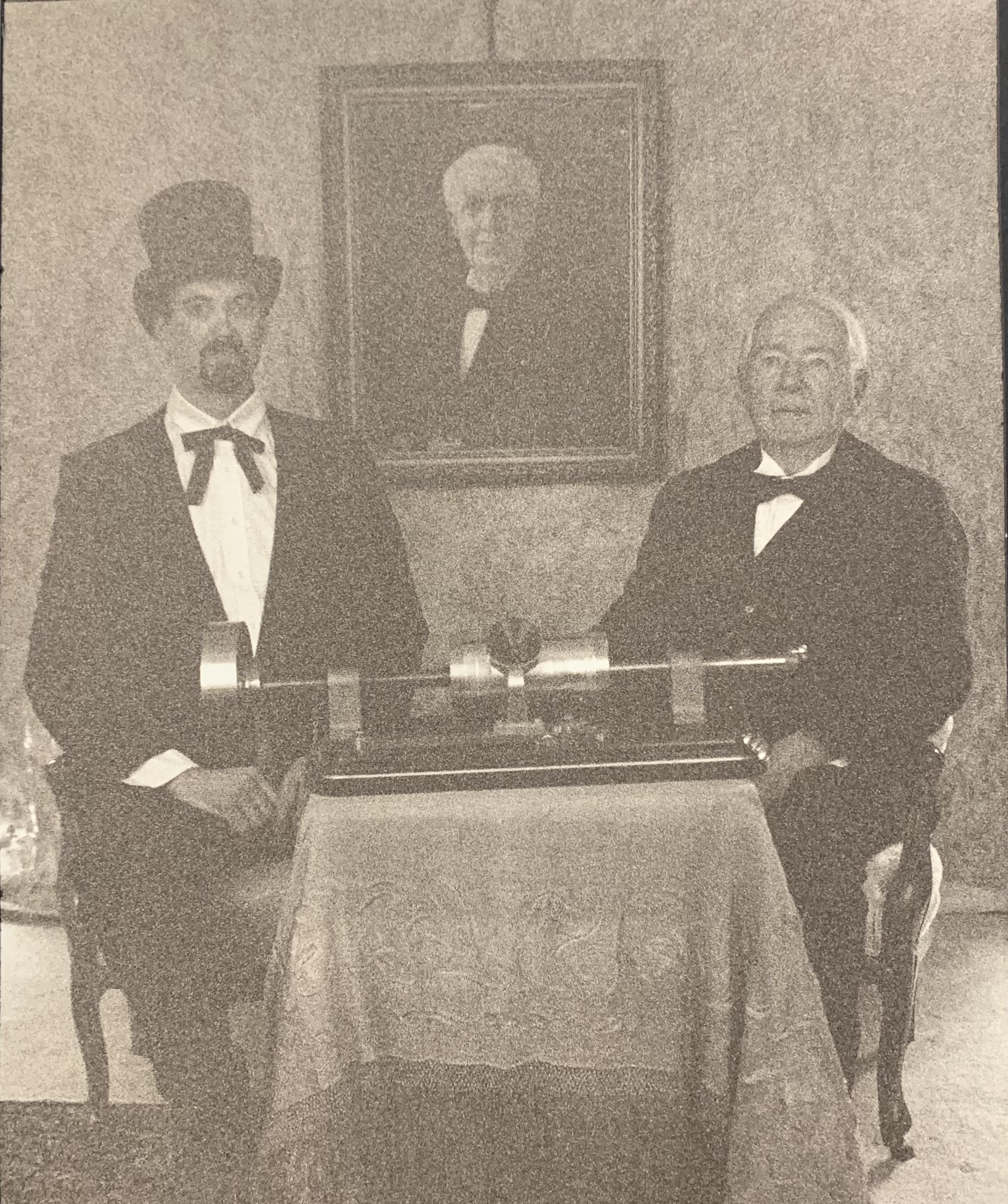 This is a picture from 2005, and while not necessarily very old, it includes noted early collector Ray Phillips, who started collecting in the 1930’s! In his later years, Ray rather resembled Thomas Edison. Our local chapter of MAPS, the Golden State Phonograph Society, or GSPS, got together at Ray Phillips home, in Studio City, CA. Nestor Guzman’s daughter is a photographer, and with the help of Scott and Denise Corbett, and Michael Khanchalian, we had vintage clothing, an original tinfoil, belonging to Ray, and an original portrait of Edison, along with the gentleman himself, Ray Phillips, to each pose for a picture with. This is how mine turned out. Mike Sorter, left, and Ray Phillips, right.