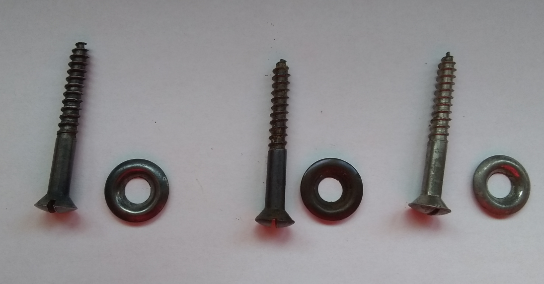 I found four Aeolian-Vocalian woodscrews with their countersunk flush mount washers. They were a bit rusty, so the seller kindly gave them a rust remover bath and a bit of a clean-up. Unfortunately, the removal of the rust also removed all the gunmetal bluing.