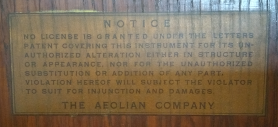 Of interest, my A-V has the original Graduola retainer intact if somewhat bent out of shape. It also has an interesting legal warning from the Aeolian-Vocalian Company glued to the back of the cabinet.
