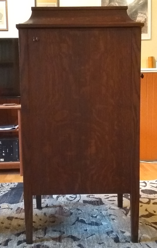 I am using Gibson guitar polish to clean the cabinet. It is safe for varnish, nitro, shellac, tung oil, and poly finishes. The grime is slowly disappearing and the finish is coming alive, richer deeper colour and more definition in the figure of the quarter-sawn oak.