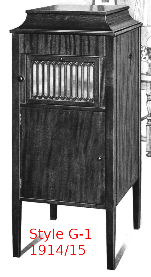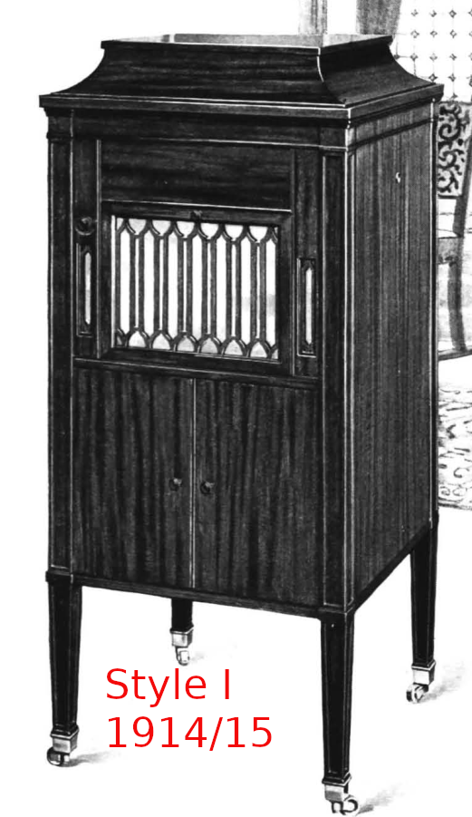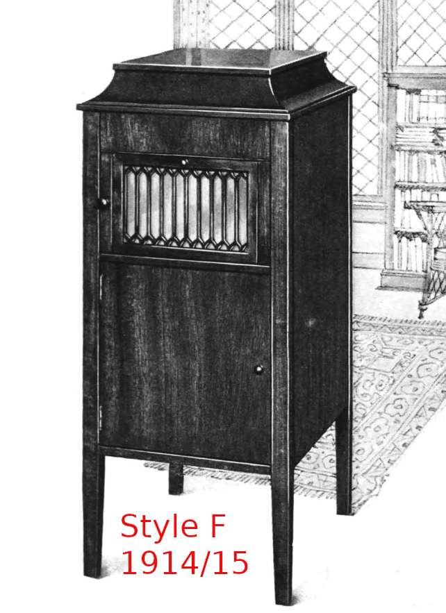 There is a work-tracking tag from Nashville, dated 22-Aug-20, which I found inside my A-V case and which suggests that the case is a Style 510 in Fumed Oak (see above in this thread). A-V used letter designations for their styles in their 1914/15 catalogue, so is the 510 designation a type within a letter style? In comparison to the styles in the 1914/15 catalogue, my A-V has the basic plainness of Styles F and G-1 but with the double lower cabinet doors of Style H but without the decorative woodwork on either side of the horn aperture door of Style H and with the casters (missing from mine) of Style I but with less ornate ferrules on the legs than those of Style I. Built five or six years later, my A-V does not fit into the line up of the 1914/15 catalogue.