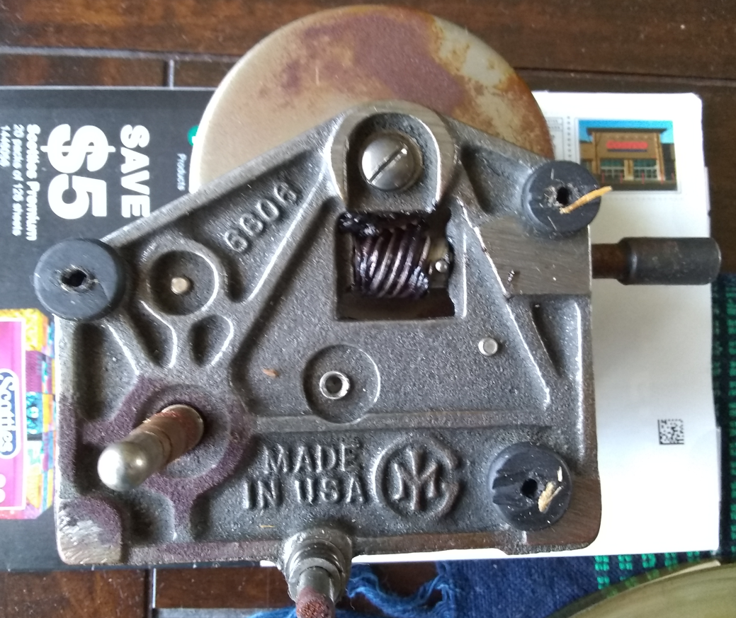The motor is a General Industries, single spring Junior. It appears to have been lubricated entirely with a black grease which has become a bit waxy/gummy but is still somewhat serviceable, at least as far as the coarser gears are concerned. It seems too heavy for the governor worm gear, though. Whatever is in the spring housing, away from the air, is probably still OK. The spring does not stick and makes no noise winding or unwinding. I will clean it up and re-lube it. I don't think I will bother with the spring for the moment, too much disassembly for something that doesn't seem to be presenting any problem.