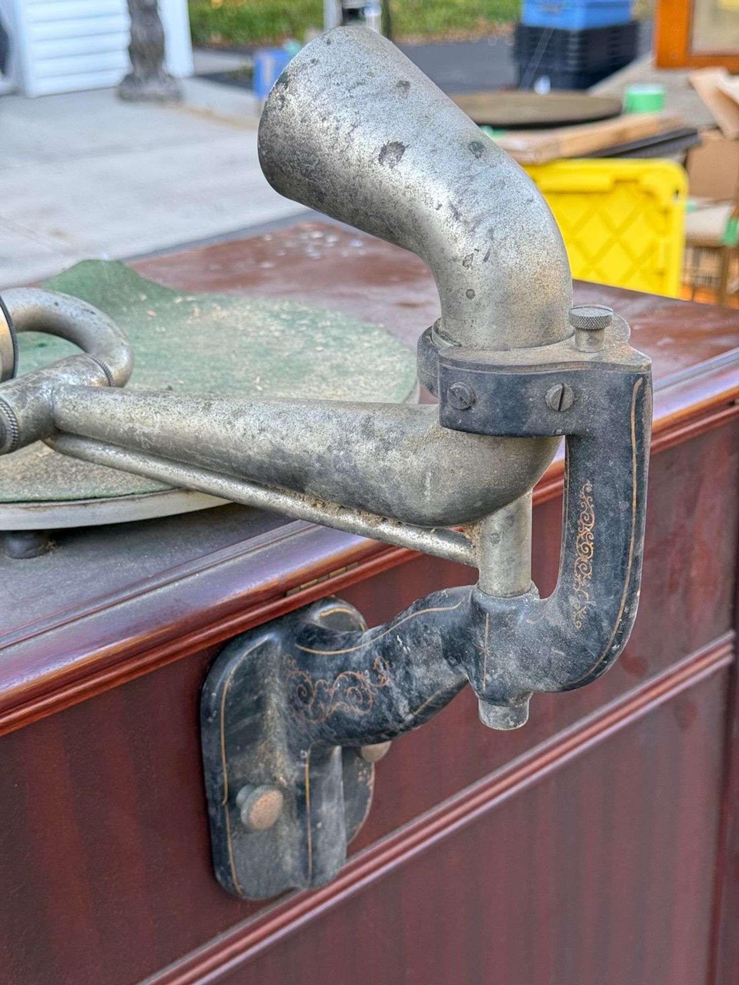 The cleaning is going pretty well so far. There is sun damage to the finish on the left side and door. The back and right side came out great with just cleaning. The back bracket, tone arm, and elbow cleaned up pretty well also. I will be working to bring back the sun faded left door and left side. The pump is sent out to be rebuilt. The motor also. I have been told that this is one of the four known Auxetophones that have the original motor and air pump. I will be doing what it takes to keep the original parts.