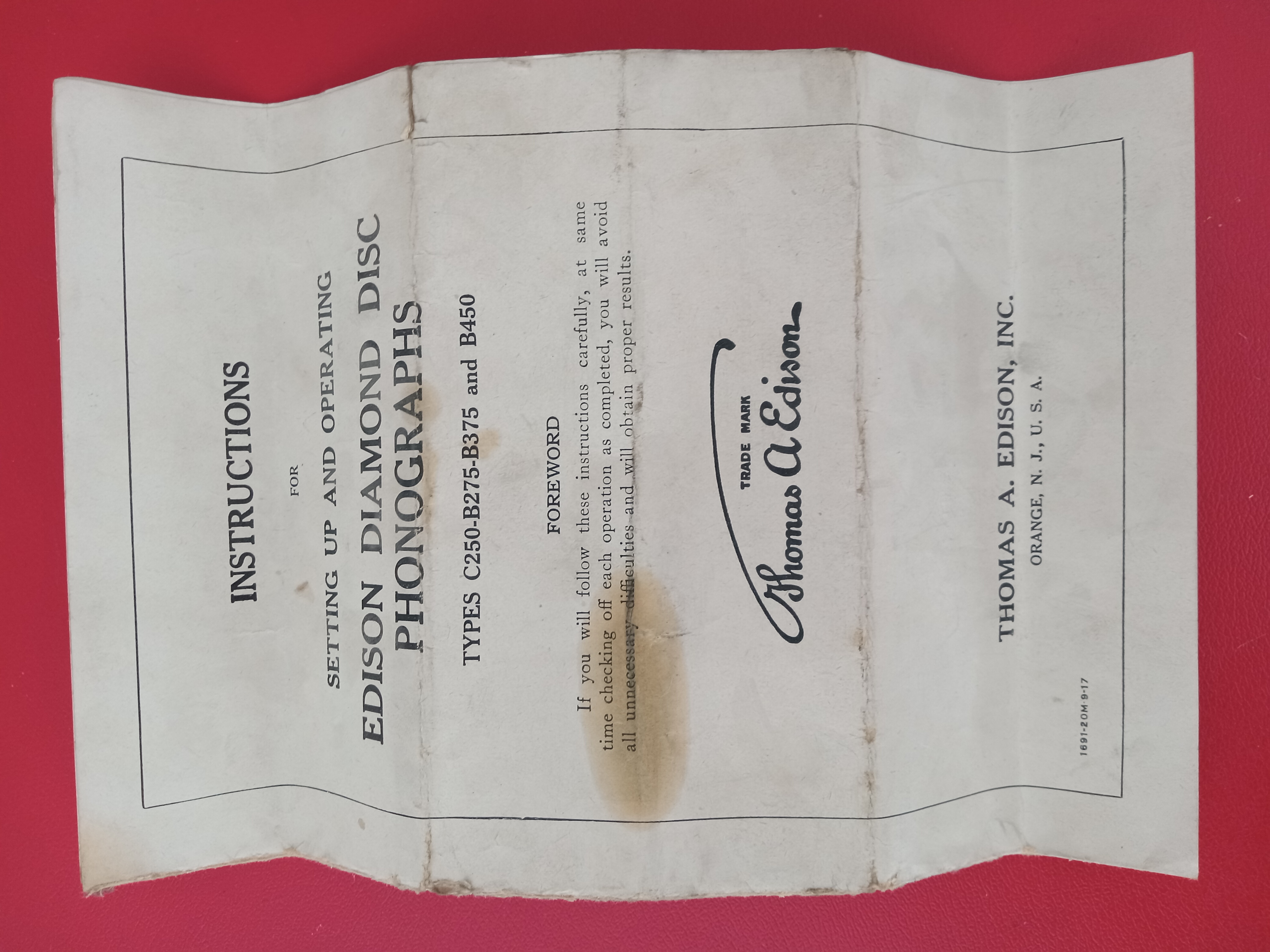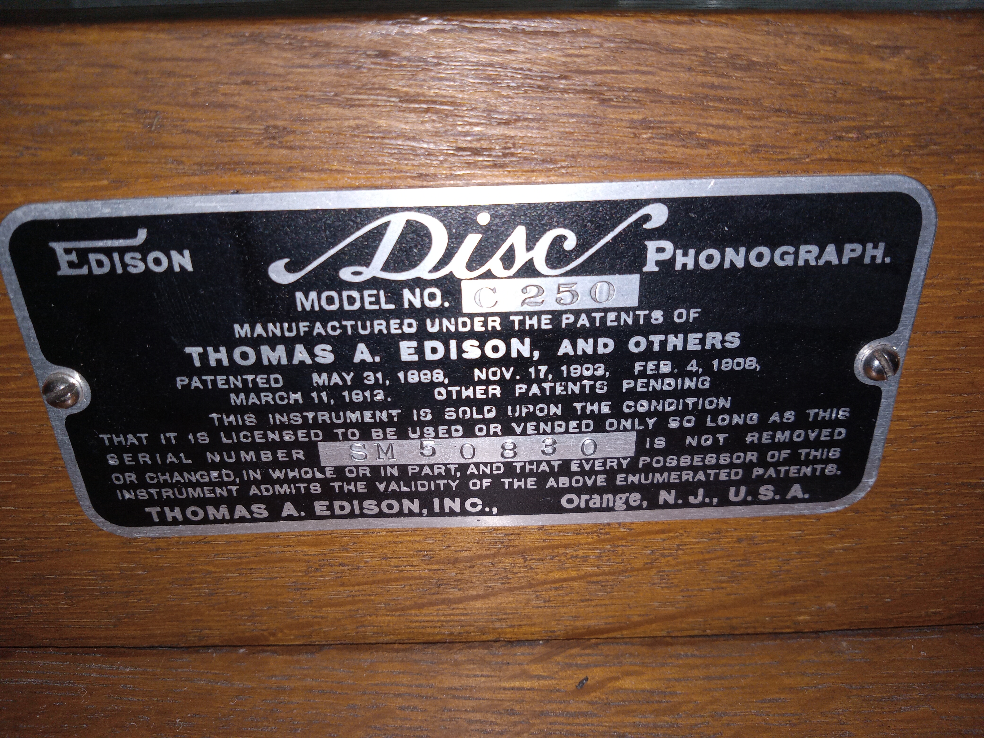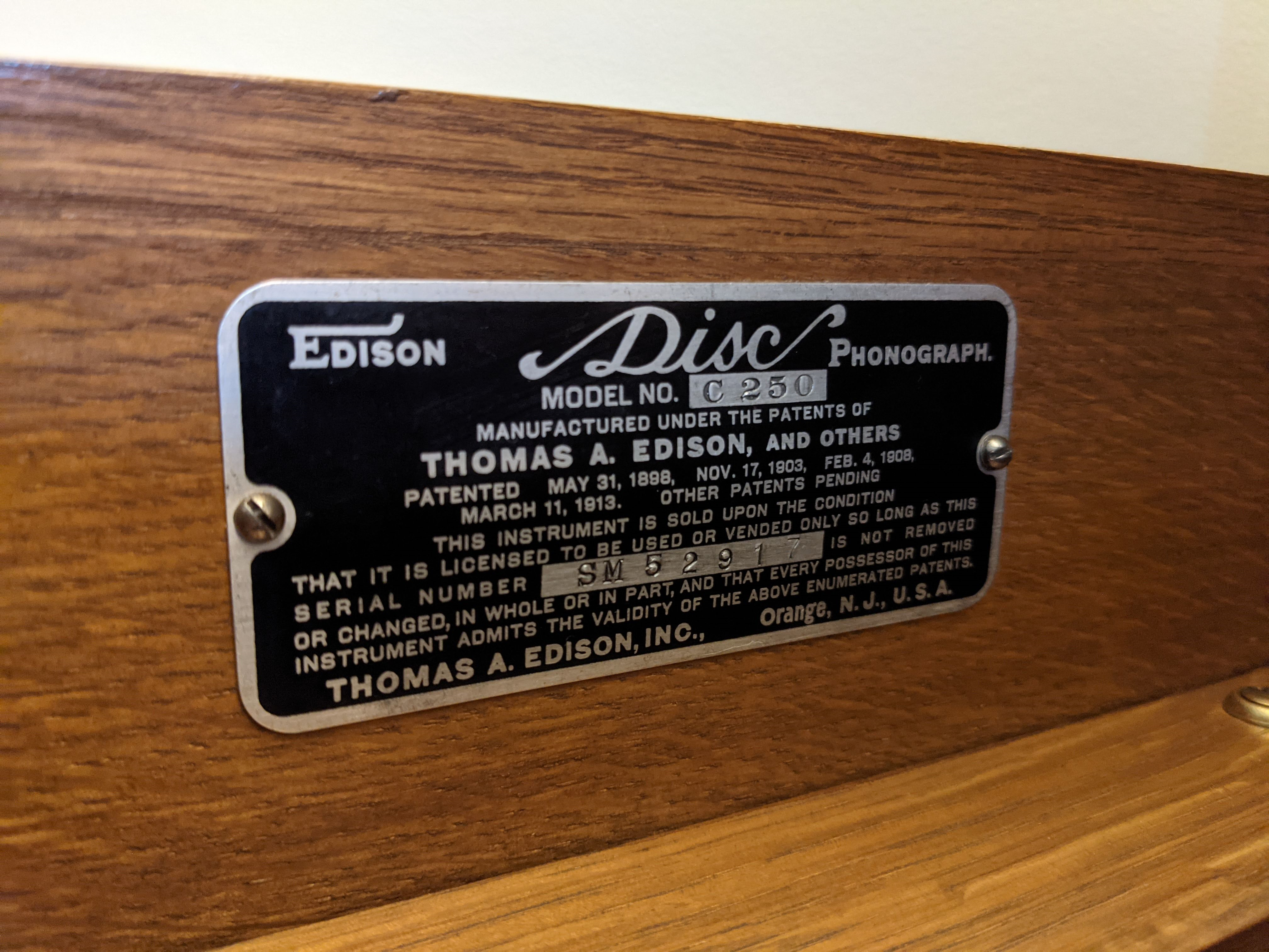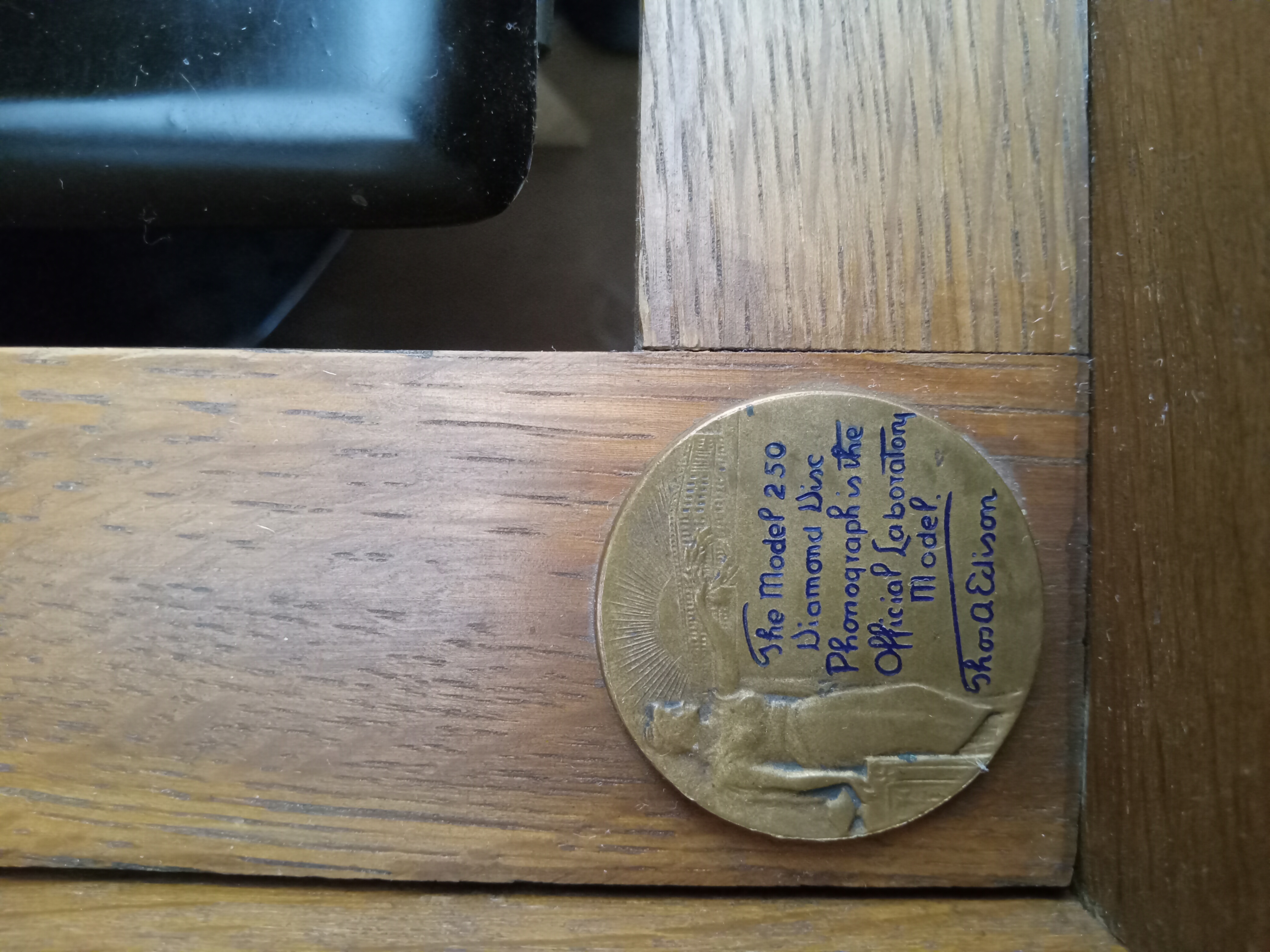 5. 5C - R-1 Round emblem stating: “The Model 250 Diamond Disc Phonograph is the Official Laboratory Model Thos A Edison”
