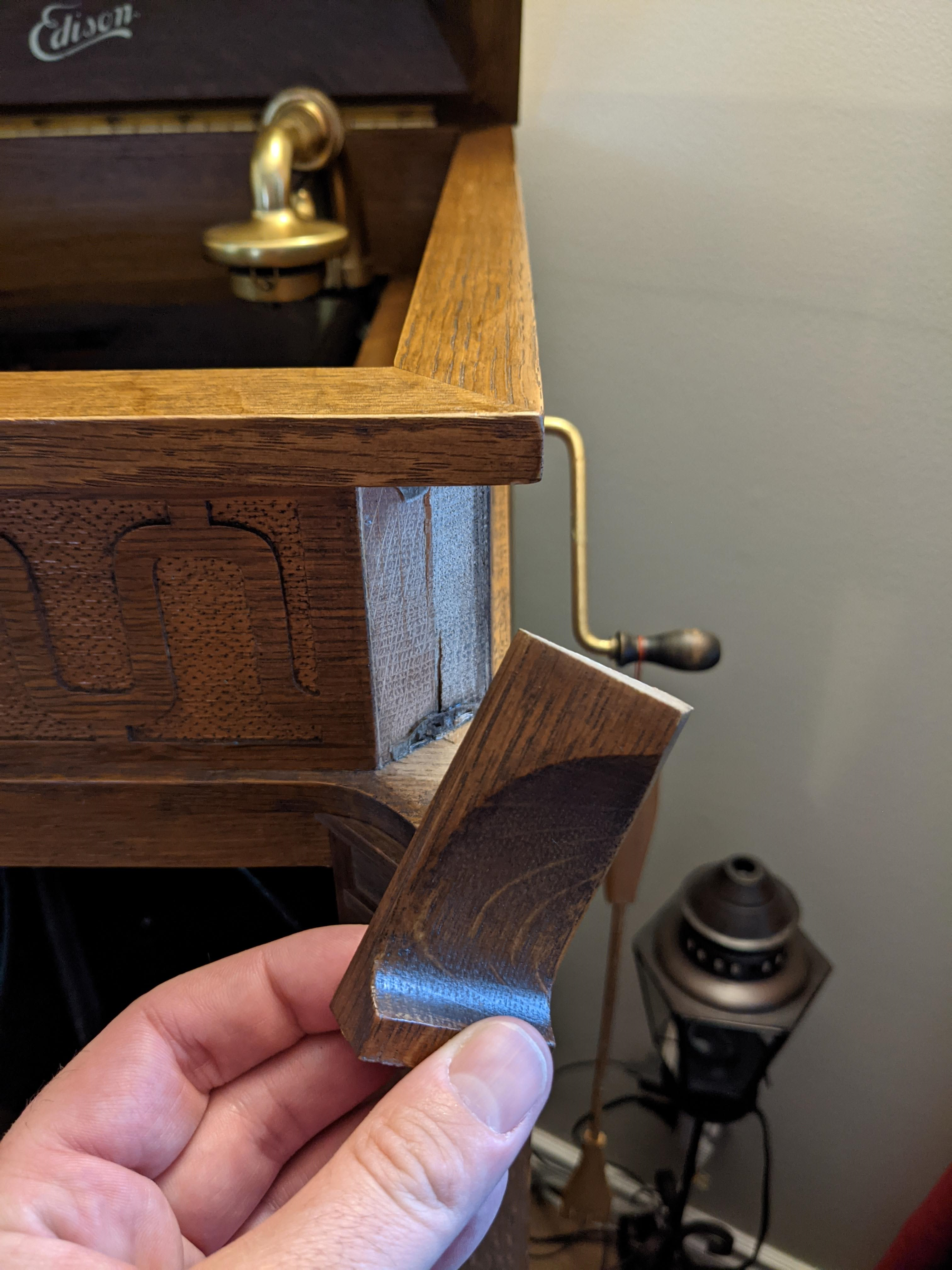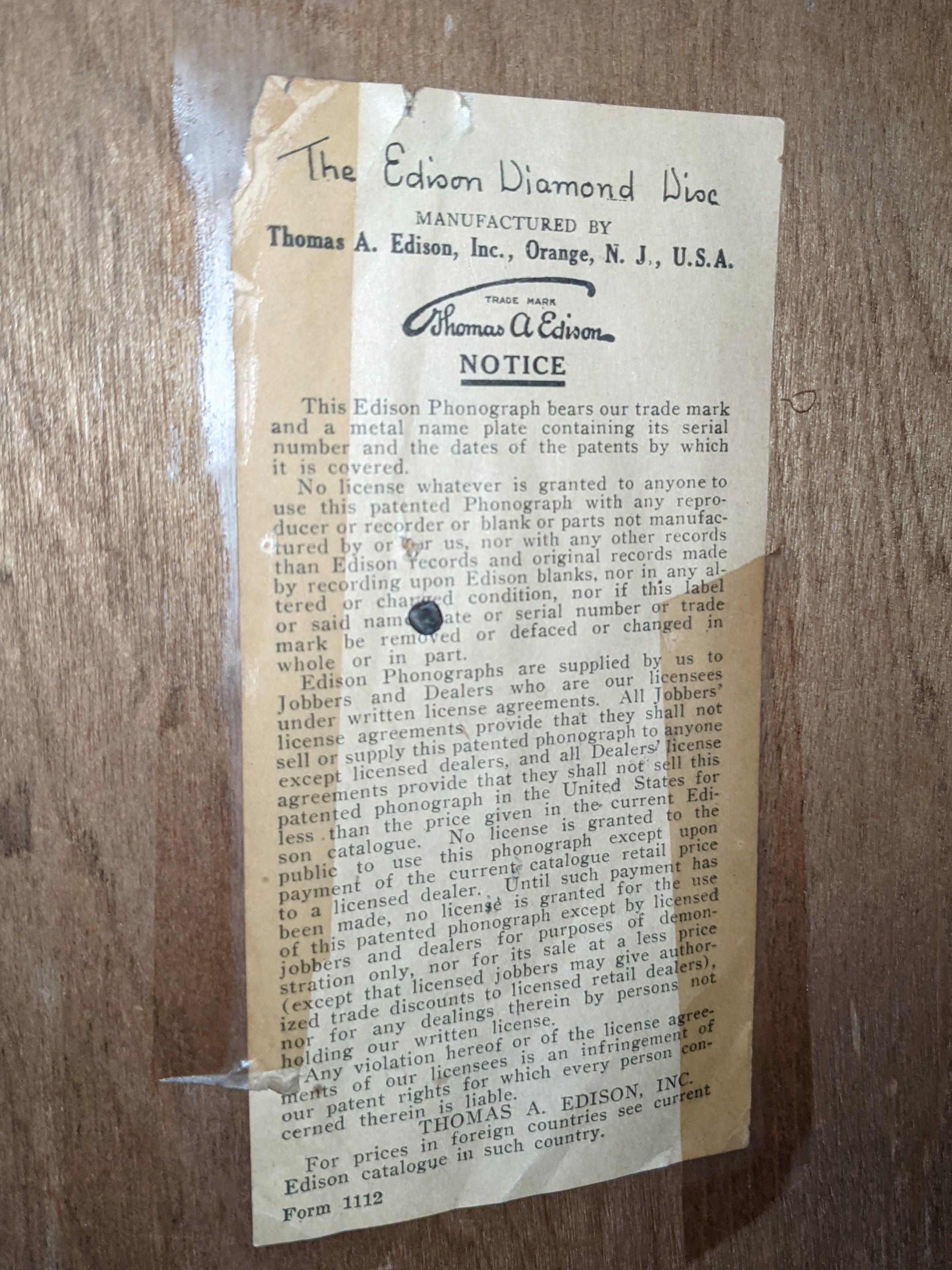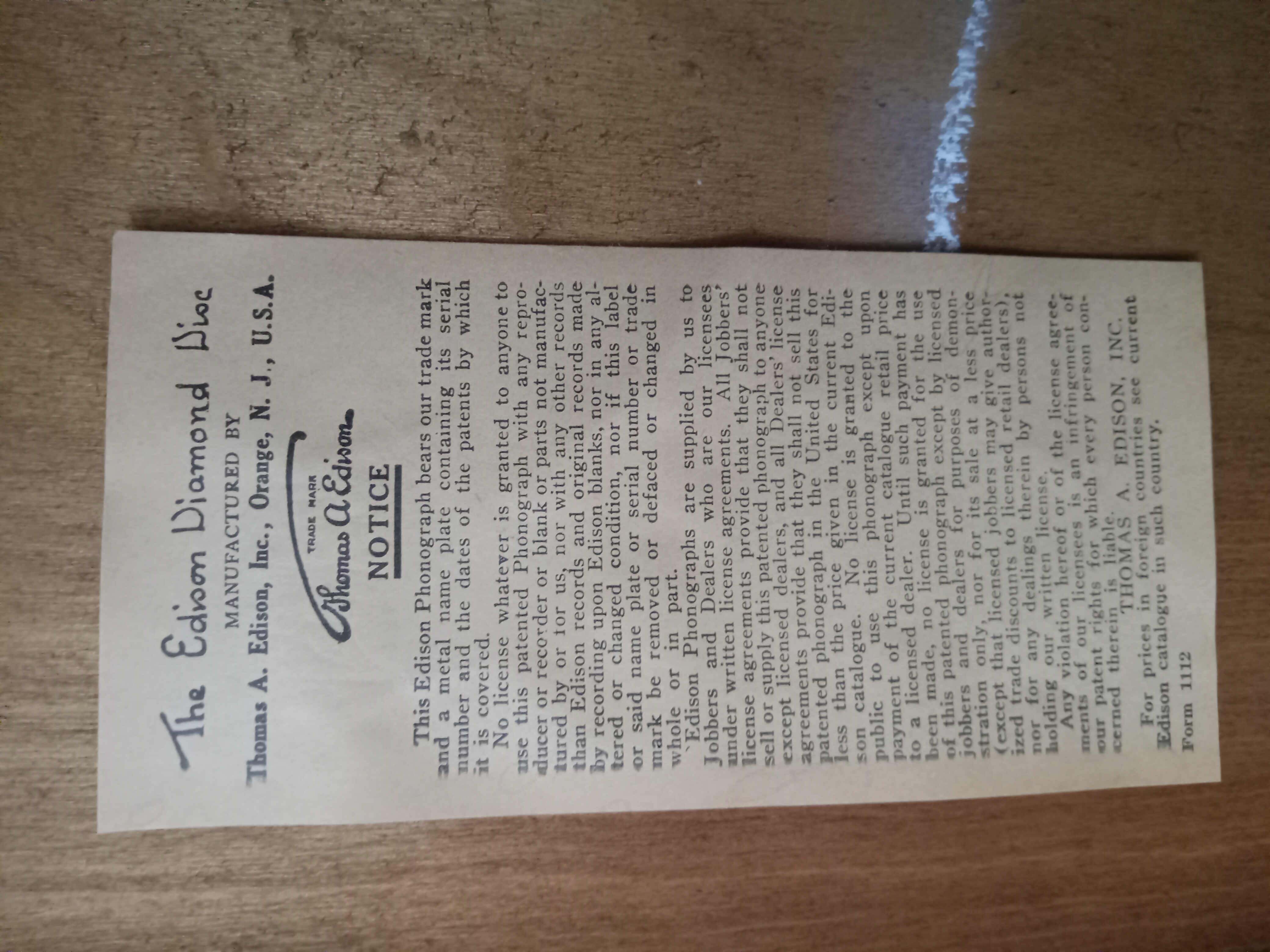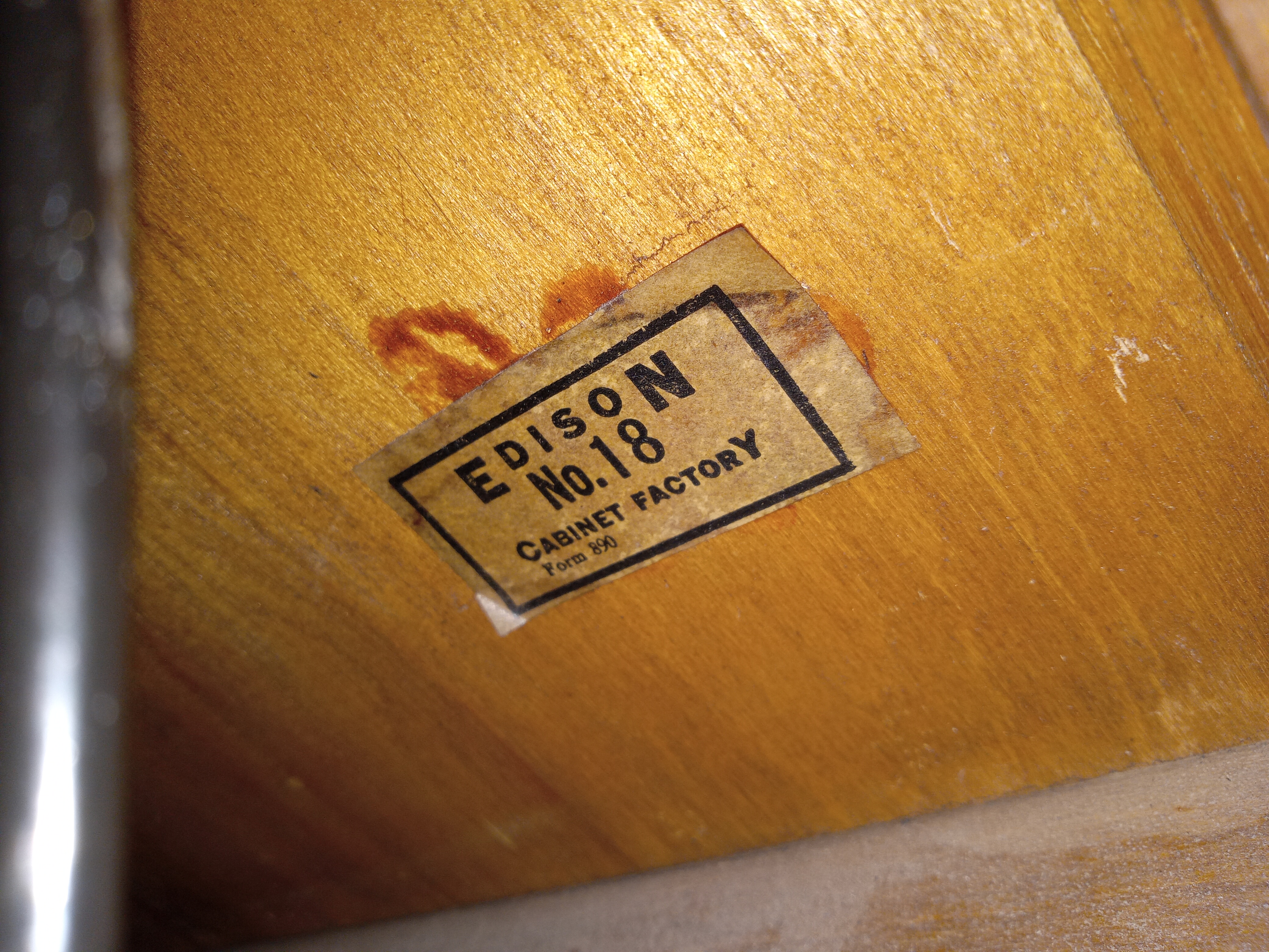 The Patent Protection notice would have been affixed to all Edison Diamond Disc Phonographs. Fortunately the cabinet glue issue you have doesn't seem to be very prevalent. That being said, I've encountered several Chippendales that have shown signs of deterioration, including an oak C 19 that I owned myself.