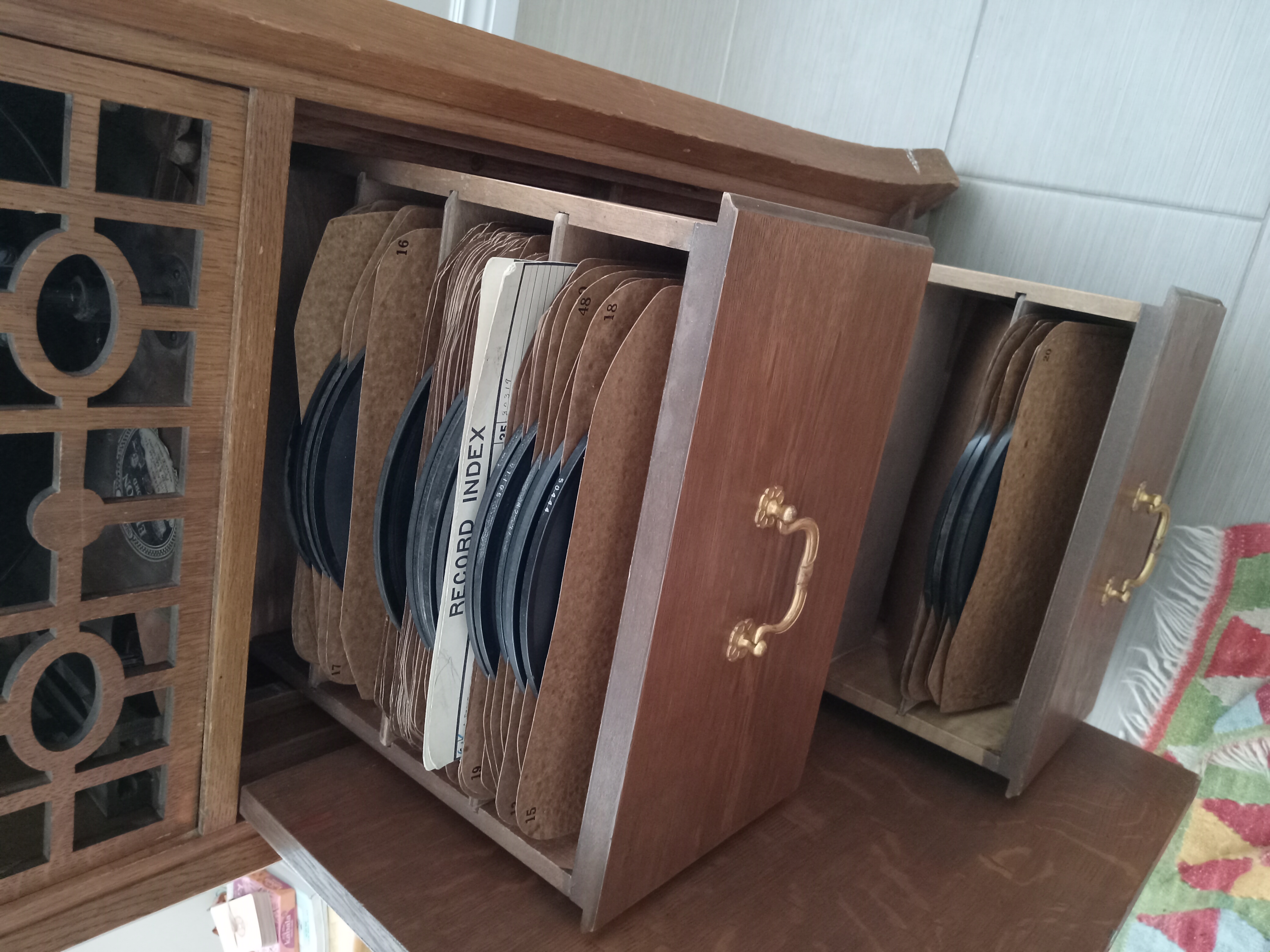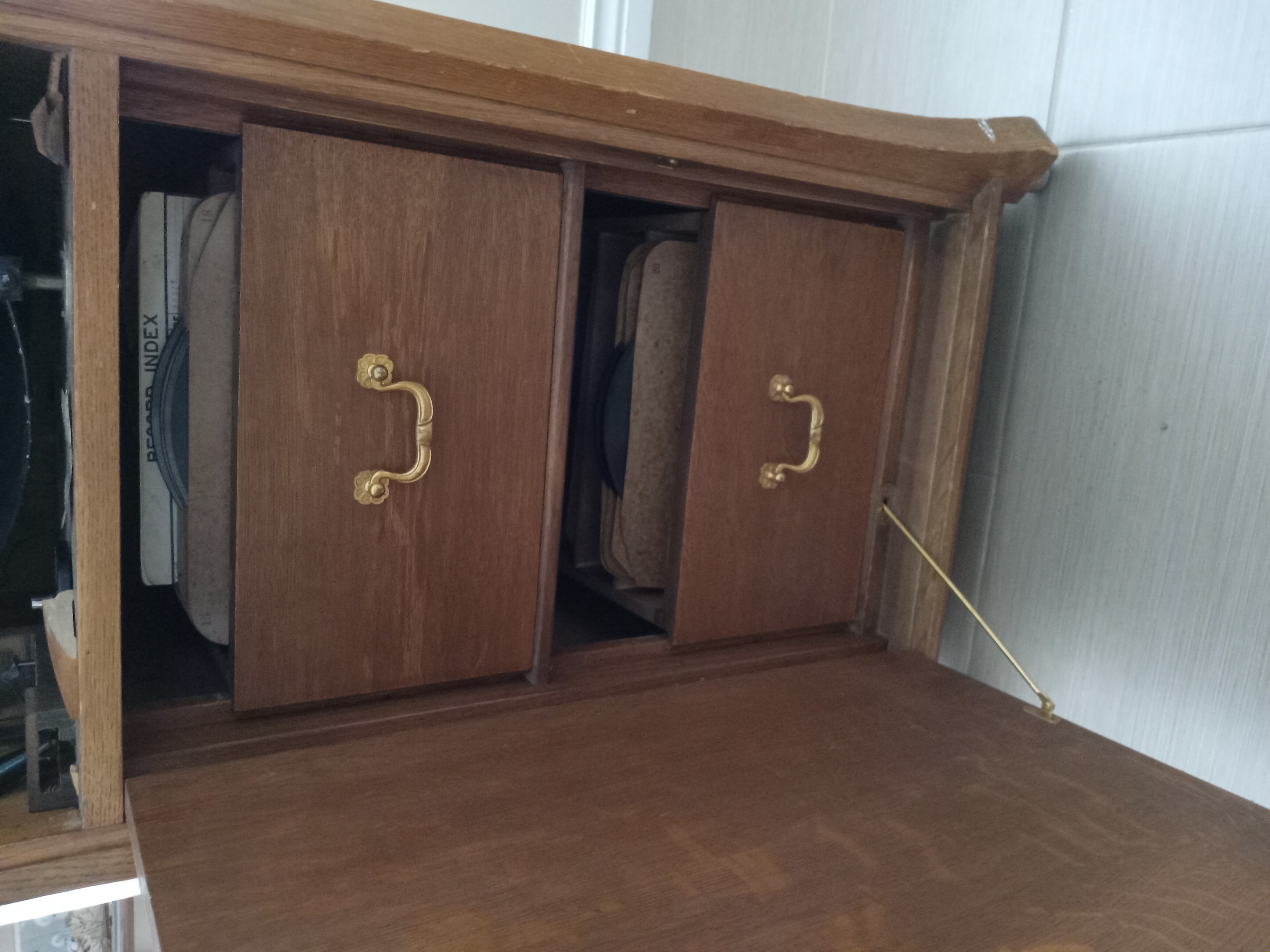12. Is the record storage door held open by a rod at the top, center, or the bottom of the cabinet door? Bottom