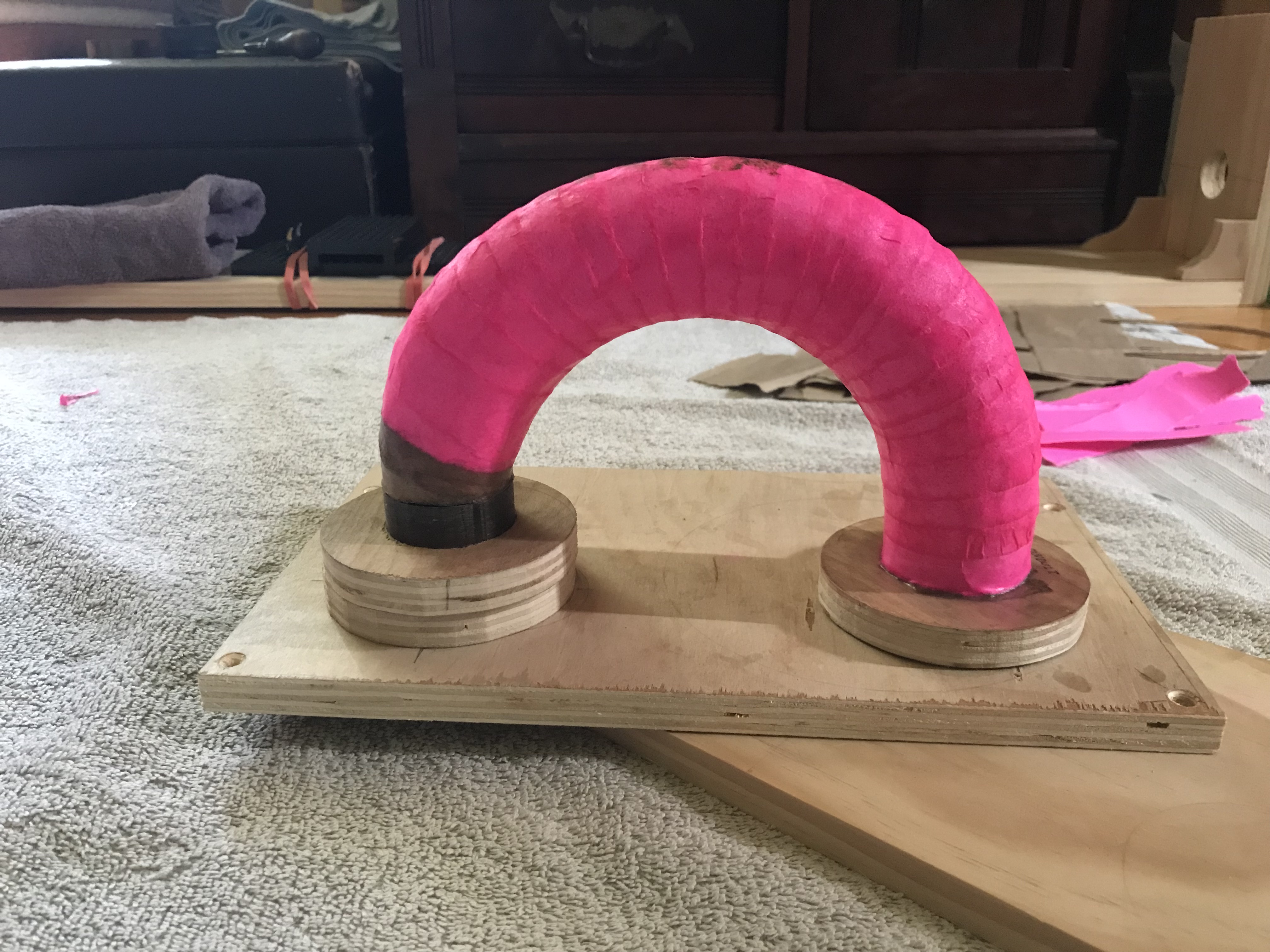 Since Wednesday, I’ve added just over two more layers of paper to the mouth, for a total of four and part of the fifth—my current plan is to stop at six layers, so it should be able to come off the former soon—and I installed the wood mounting ring.