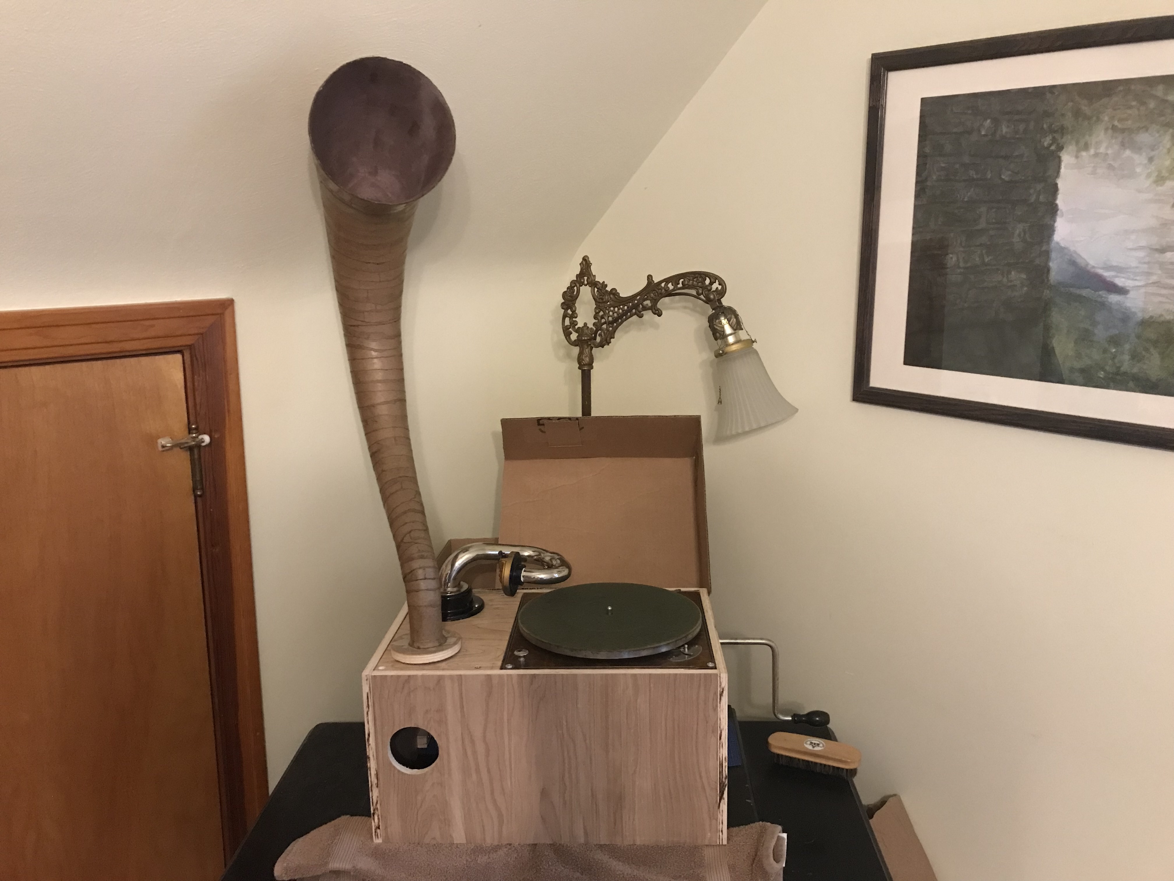 A decorative marbled paper is a good idea—when I began the project, I wasn’t at all sure that it would turn out well enough to warrant a decorative finishing paper, but based on how just the half-horn sounds, I think it will…When I tested it Wednesday, I used my not-as-good Orthophonic soundbox, but after taking my better soundbox from the Alhambra and putting it on the homemade gramophone, the sound quality is much better; the frequency response is less peaky and the “more open” quality is more noticeable—for records in good condition, I would say that it sounds better than the Alhambra at this point. Interestingly, worn records sound more worn with the half-horn than with the Alhambra, even with the same soundbox and type of needle—Perhaps the narrower frequency response of the latter filters out more of a worn record’s surface noise and high-frequency distortion?